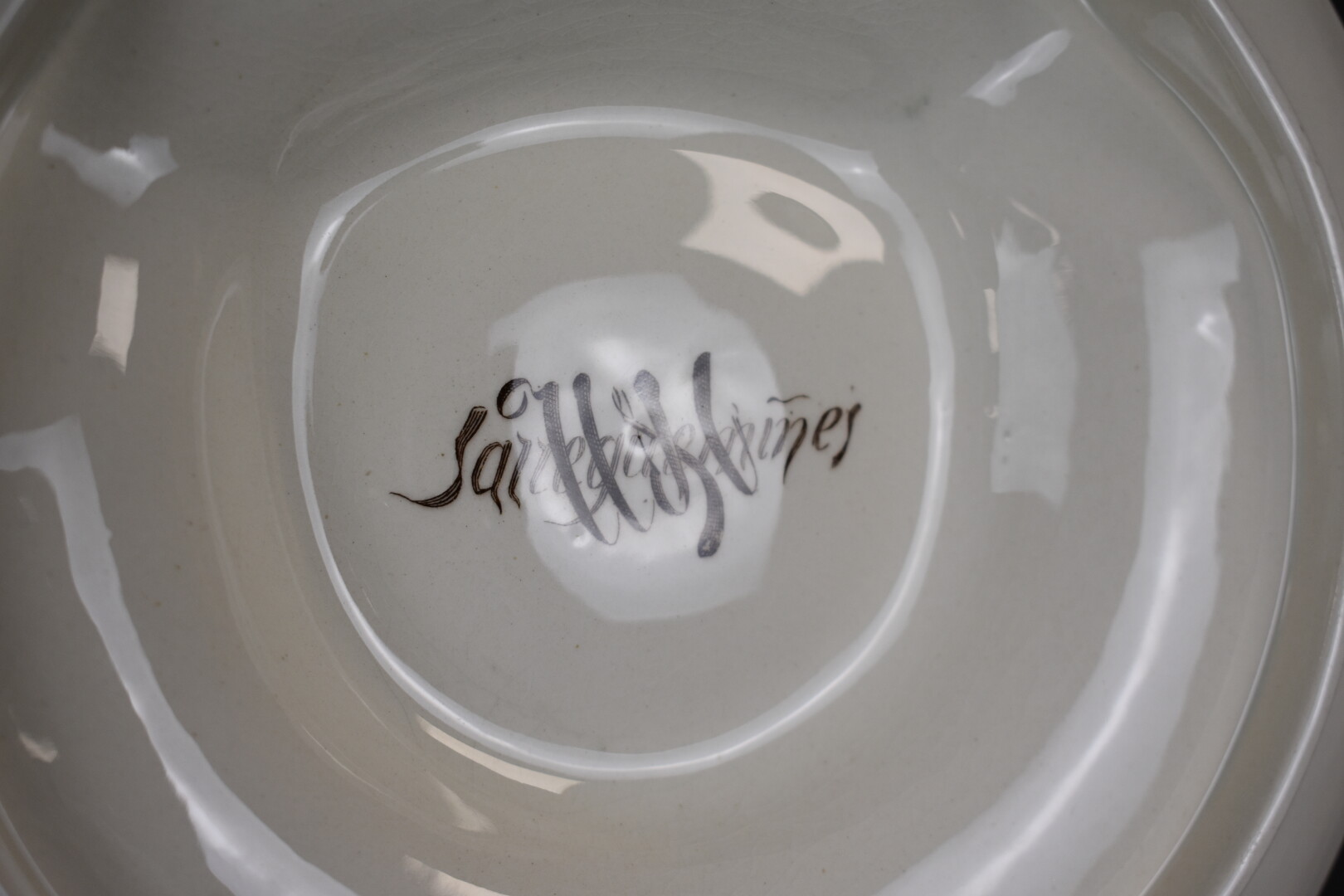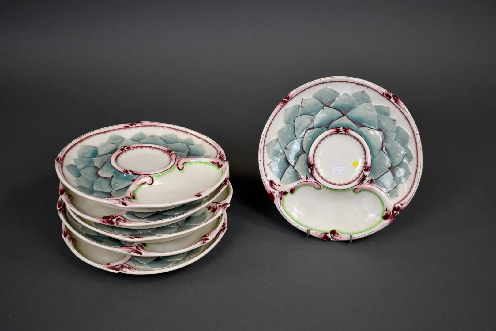 SARREGUEMINES UTZSCHNEIDER. Suite de 6 assiettes à artichaud en faïence à décor en polychromie. Marqués sous le fond. Vers 1900. Diam. : 23 cm.