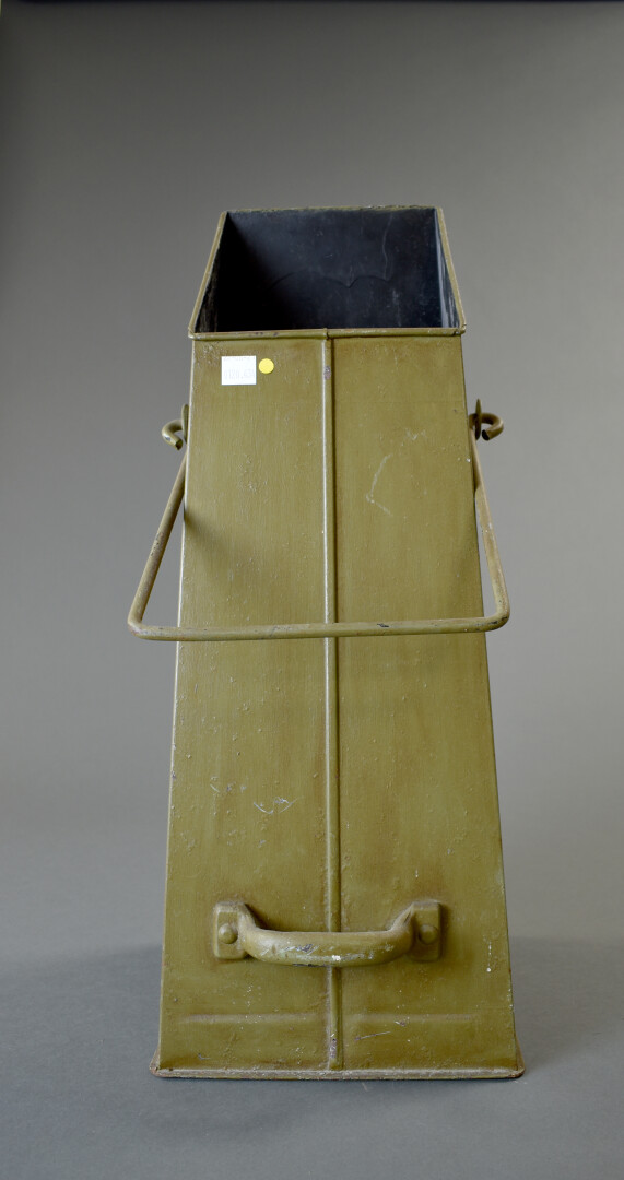 Sceau à charbon en tôle peinte de fleurs sur fond kaki. Haut. : 54 cm.