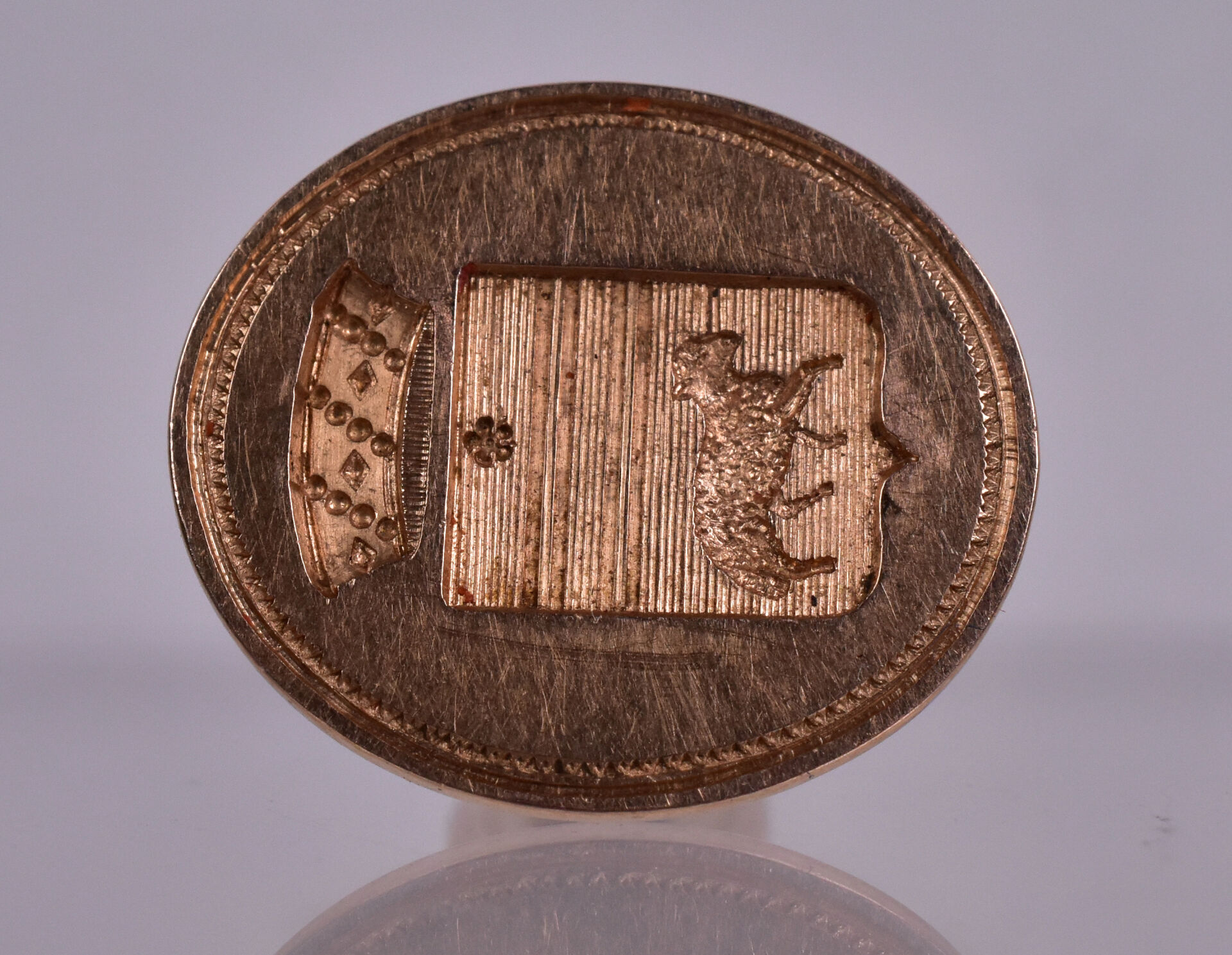 Sceau en or 18K 750/1000e à décor d’un blason à l’agneau surmonté d’une couronne de baron. Poids. : 10 g. Haut. : 2,7cm.