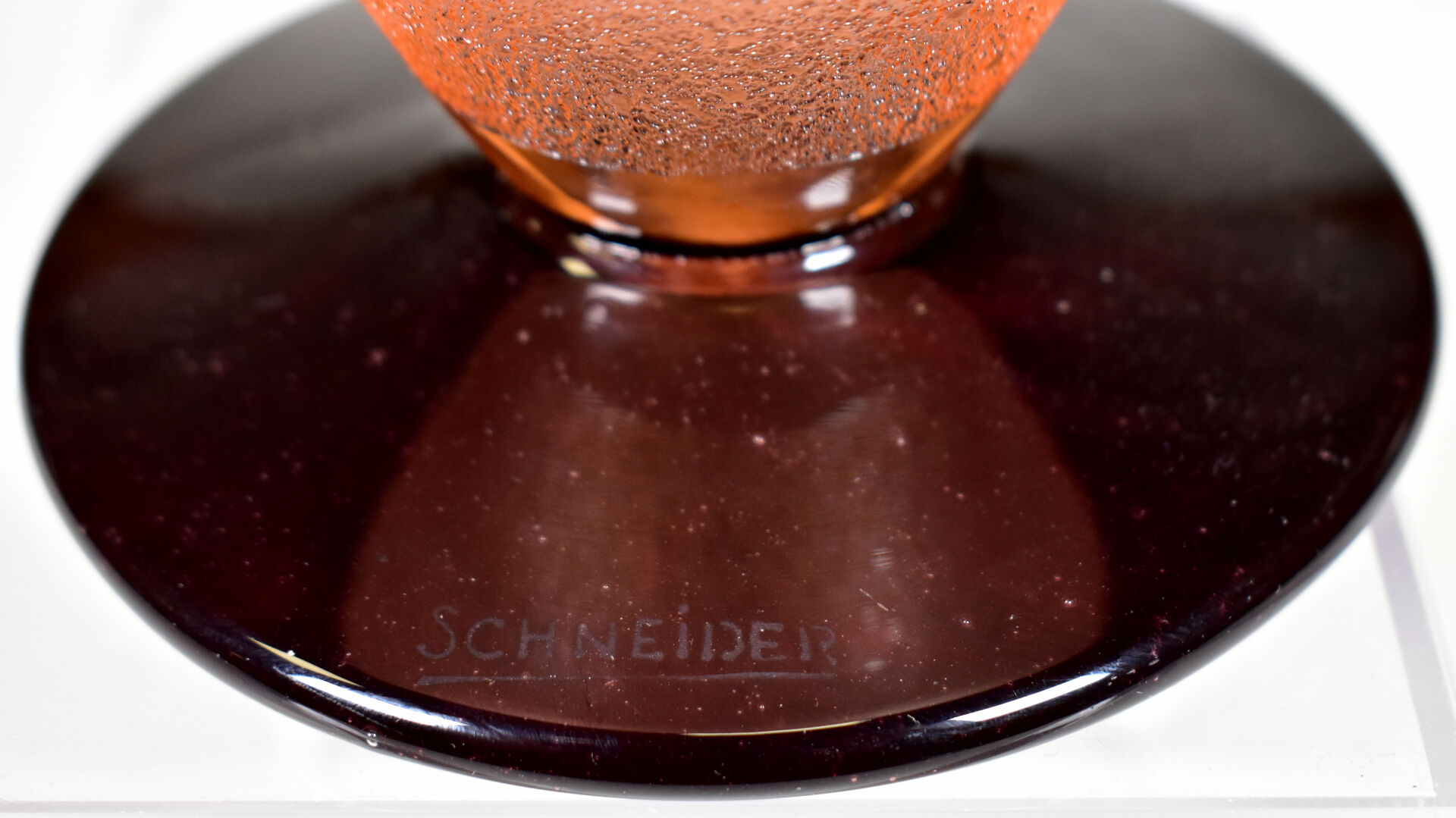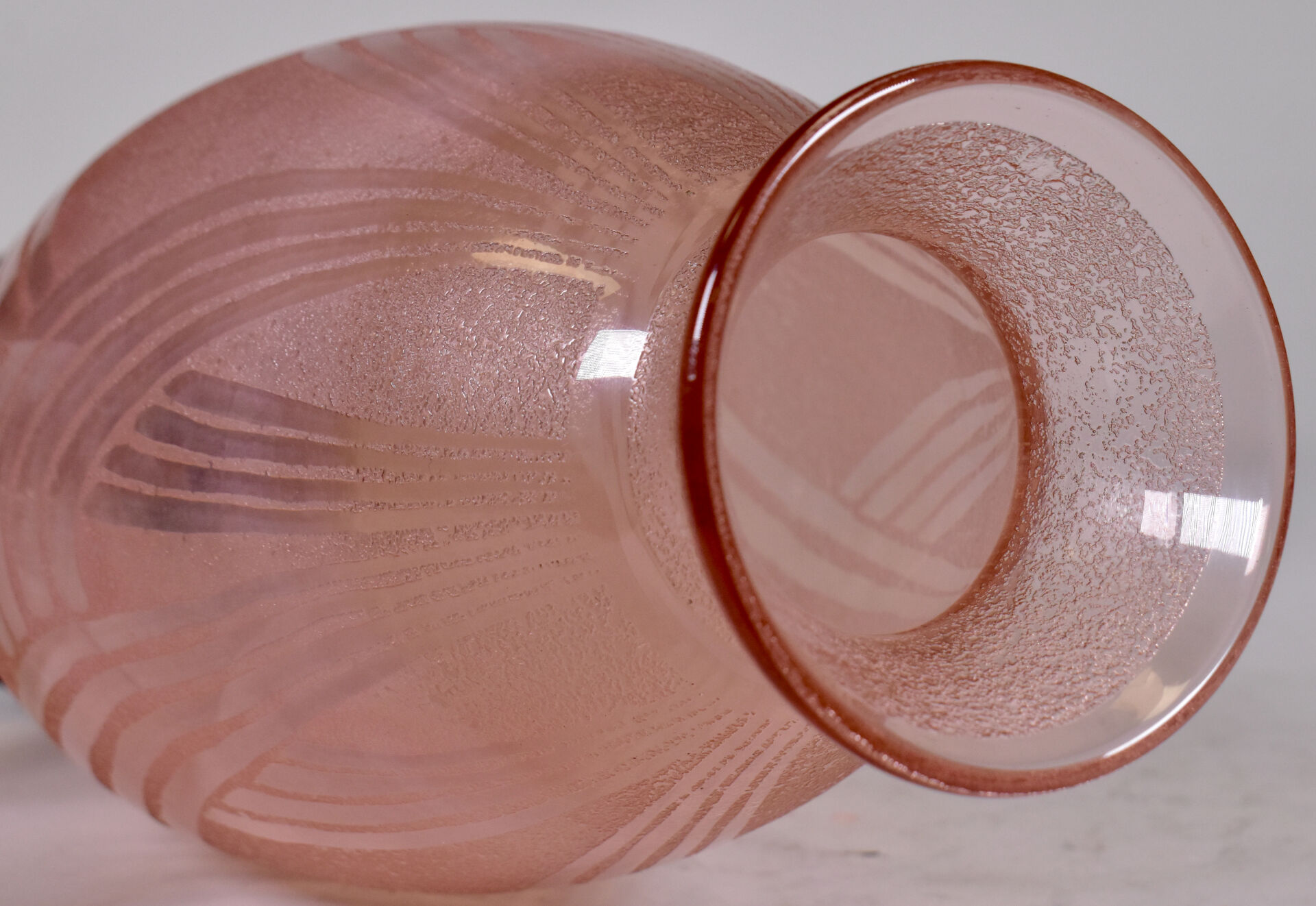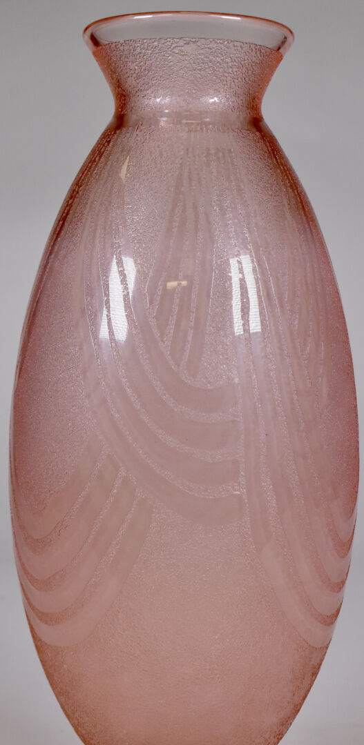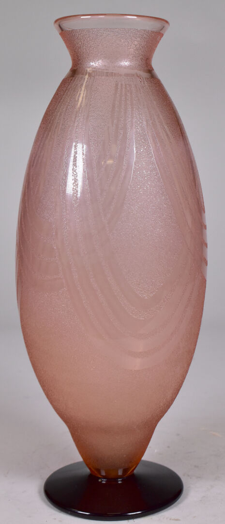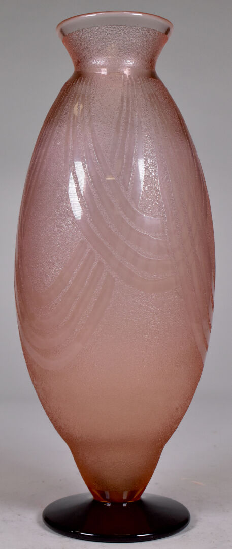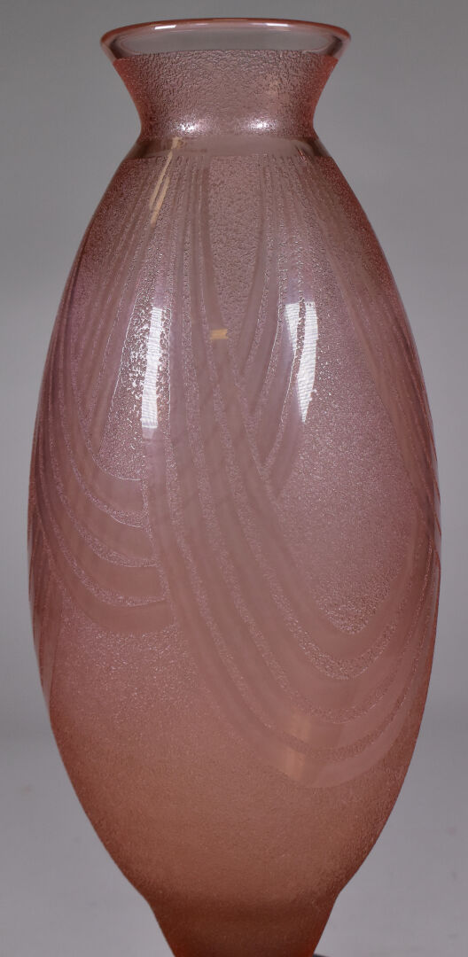 SCHNEIDER. Vase sur piédouche en verre rose dépoli à décor dégagé à l’acide de drapé. Signé à la base. Epoque Art Déco. Haut. : 35 cm.