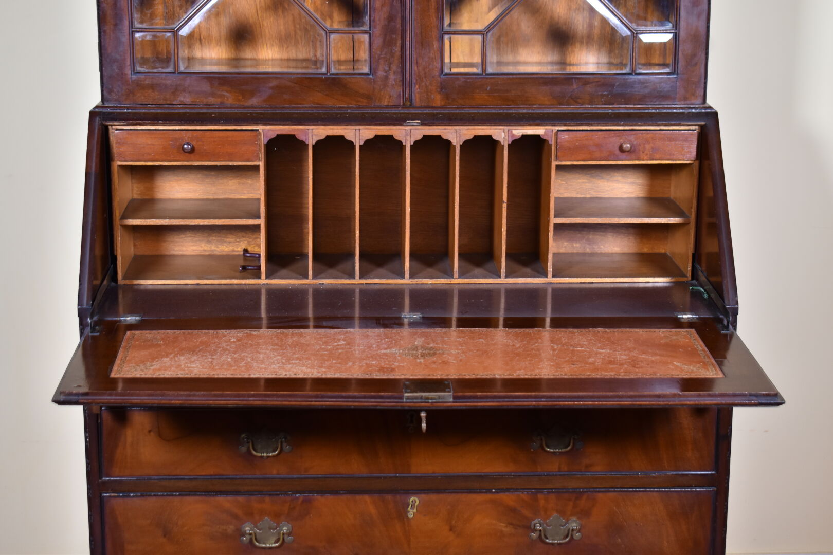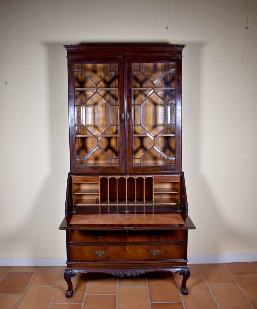 Scriban anglais en acajou et placage d’acajou, le fond en satiné. Il ouvre à deux portes vitrées en partie haute, un abattant et quatre tiroirs sur trois rangs. Pieds cambrés. Haut. : 225 cm – Larg. : 113 cm – Prof. : 87 cm (ouvert).