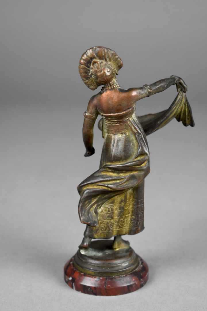 Sculpture en régule patiné bronze représentant une danseuse dans le goût exotique (traces de dorure). Socle de marbre griotte. Fin du XIXe siècle. Haut. : 16 cm.