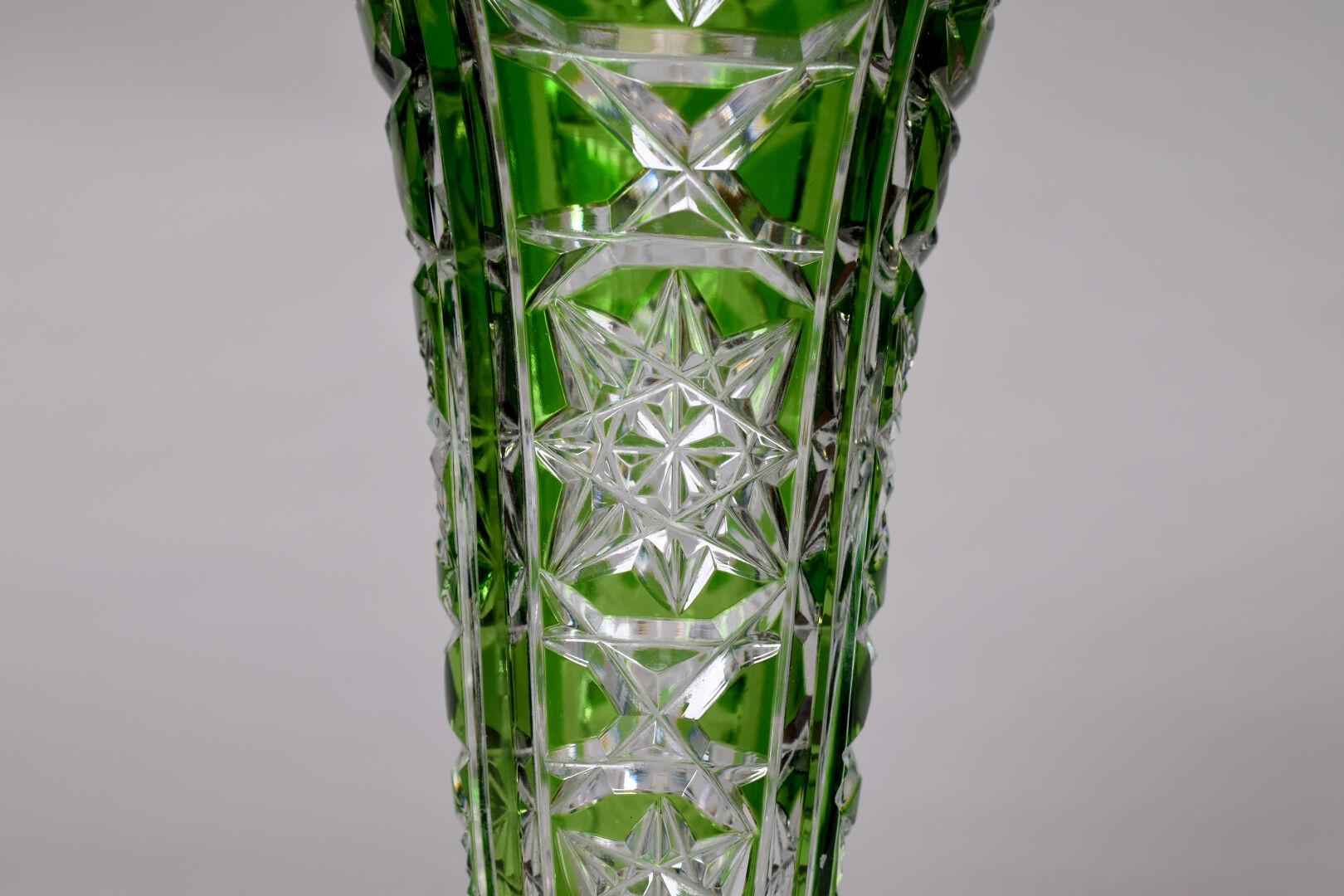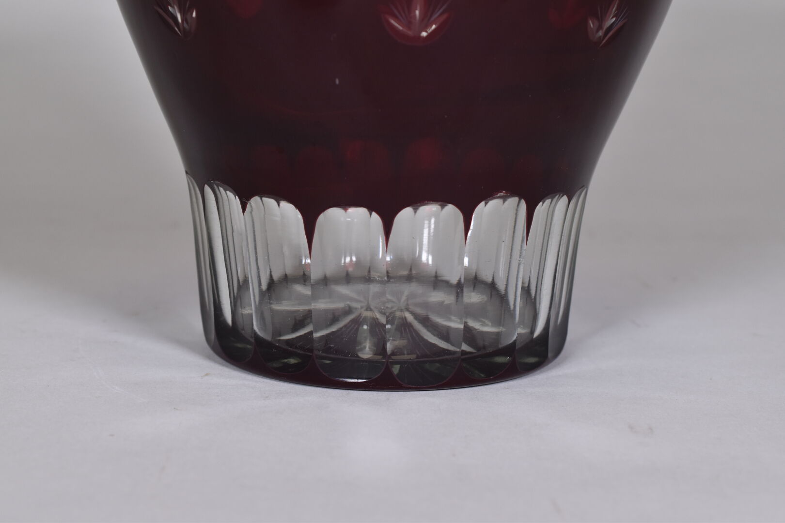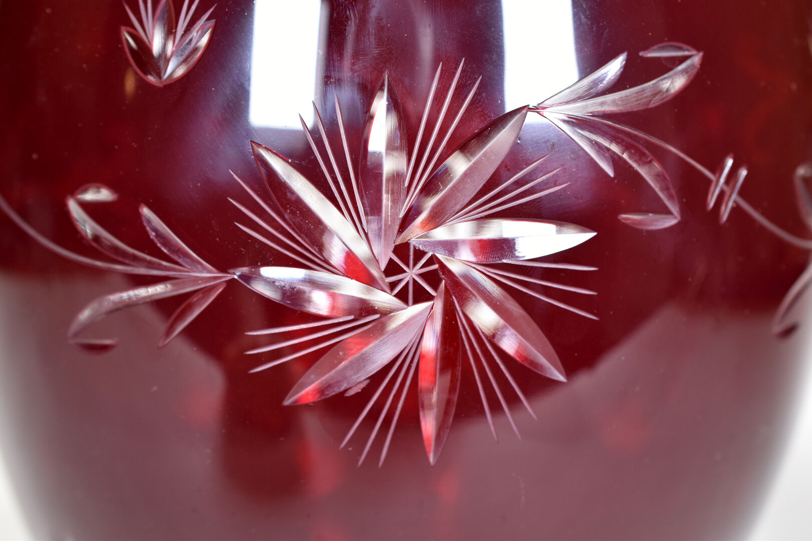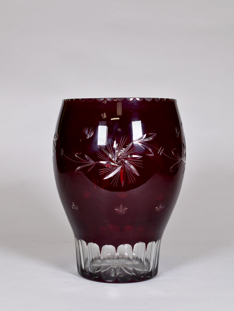 Seau à champagne ? en cristal à décor gravé de fleurs en overlay sur fond grenat (petits éclats, principalement au dessous). Haut. : 26,5 cm. On joint un vase cornet en cristal à décor gravé en overlay sur fond vert. Haut. : 25 cm.