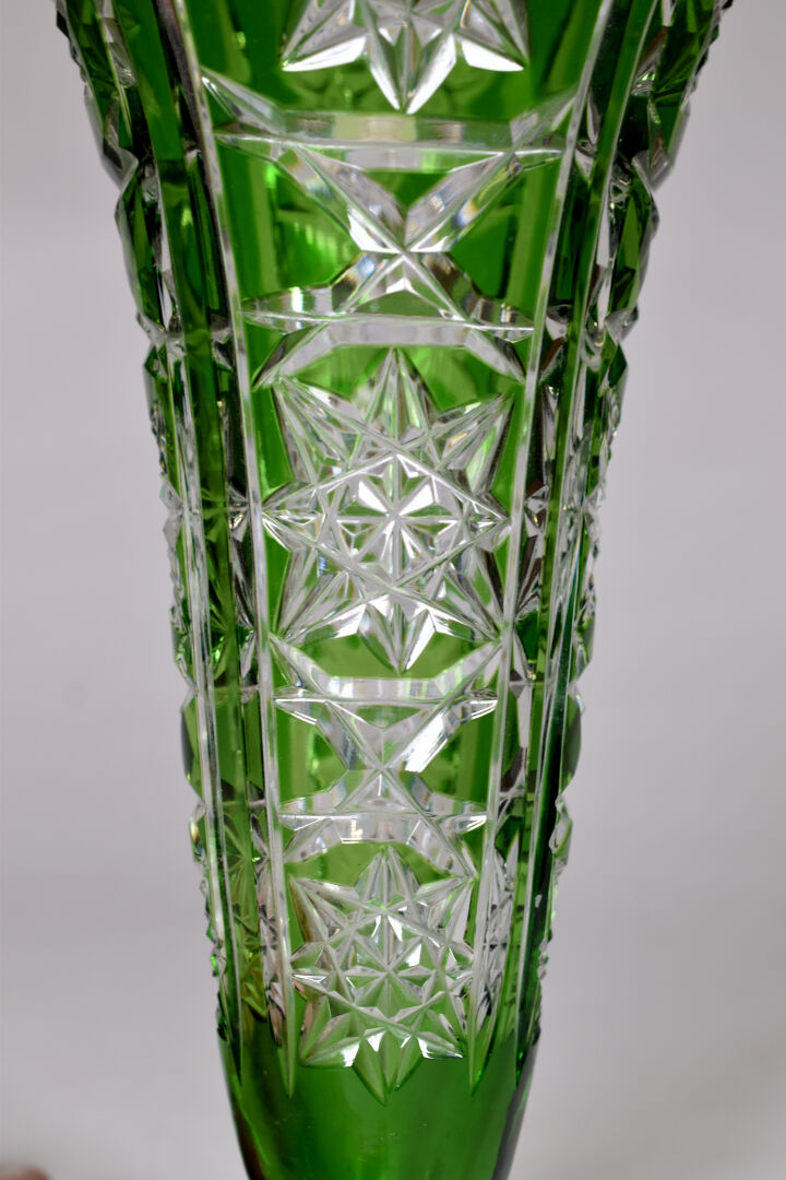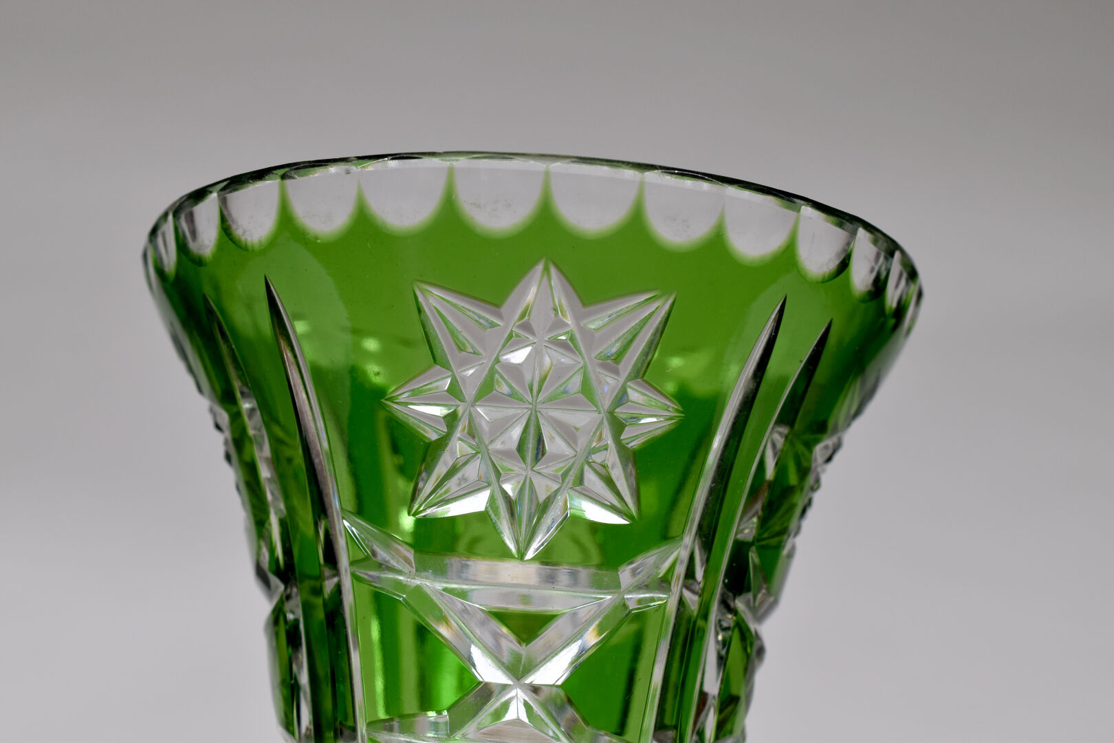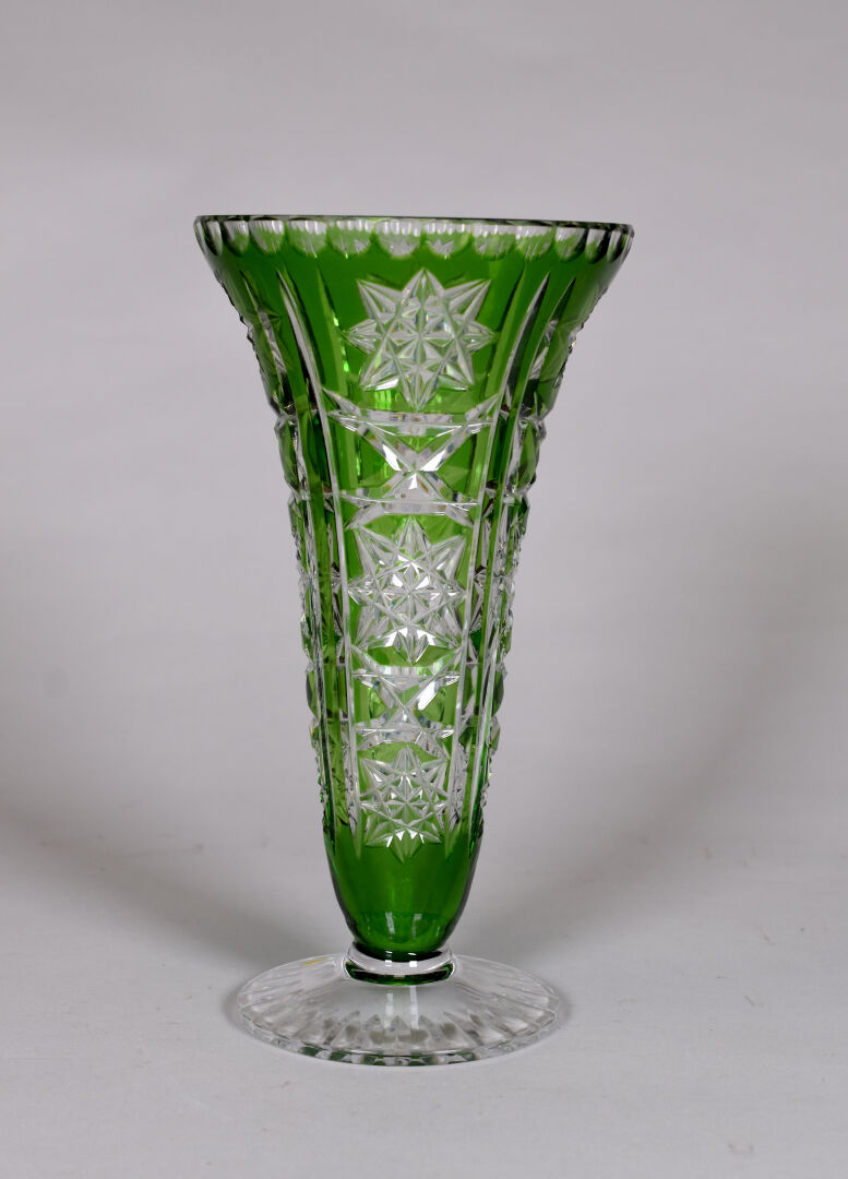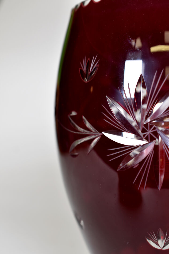 Seau à champagne ? en cristal à décor gravé de fleurs en overlay sur fond grenat (petits éclats, principalement au dessous). Haut. : 26,5 cm. On joint un vase cornet en cristal à décor gravé en overlay sur fond vert. Haut. : 25 cm.