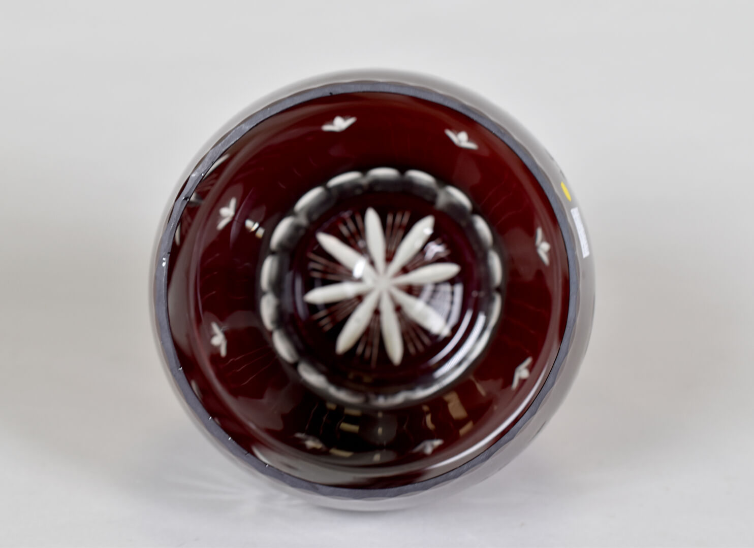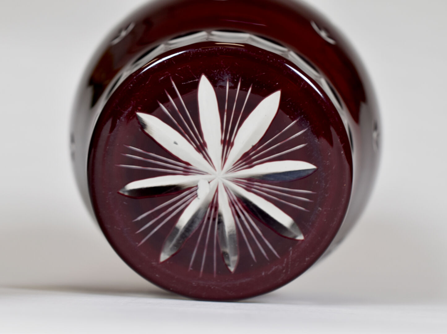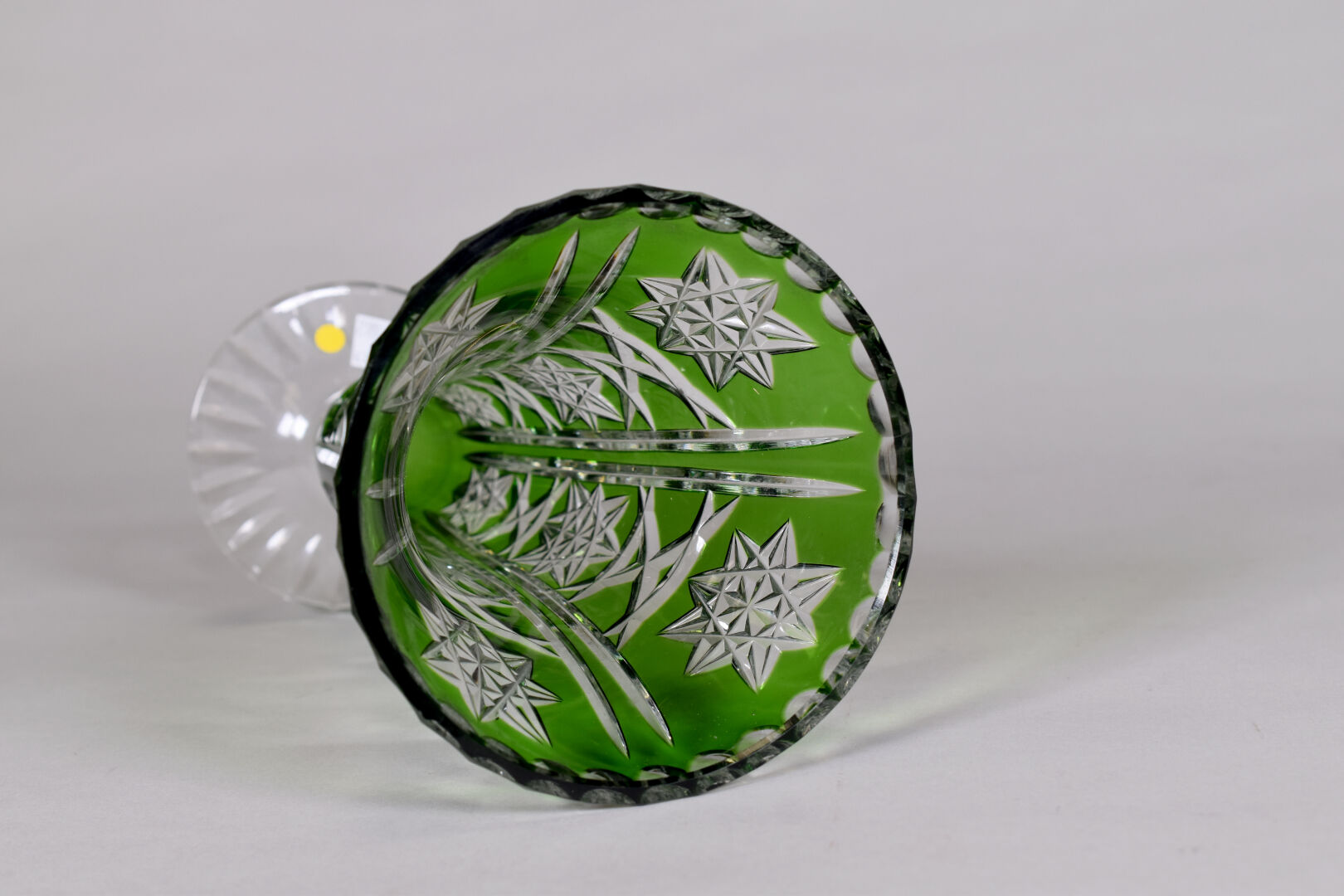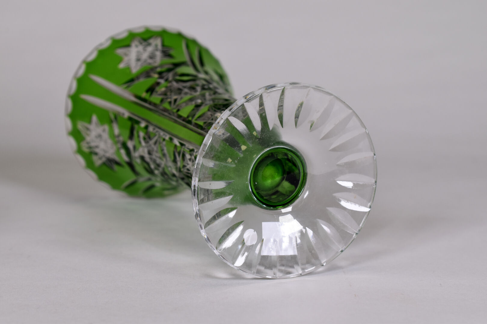 Seau à champagne ? en cristal à décor gravé de fleurs en overlay sur fond grenat (petits éclats, principalement au dessous). Haut. : 26,5 cm. On joint un vase cornet en cristal à décor gravé en overlay sur fond vert. Haut. : 25 cm.