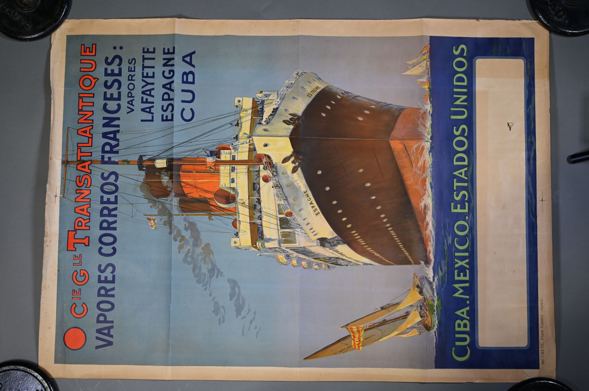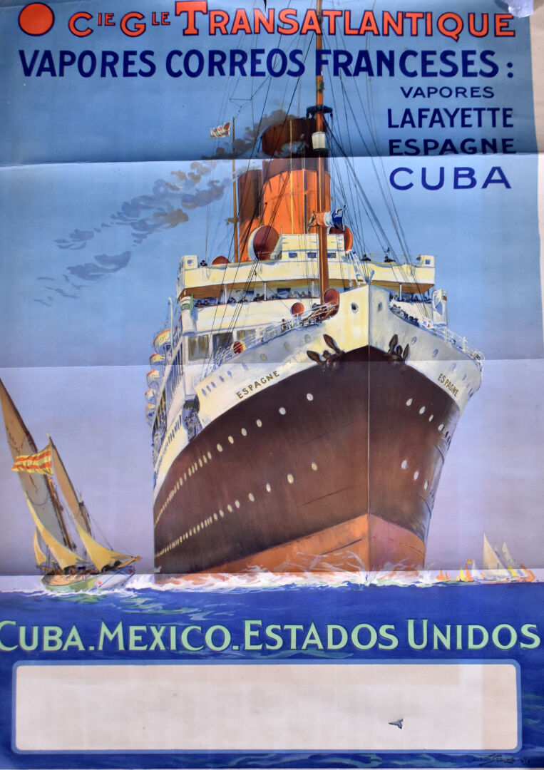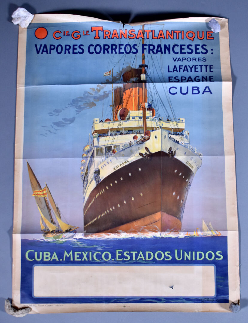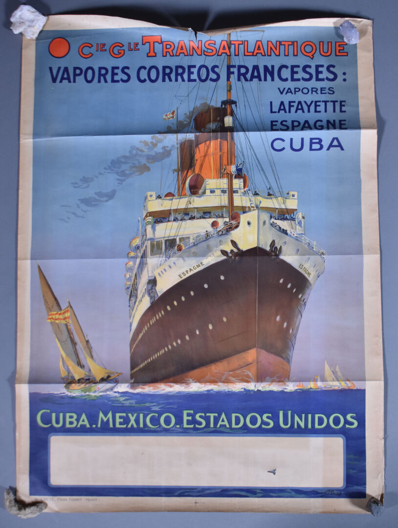 SEBILLE Albert. Cie Gle Transatlantique. Vapores Correos Franceses. Lafayette. Espagne. Cuba. Mexico. Estados Unidos. 1920. Affiche lithographique. Imp. Crété – Corbeil. Non entoilée, bon état : Petites déchirures dans les marges dont une déchirure plus importante le long de la bordure supérieure (8 cm), petite déchirure sans manque dans le bandeau inférieur, papier légèrement jauni et légèrement insolé notamment le long de la bordure droite, couleurs vives et fraîches. 105 x 65 cm Bibliographie : Daniel Hillion. La Mer s’Affiche. Editions Ouest-France 1990. Pages 78 et 83.
