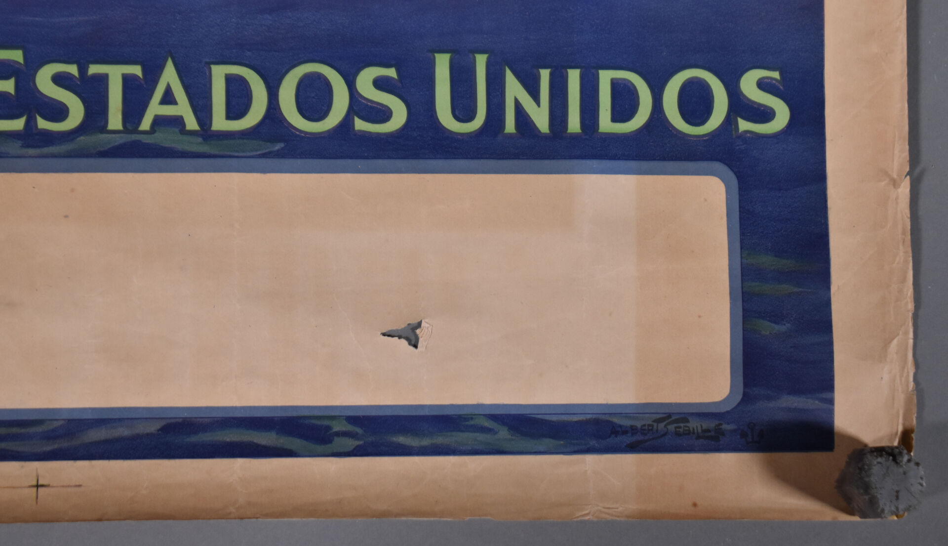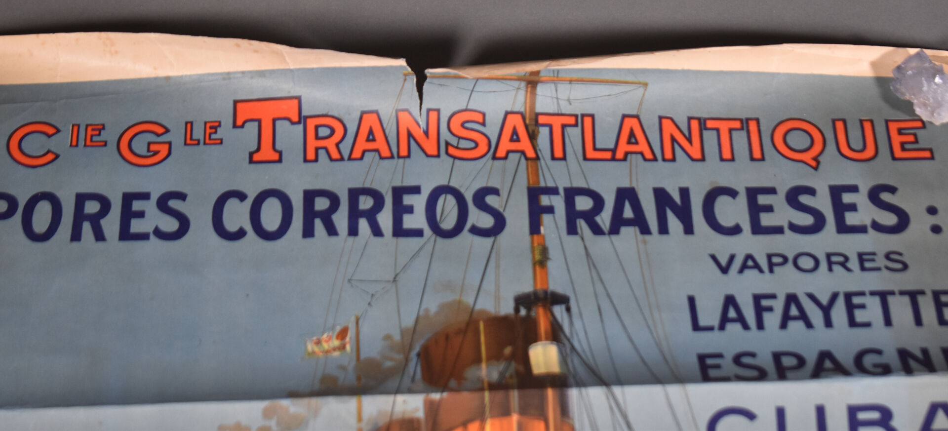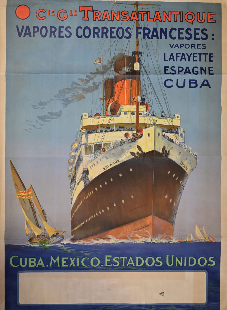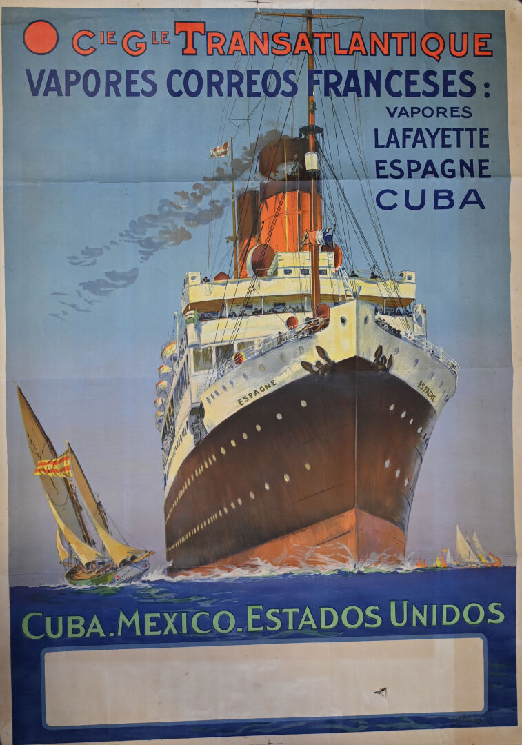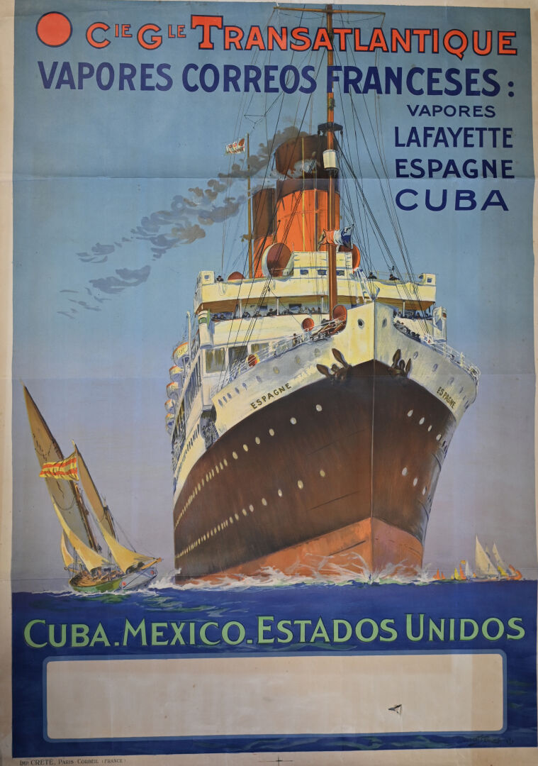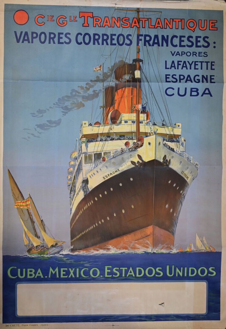 SEBILLE Albert. Cie Gle Transatlantique. Vapores Correos Franceses. Lafayette. Espagne. Cuba. Mexico. Estados Unidos. 1920. Affiche lithographique. Imp. Crété – Corbeil. Non entoilée, bon état : Petites déchirures dans les marges dont une déchirure plus importante le long de la bordure supérieure (8 cm), petite déchirure sans manque dans le bandeau inférieur, papier légèrement jauni et légèrement insolé notamment le long de la bordure droite, couleurs vives et fraîches. 105 x 65 cm