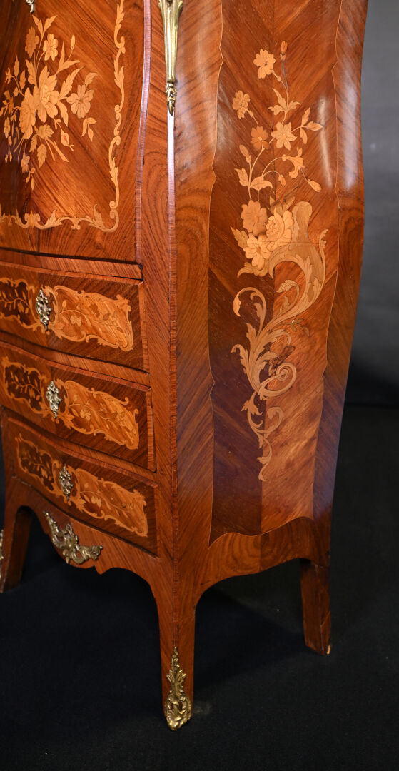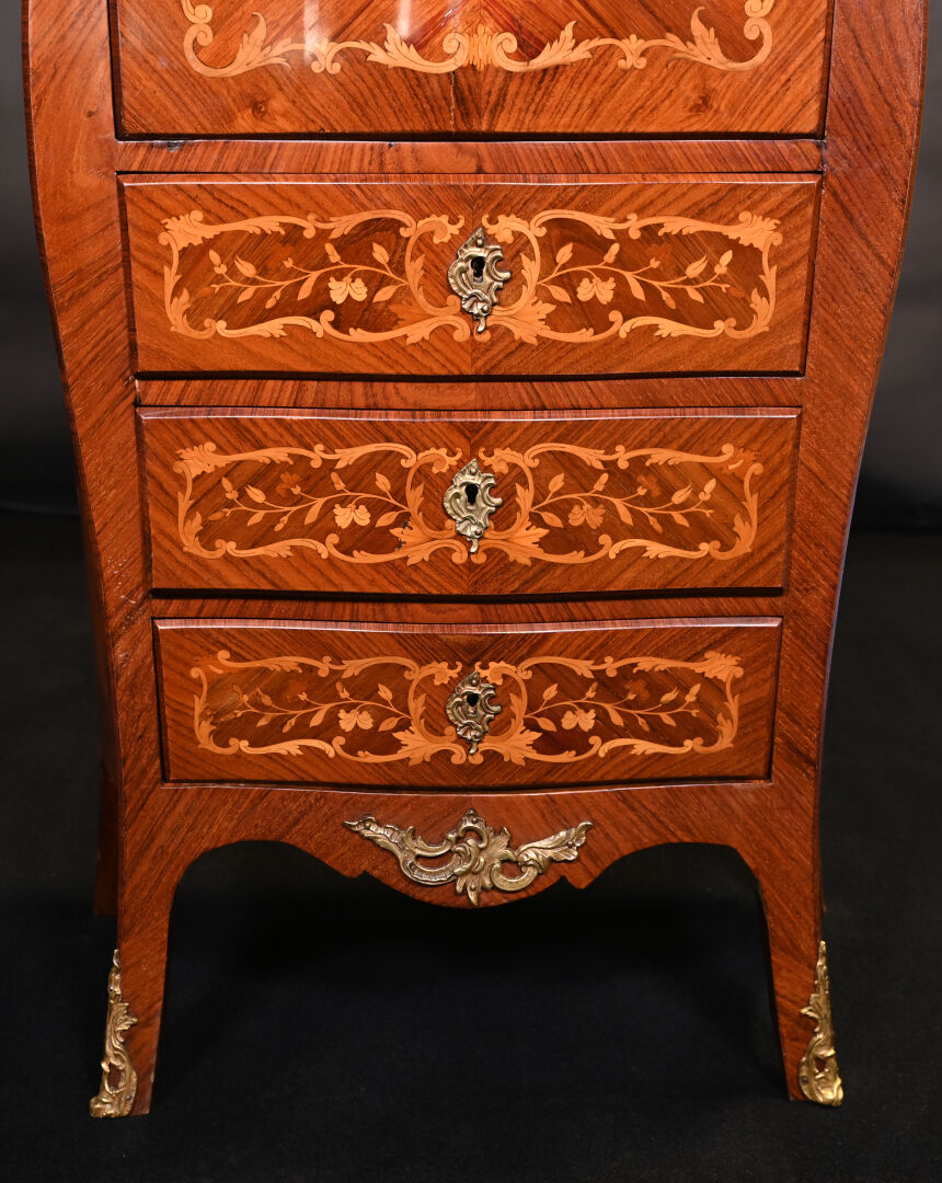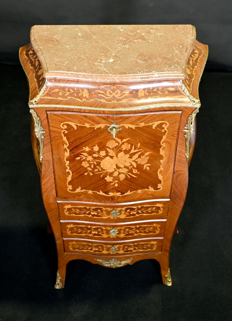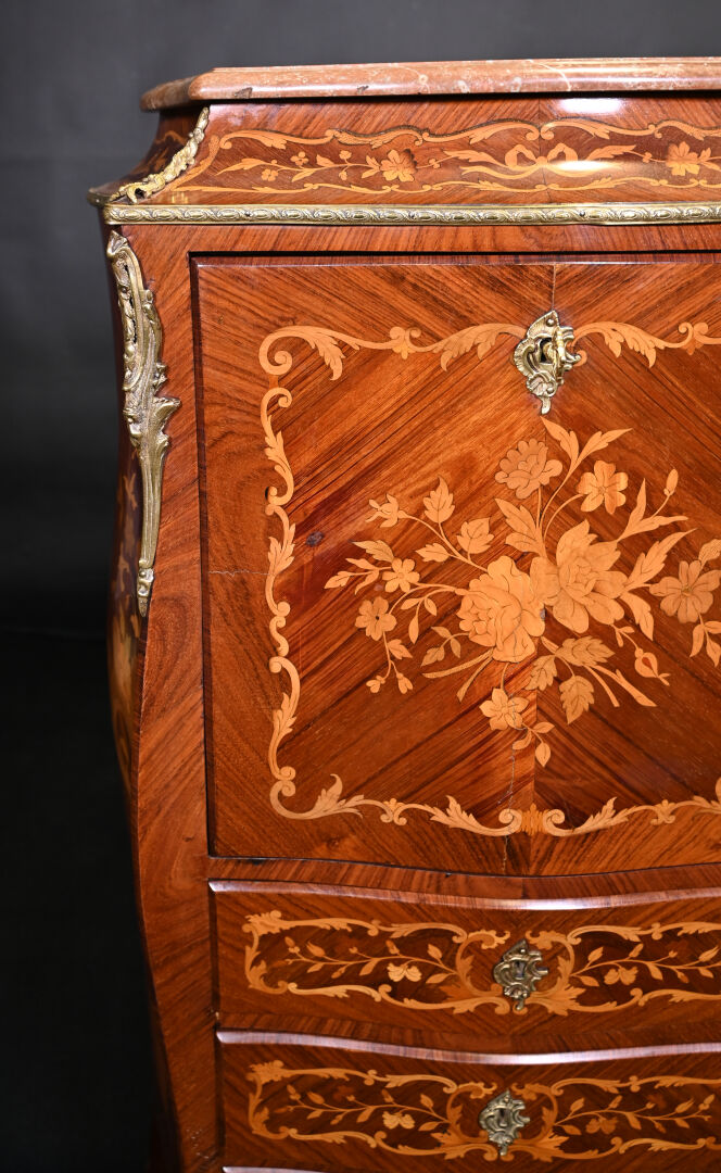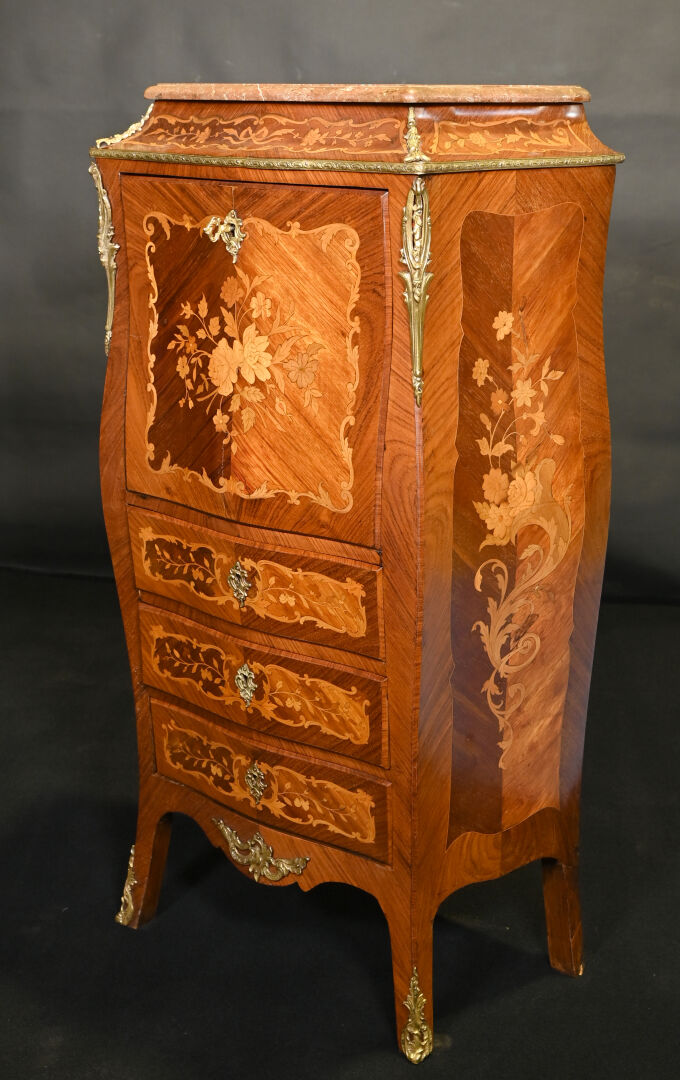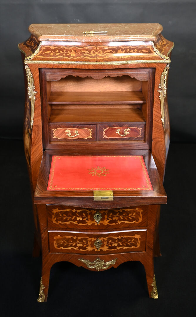 Secrétaire de dame en placage de bois de rose et bois blond. Il ouvre à un abattant découvrant niches et tiroirs en partie haute et 3 tiroirs en partie basse. Pieds cambrés. Plateau de marbre rouge. Décor marqueté de fleurs (fente). Style Louis XV, XXe siècle. Haut. : 127,5 cm – Large. : 70 cm – Prof. : 40 cm.