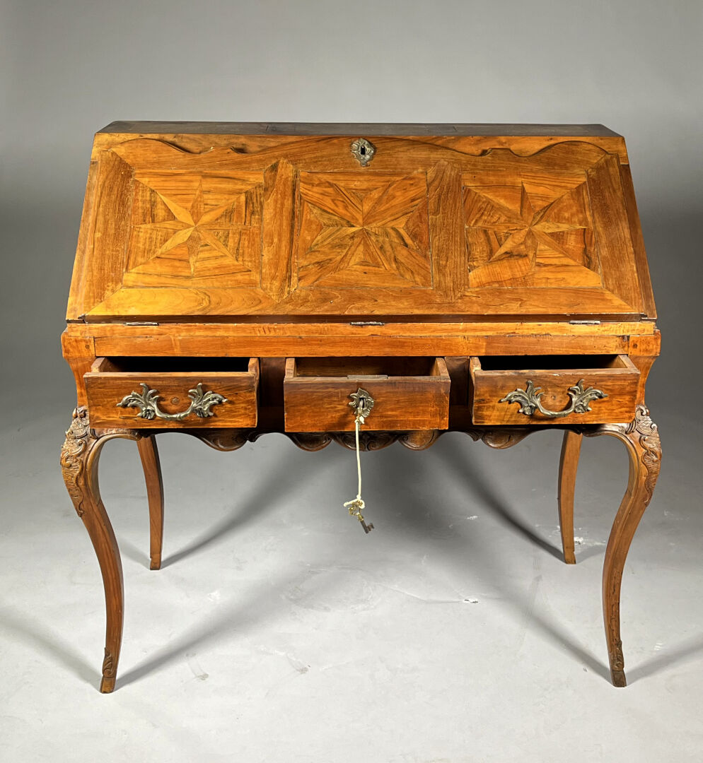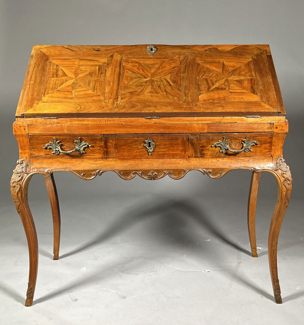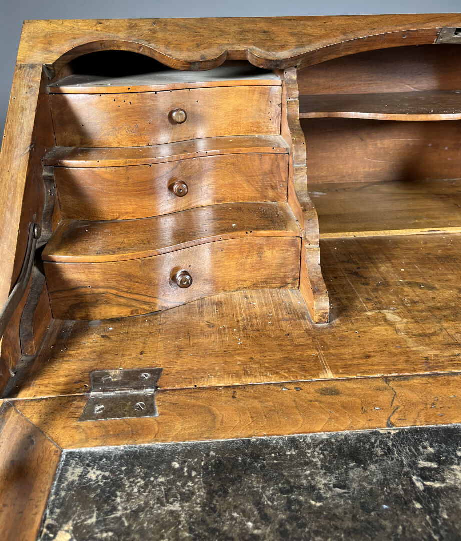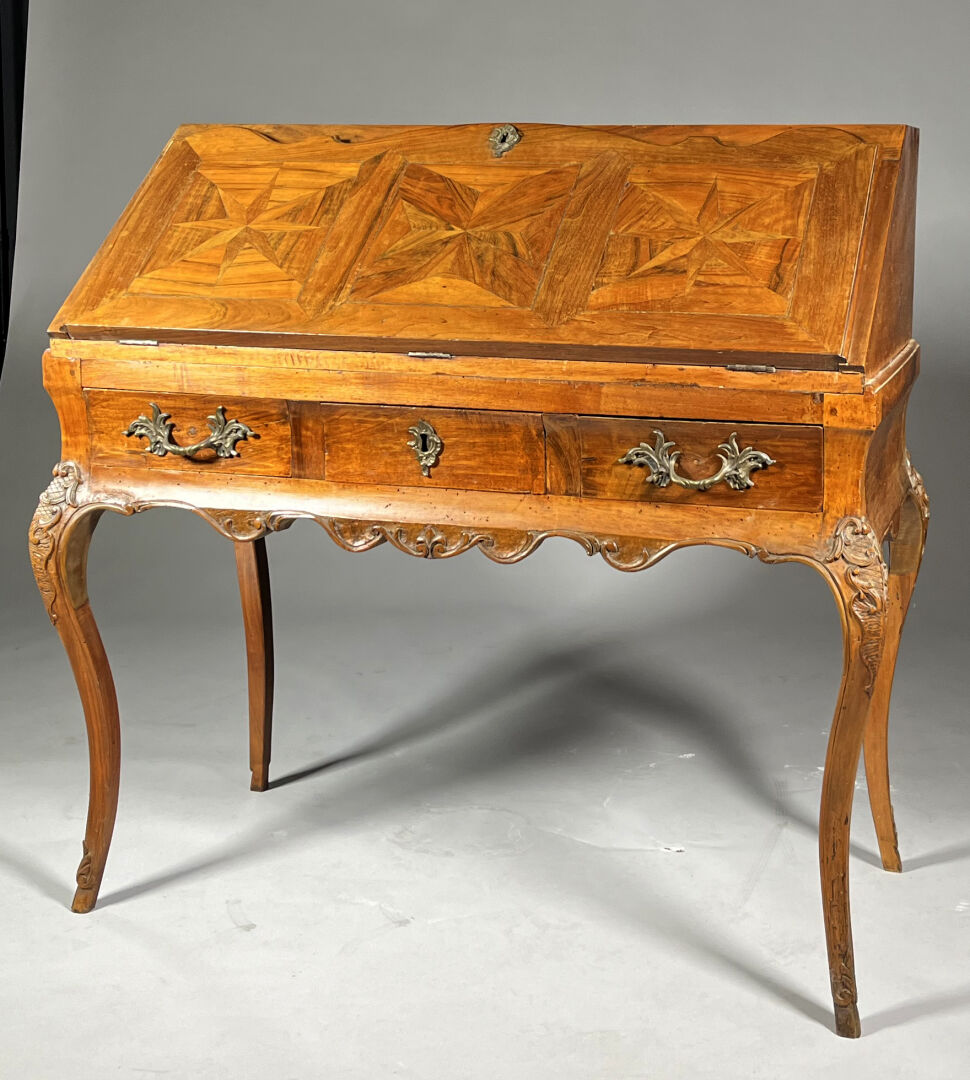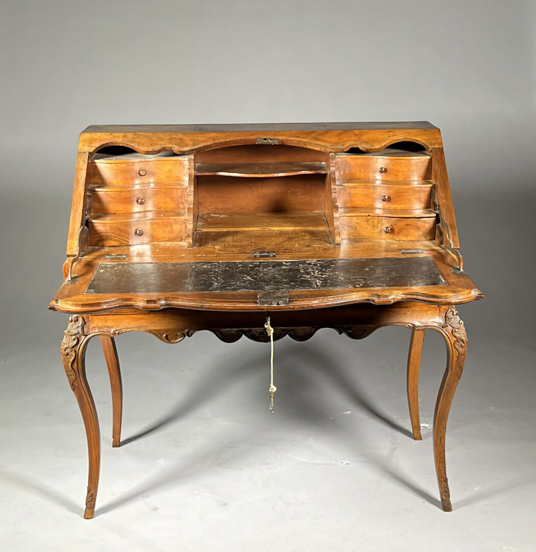 Secrétaire de pente en noyer (accidents et restaurations) mouluré et sculpté de coquilles, feuilles d’acanthe et rinceaux ouvrant par trois tiroirs en ceinture, l’abattant marqueté d’étoiles découvre six tiroirs et un casier. Il repose sur quatre pieds cambrés.Travail régional du milieu du XVIIIe siècle. Haut. : 103 cm – Larg. : 105 cm – Prof. : 54 cm