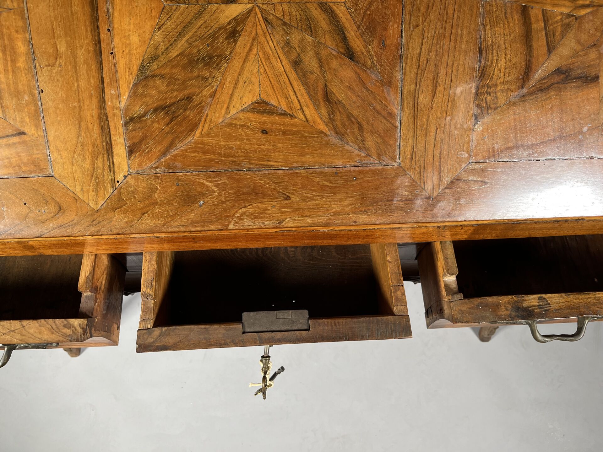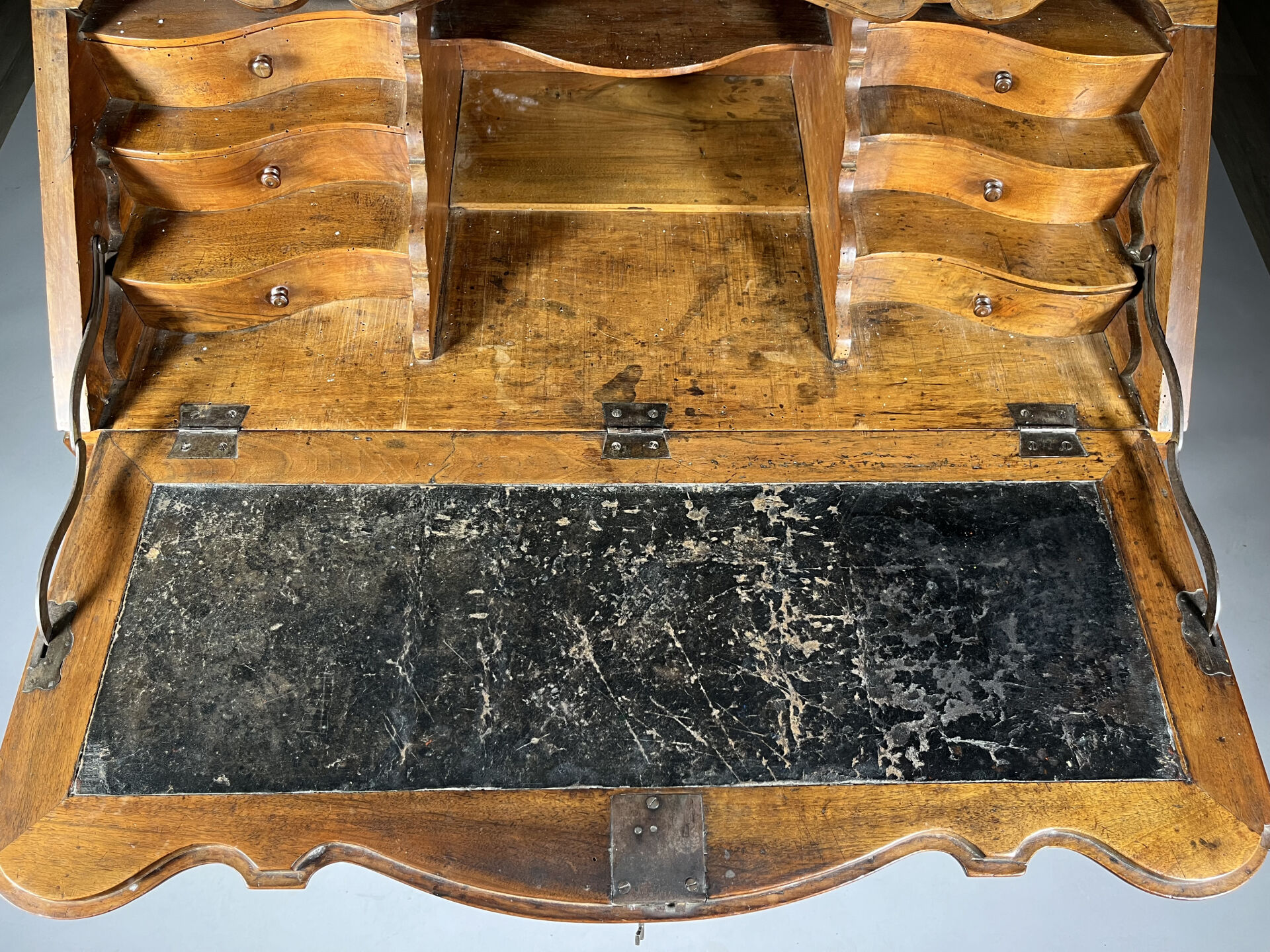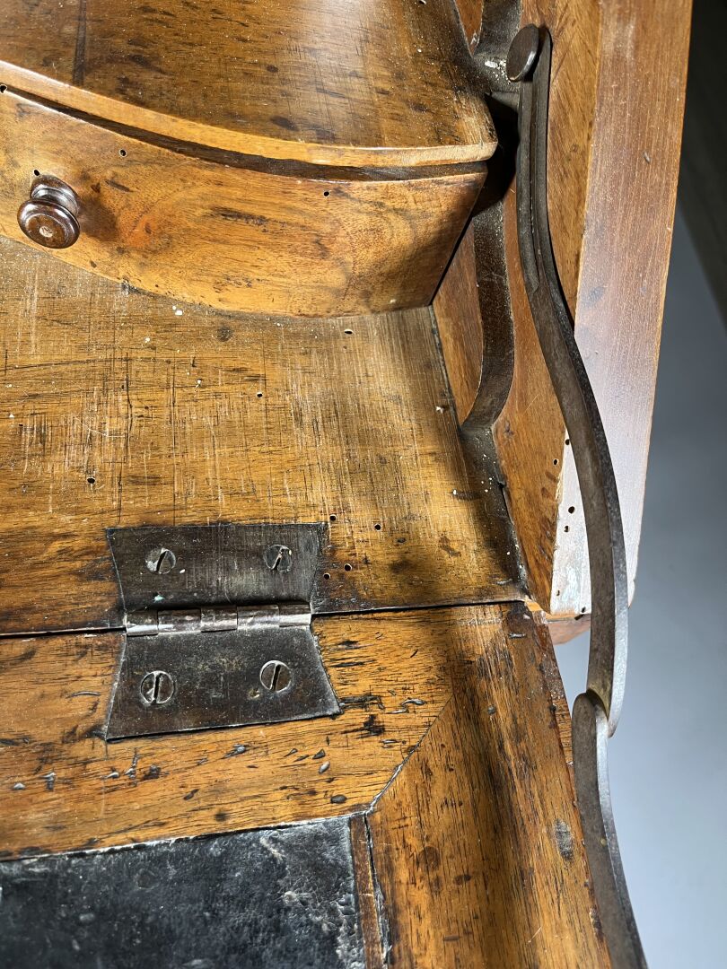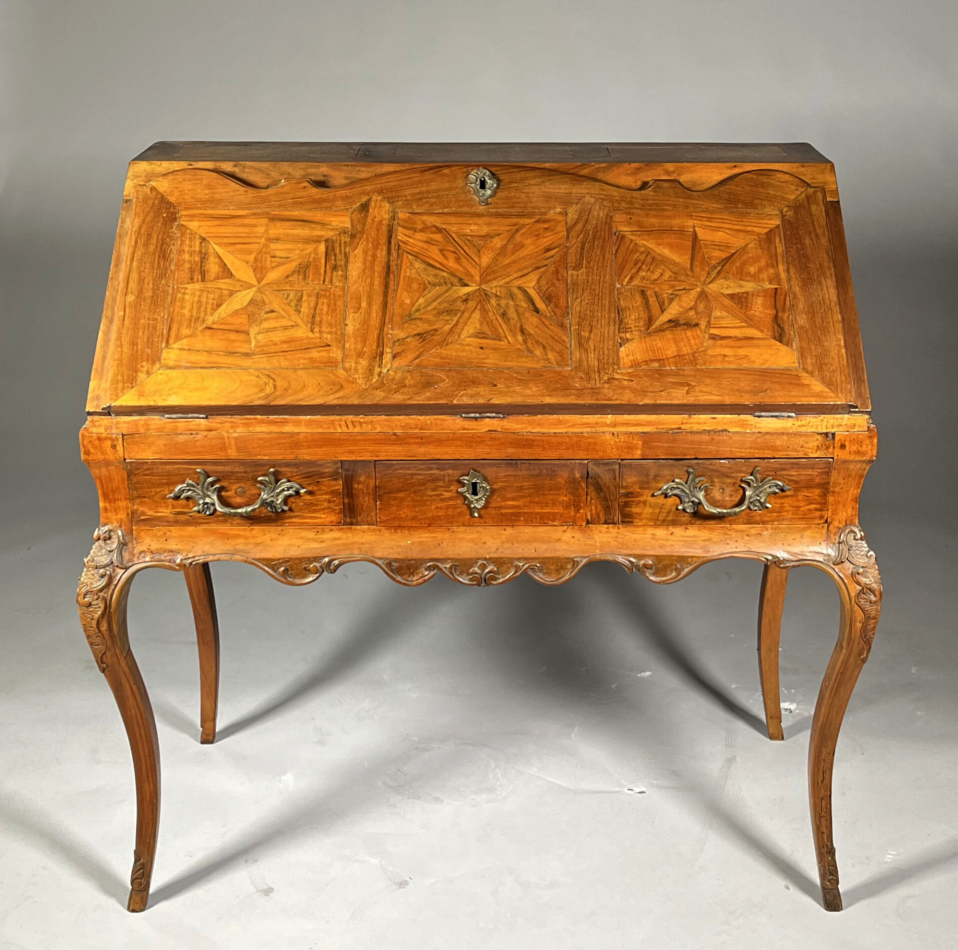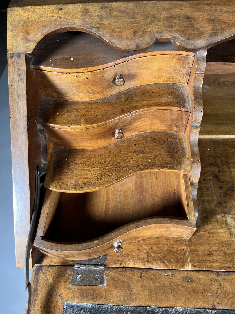 Secrétaire de pente en noyer (accidents et restaurations) mouluré et sculpté de coquilles, feuilles d’acanthe et rinceaux ouvrant par trois tiroirs en ceinture, l’abattant marqueté d’étoiles découvre six tiroirs et un casier. Il repose sur quatre pieds cambrés.Travail régional du milieu du XVIIIe siècle. Haut. : 103 cm – Larg. : 105 cm – Prof. : 54 cm
