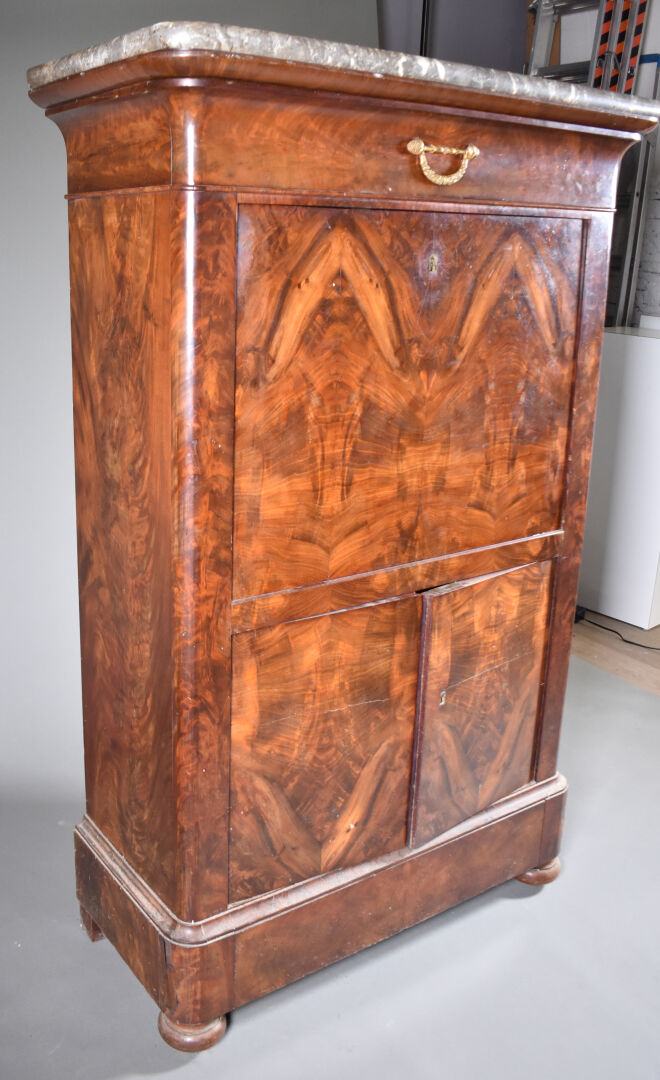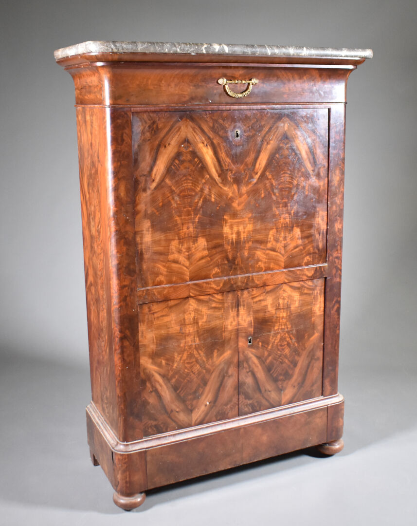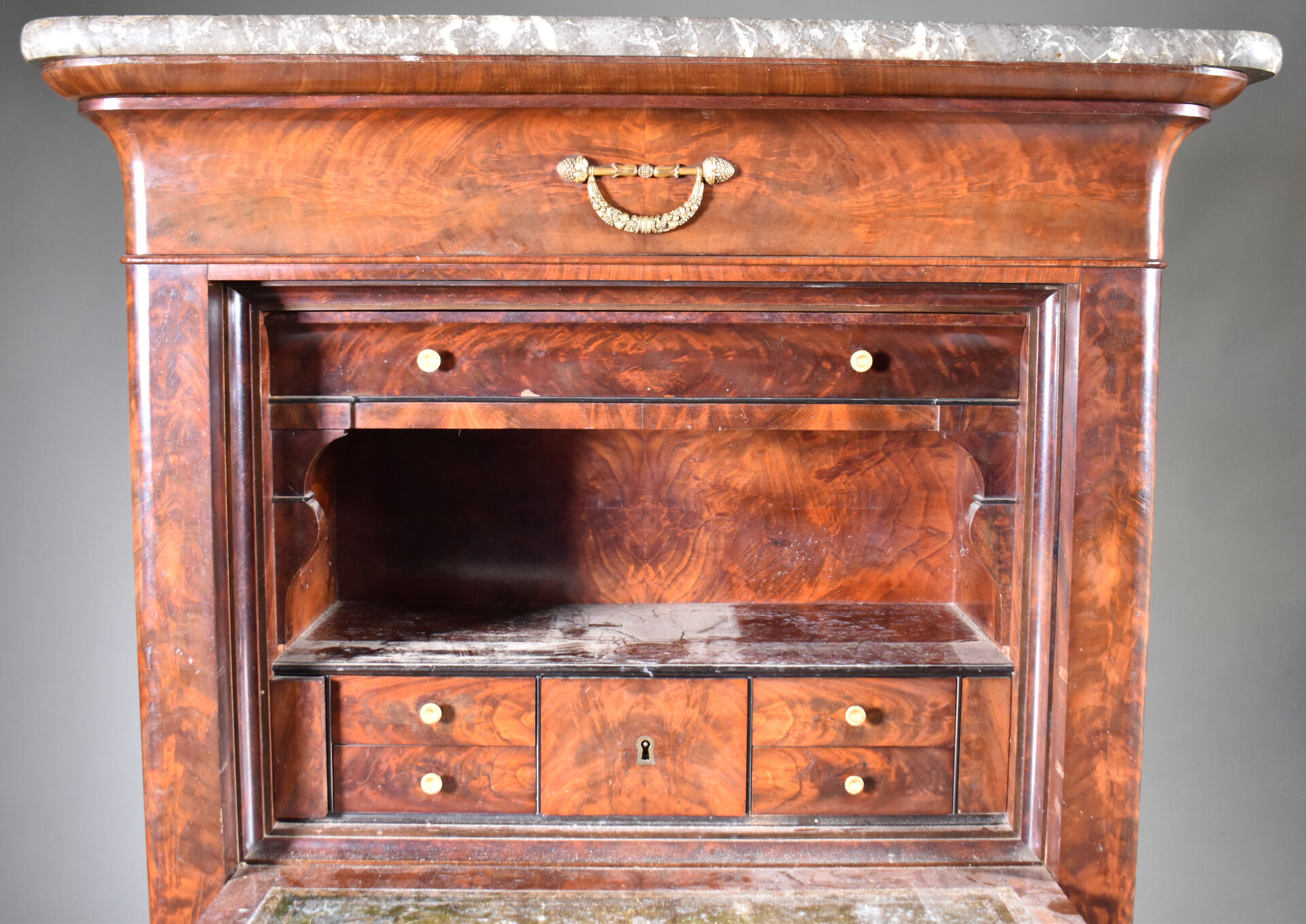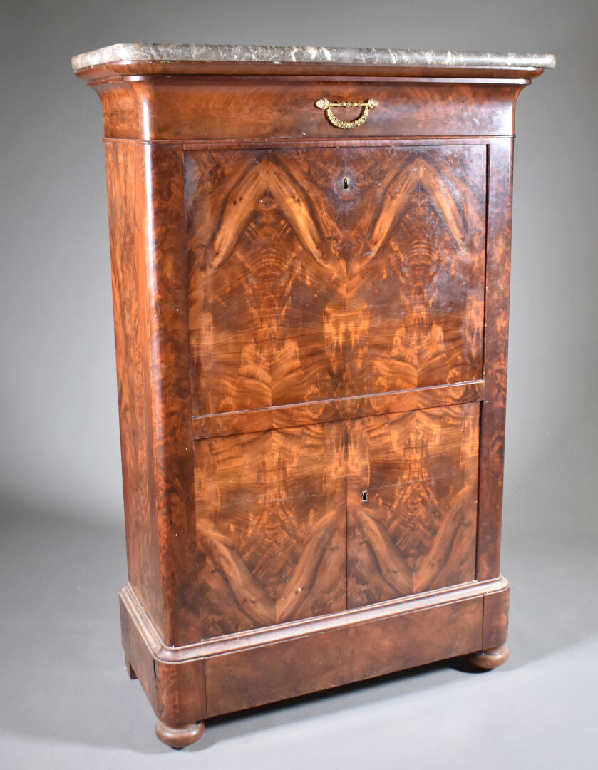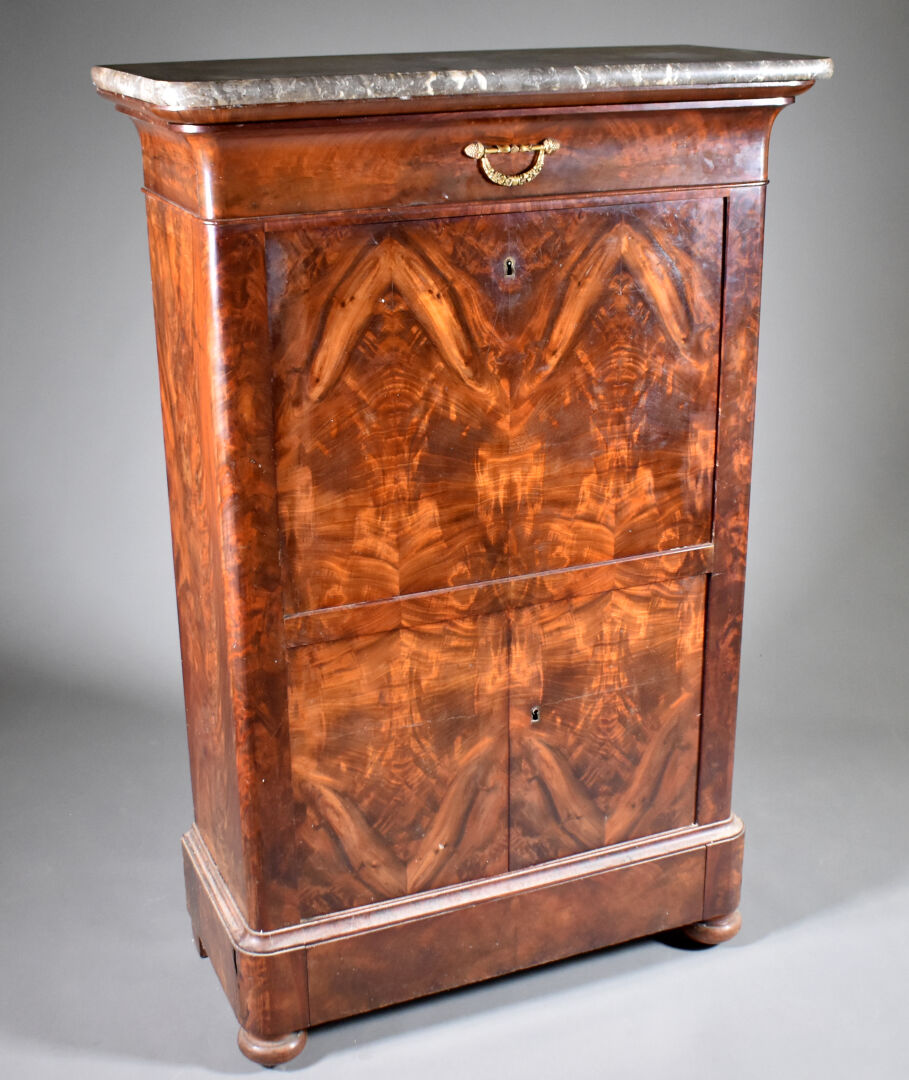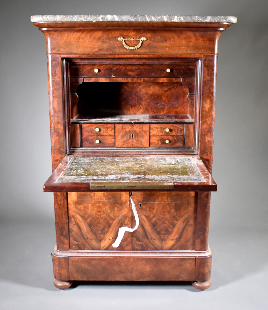 Secrétaire en acajou et placage d’acajou flammé (éclats, usures, fissures au placage à l’intérieur). Il ouvre à un tiroir en partie haute, un abattant gainé de cuir vert doré au petit fer (usures) découvrant niches et tiroirs et deux ventaux en partie basse découvrant des tiroirs et un abattant. Pieds boule aplatie. Plateau de marbre gris veiné blanc. Epoque Louis-Philippe. Haut. : 147 cm – Larg. : 97 cm – Prof. : 43 cm.