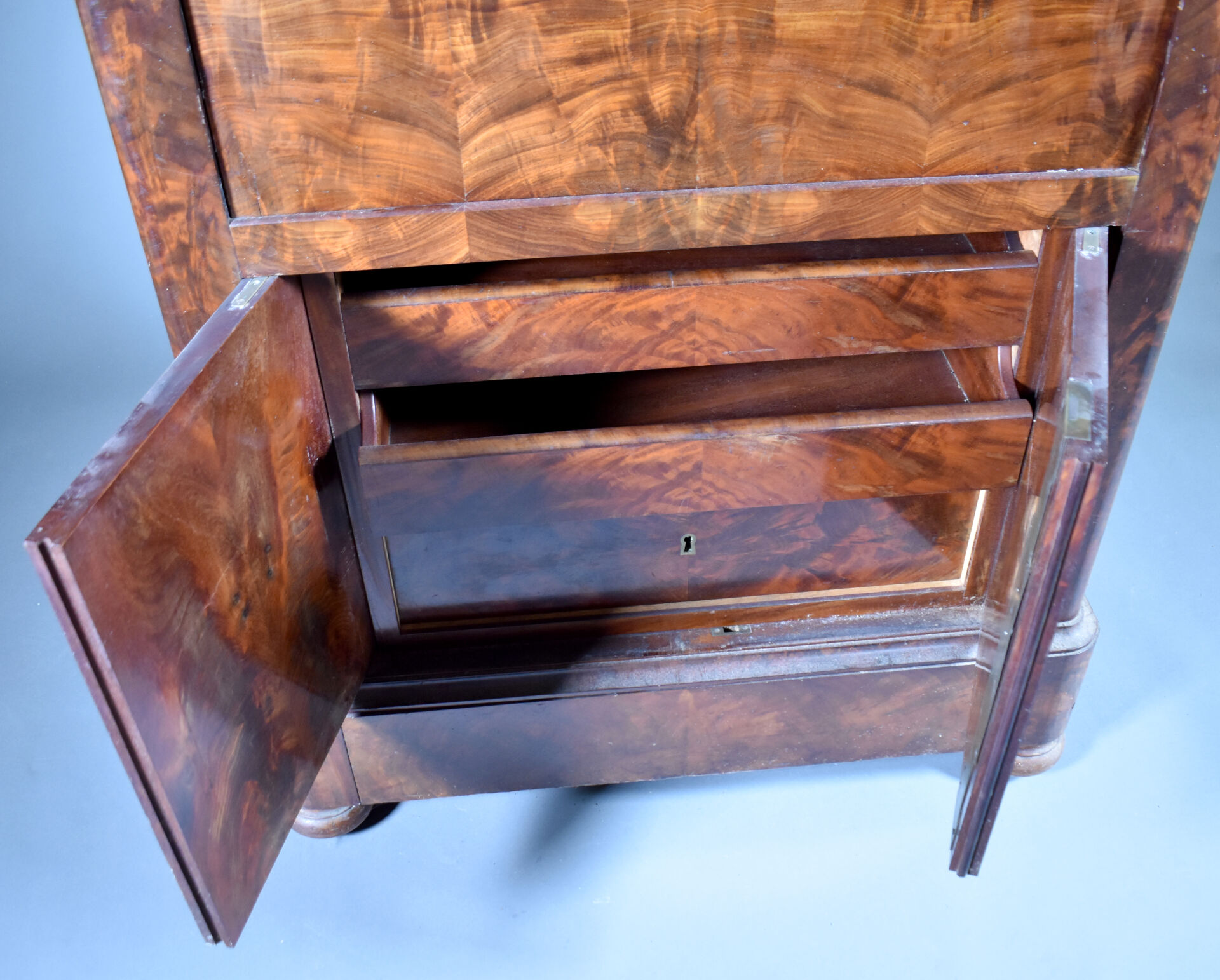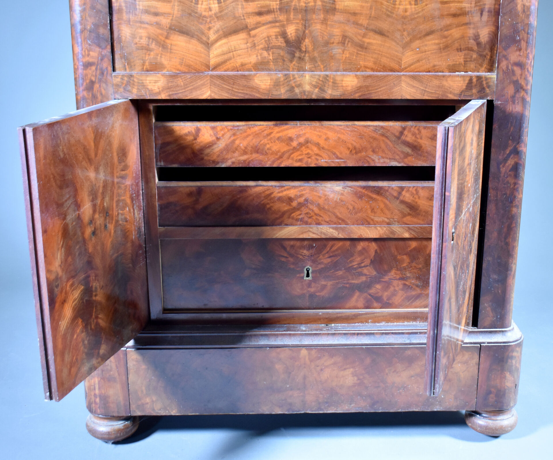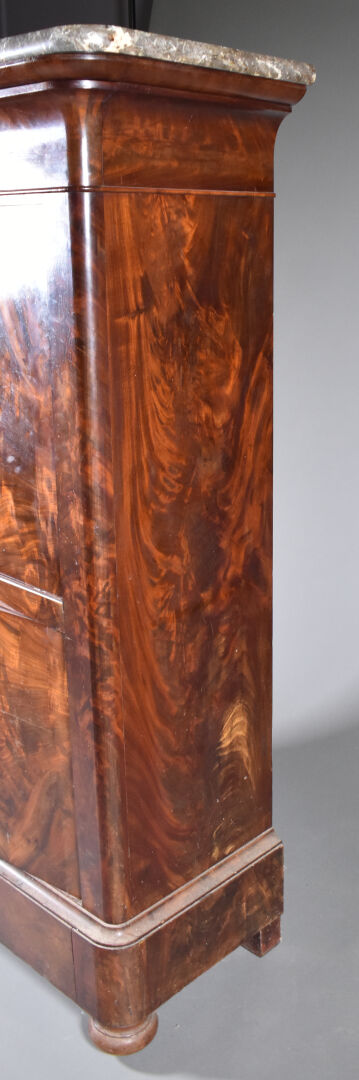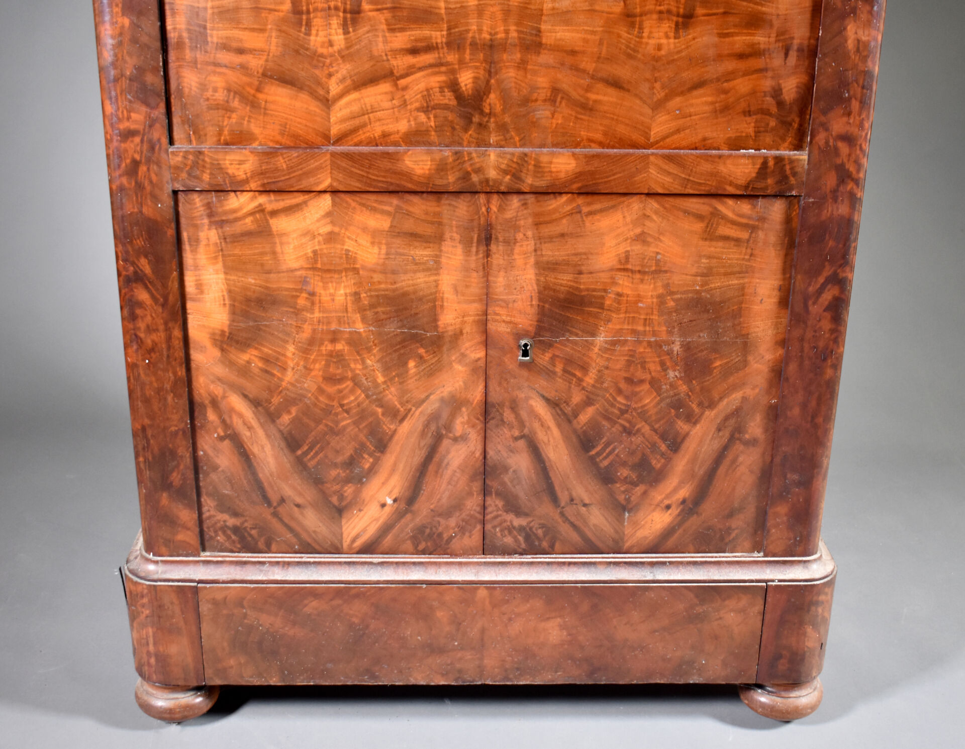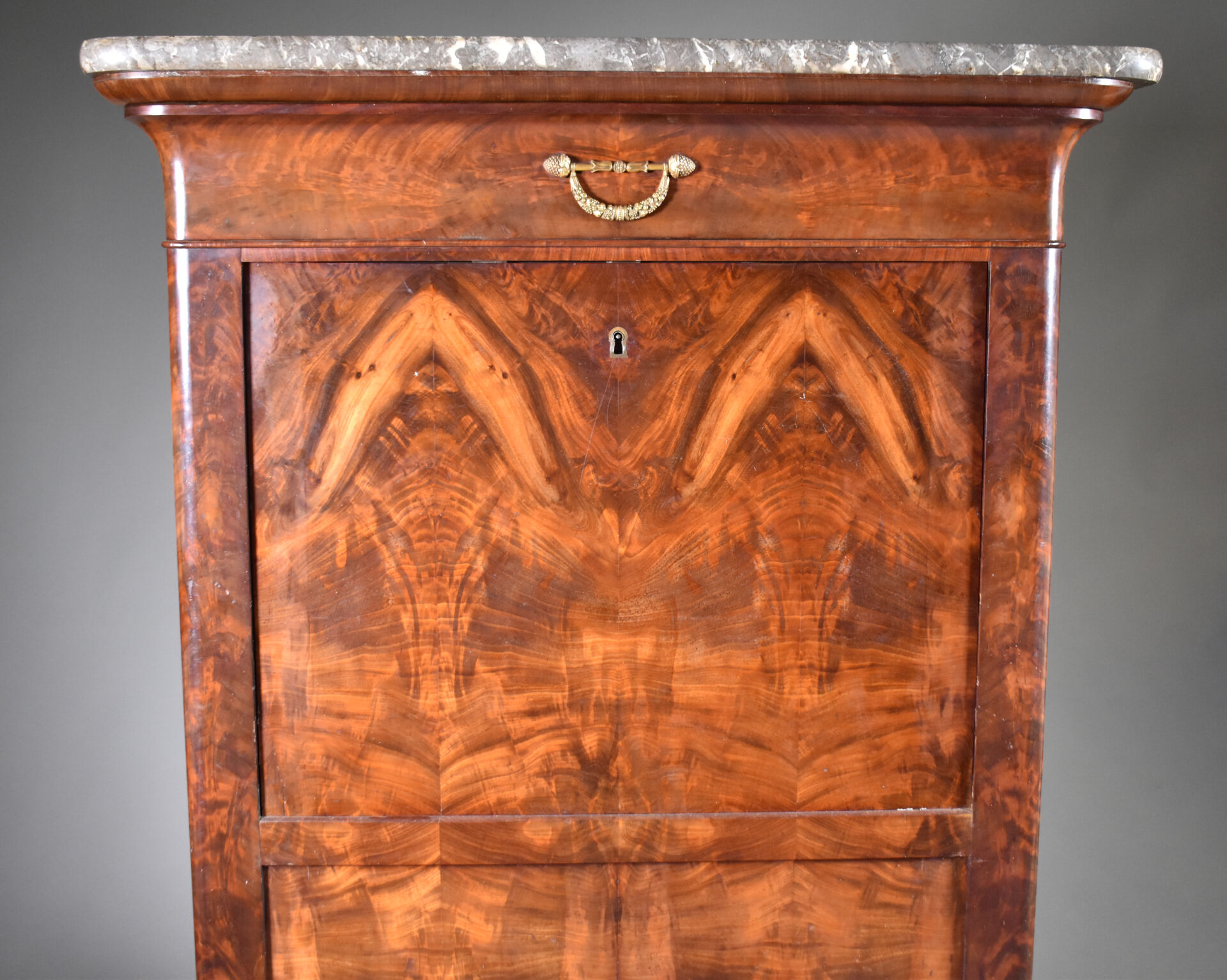 Secrétaire en acajou et placage d’acajou flammé (éclats, usures, fissures au placage à l’intérieur). Il ouvre à un tiroir en partie haute, un abattant gainé de cuir vert doré au petit fer (usures) découvrant niches et tiroirs et deux ventaux en partie basse découvrant des tiroirs et un abattant. Pieds boule aplatie. Plateau de marbre gris veiné blanc. Epoque Louis-Philippe. Haut. : 147 cm – Larg. : 97 cm – Prof. : 43 cm.