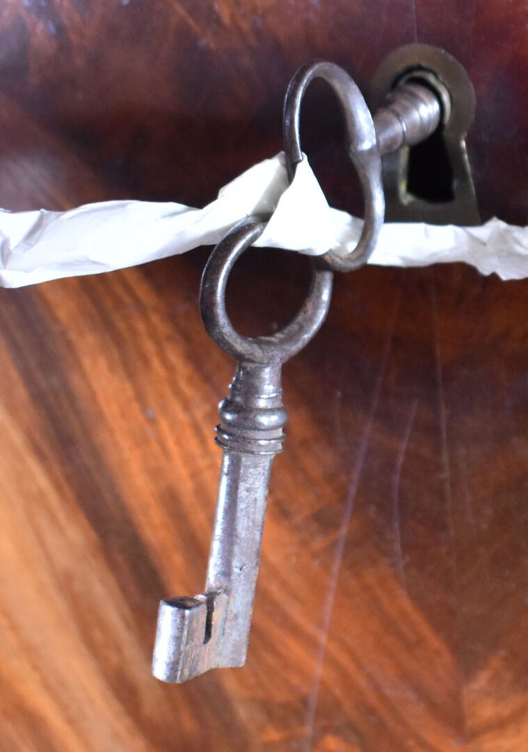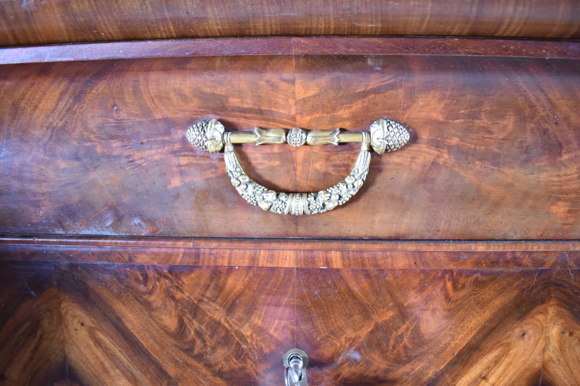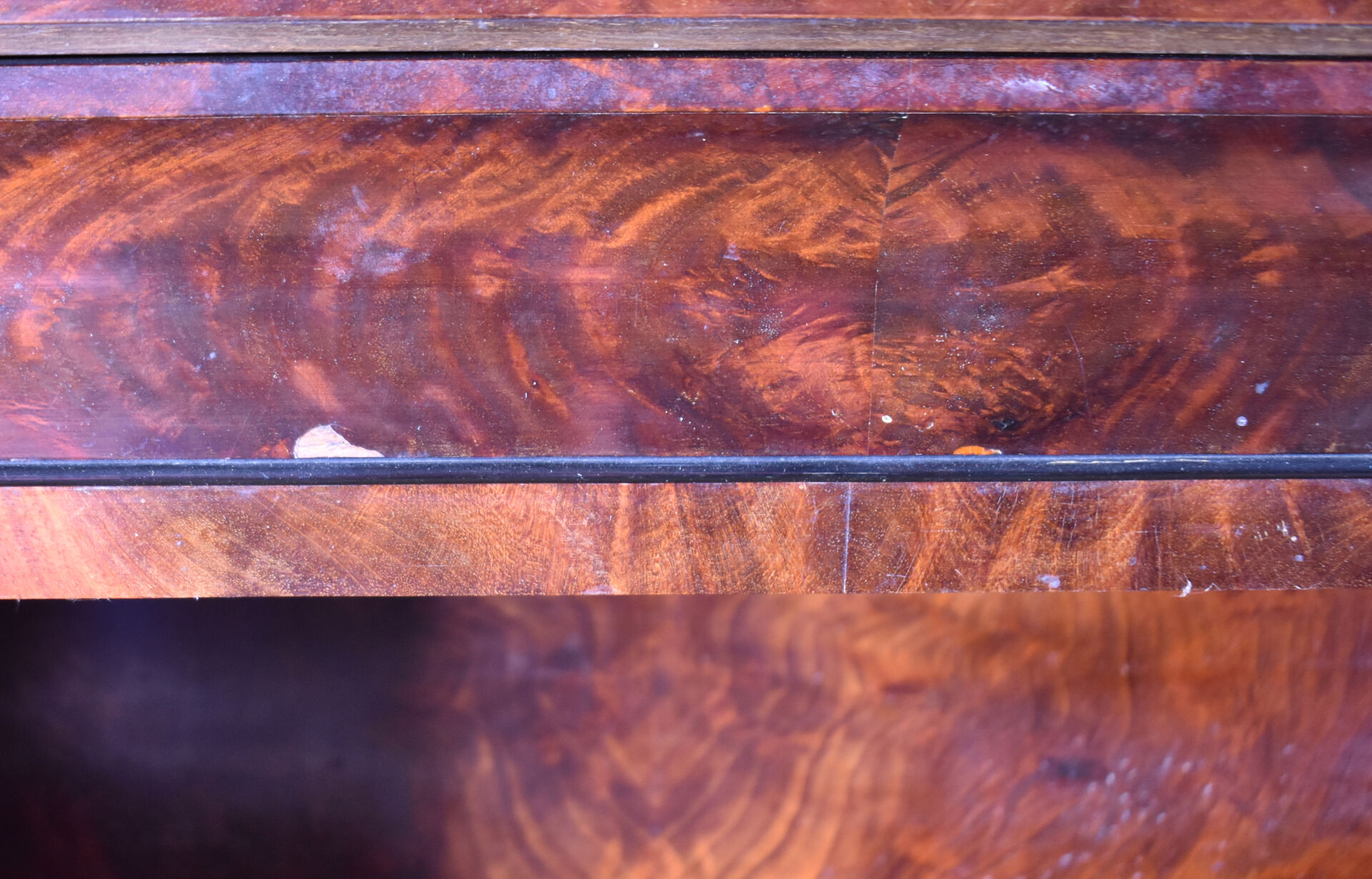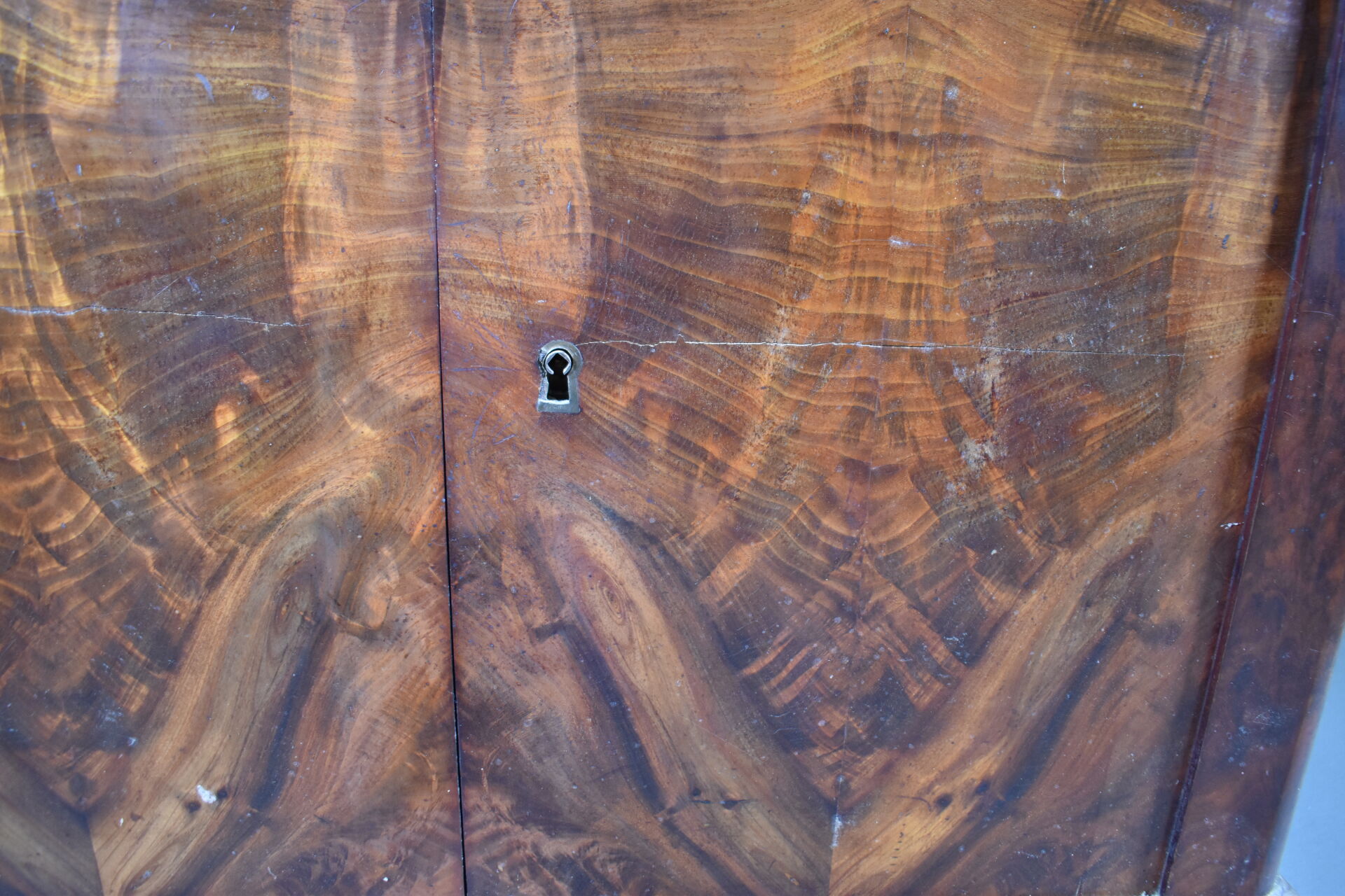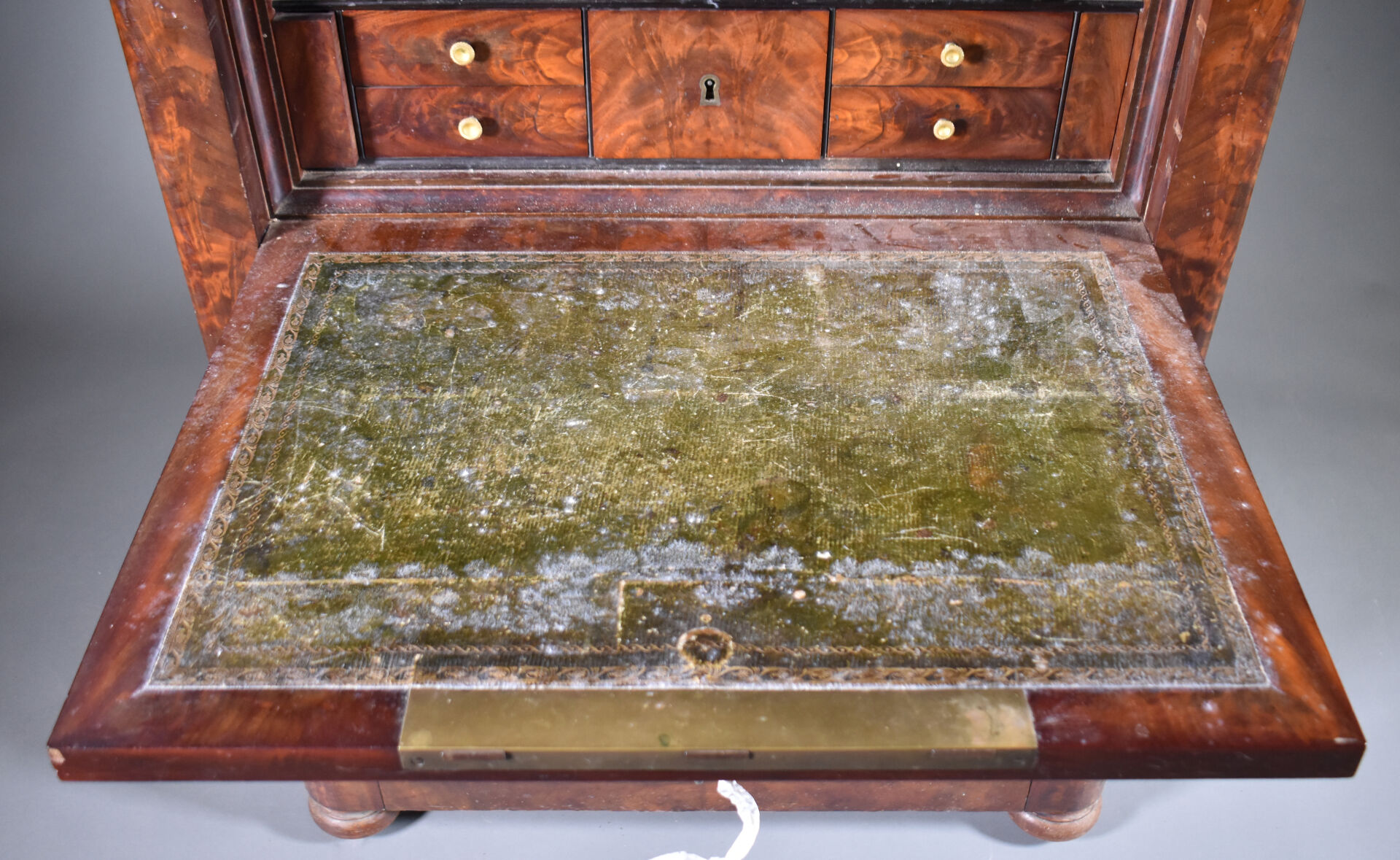Secrétaire en acajou et placage d’acajou flammé (éclats, usures, fissures au placage à l’intérieur). Il ouvre à un tiroir en partie haute, un abattant gainé de cuir vert doré au petit fer (usures) découvrant niches et tiroirs et deux ventaux en partie basse découvrant des tiroirs et un abattant. Pieds boule aplatie. Plateau de marbre gris veiné blanc. Epoque Louis-Philippe. Haut. : 147 cm – Larg. : 97 cm – Prof. : 43 cm.