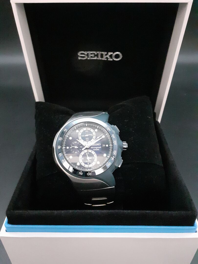 SEIKO, montre chronographe en acier, Tachymètre 100m. Cadran bleu et noir, aiguilles acier, index points blancs. Guichet date à 3H. Bracelet en acier. Numérotée 971042. Usures. On y joint trois maillons supplémentaires en acier, sa boite, son écrin, sa garantie et son manuel d’instructions.