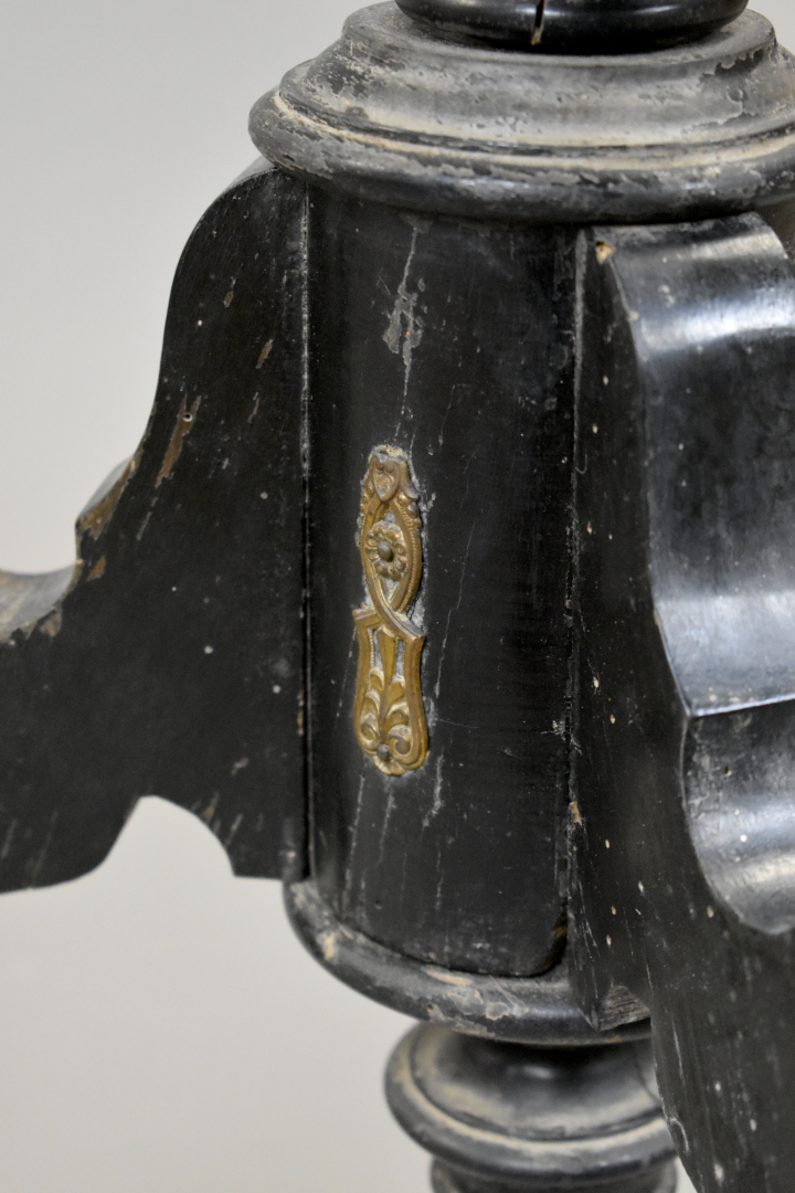 Selette à quatre plateaux en bois noirci (mouillures) et piétement tripode. Epoque Napoléon III. Haut. : 140 cm.
