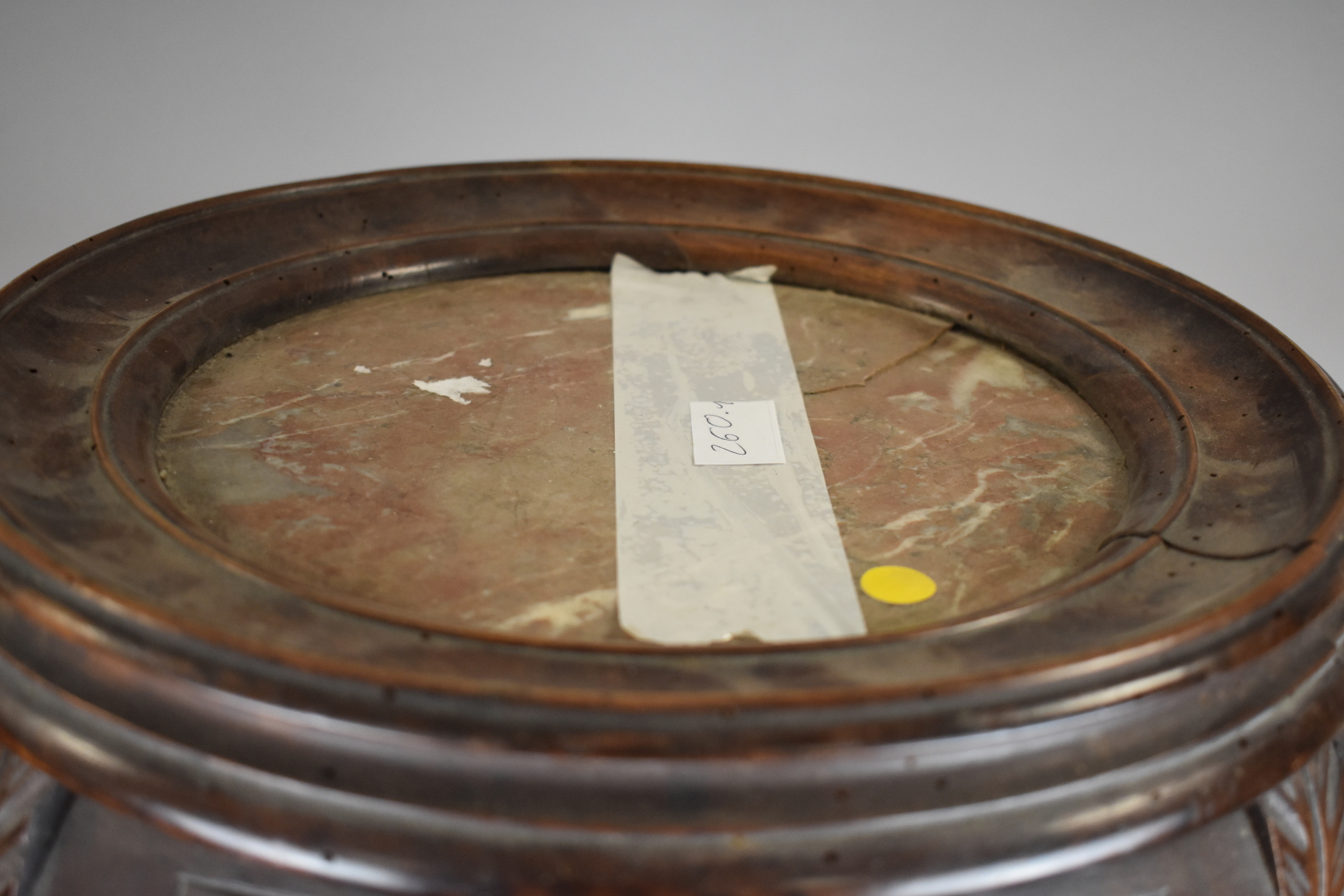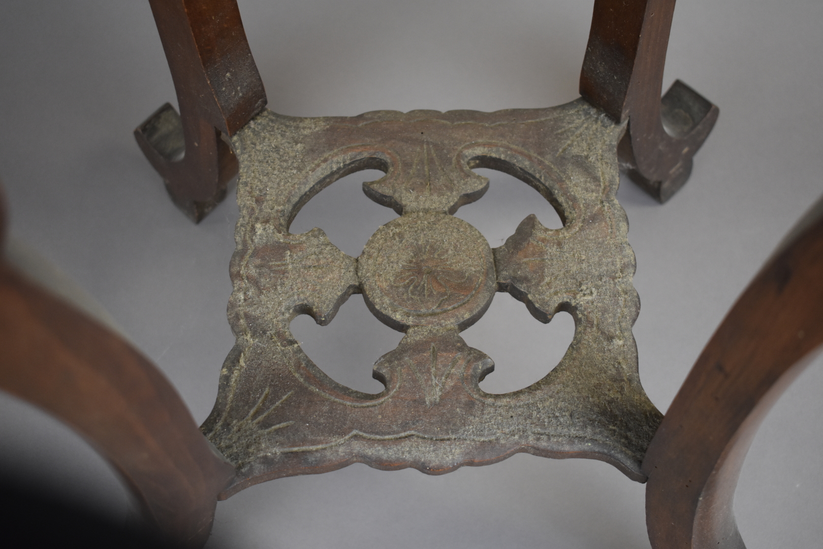 Selette en bois sculpté. Dessus de marbre rouge (fendu. Chine XXe siècle.