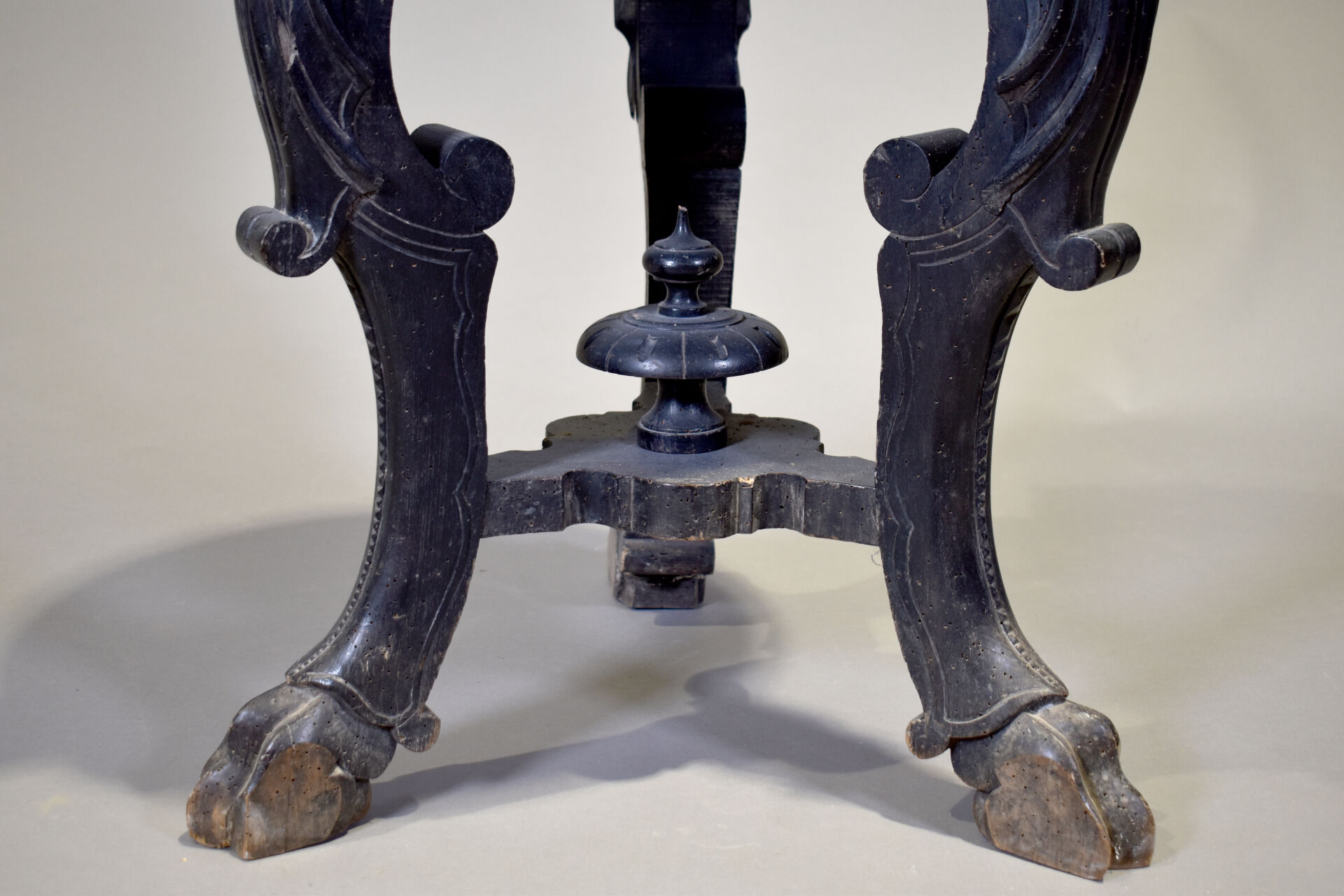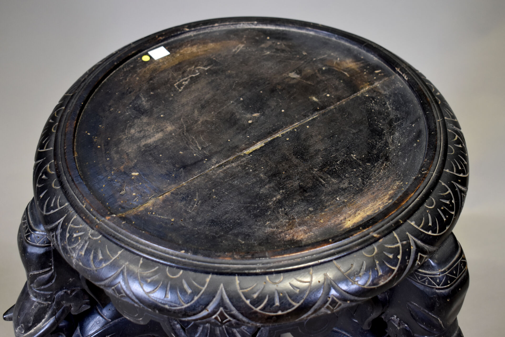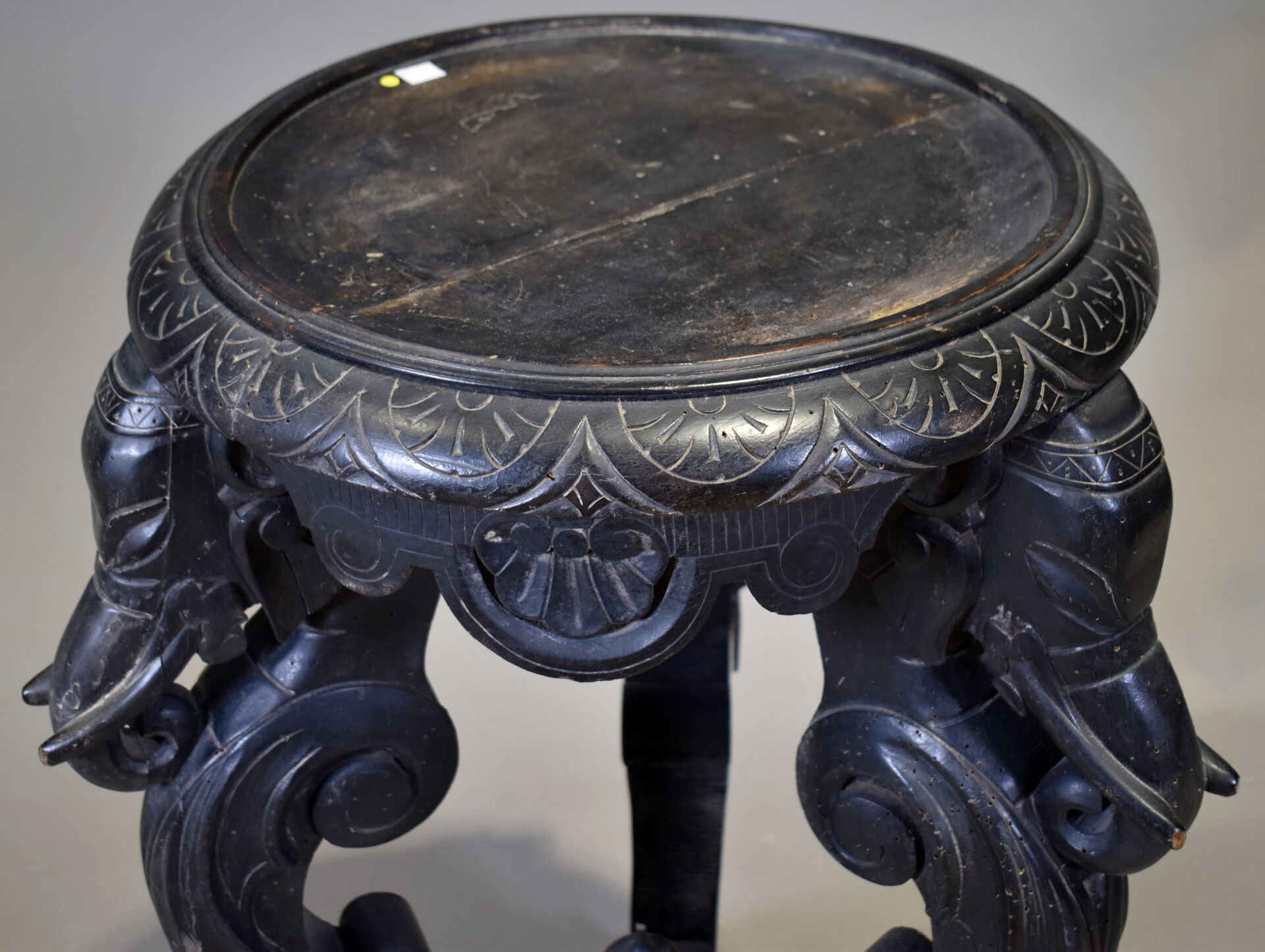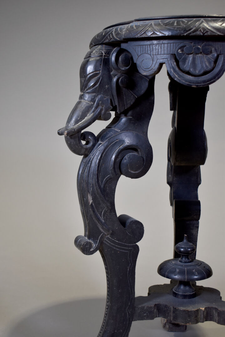 Selette en bois sculpté noirci à piétement tripode figurant des éléphants (plateau fendu). Fin du XIXe ou début du XXe siècle. Haut. : 82 cm – Diam. : 54 cm.