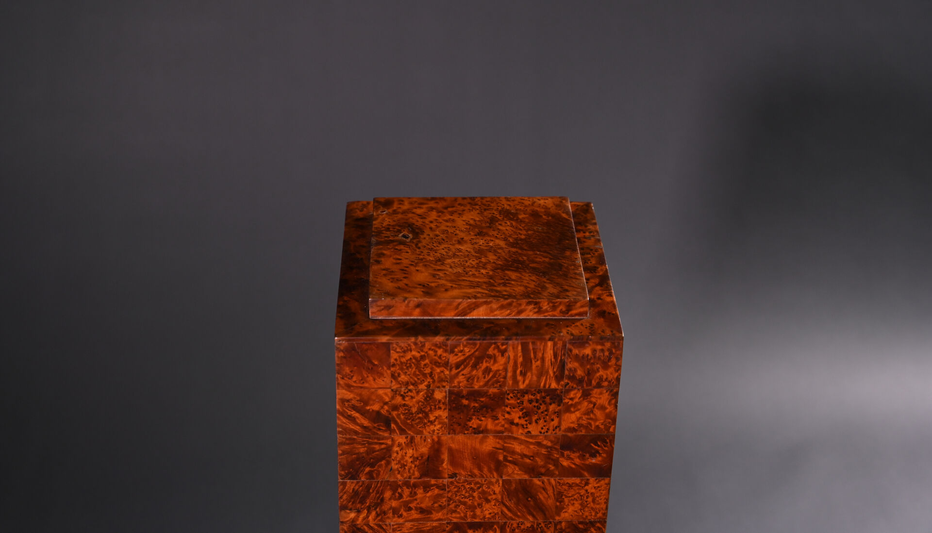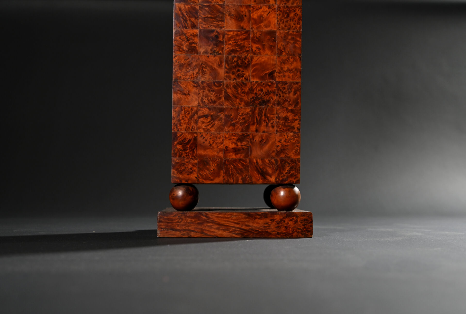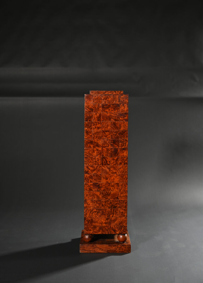 Sellette colonne rectangulaire en placage de loupe, la base à quatre boules (usures d’usage). Epoque Art Déco. Haut. : 93 cm – Larg. : 29,5 cm – Prof. : 29,5 cm.