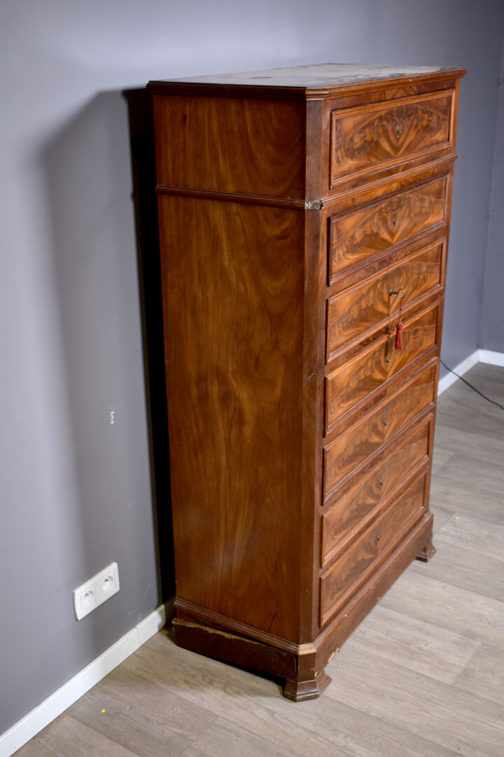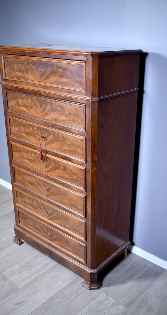 Semainier en placage d’acajou (éclats et manques), il repose sur des pieds droits. Début du XXe siècle. Haut. : 181 cm – Larg. : 80 cm – Prof. : 40,5 cm.