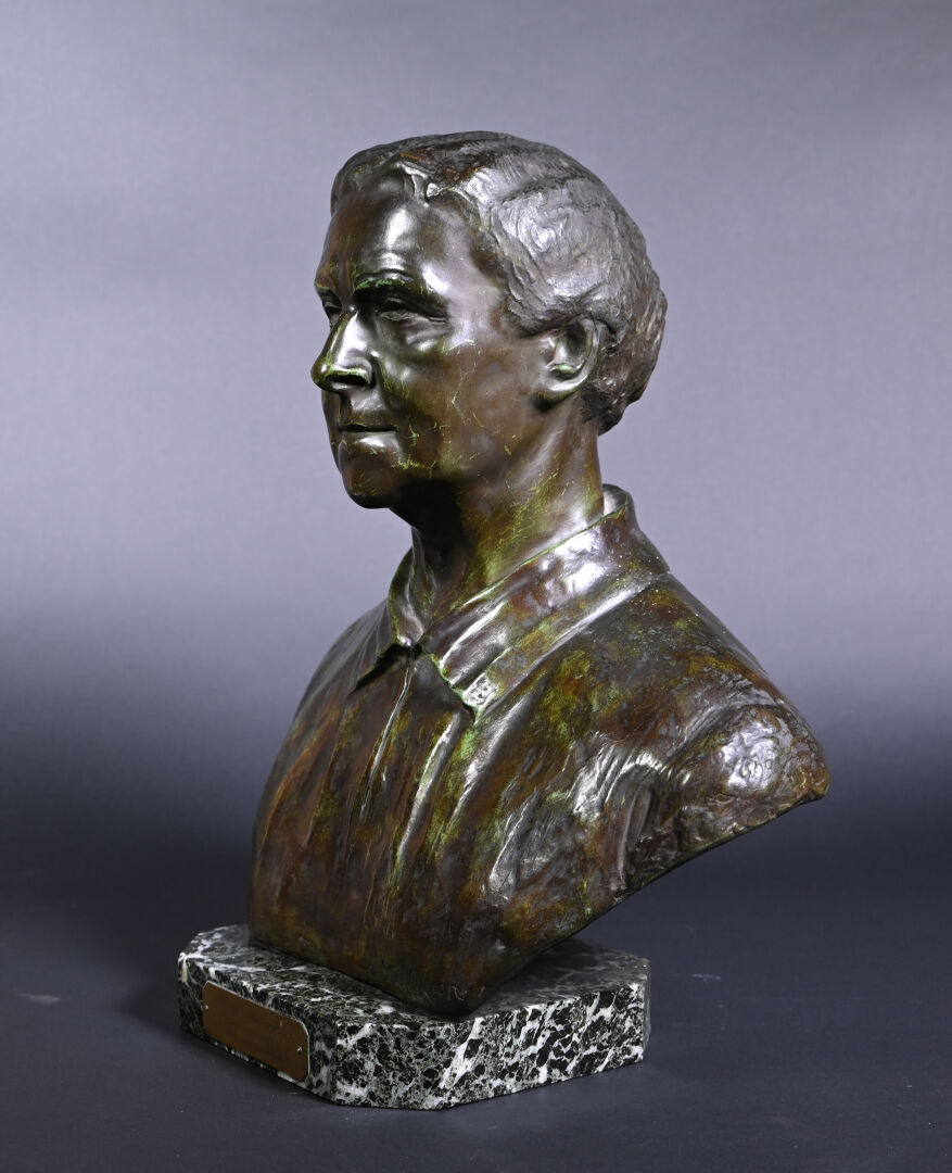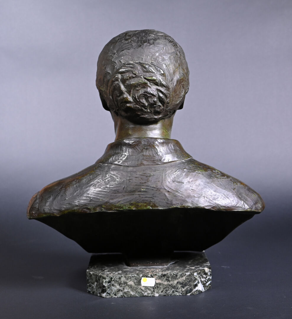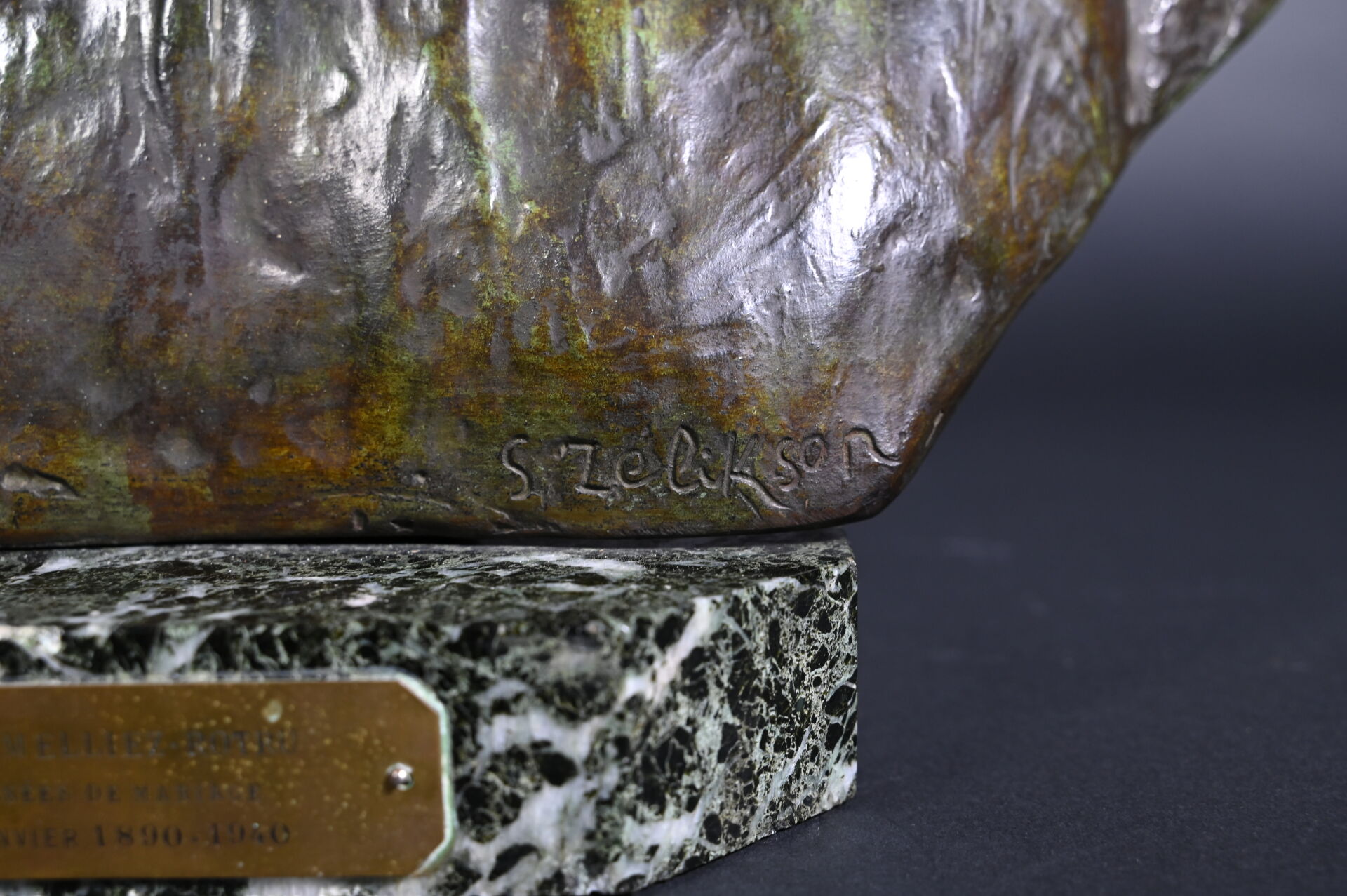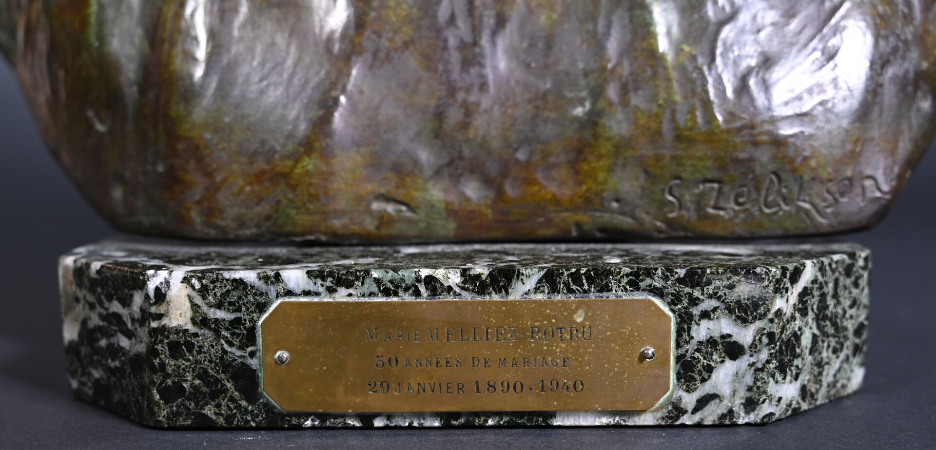 Serge ZELIKSON (1890-1966). Buste de Monsieur Marie MELLIEZ- ROTRU en bronze patiné vert. Signé devant en bas. Socle de marbre vert de mer avec cartouche indiquant « Marie MELLIEZ-ROTRU – 50 années de mariage – 29 janvier 1890 – 1940 ». Haut. totale : 52 cm.