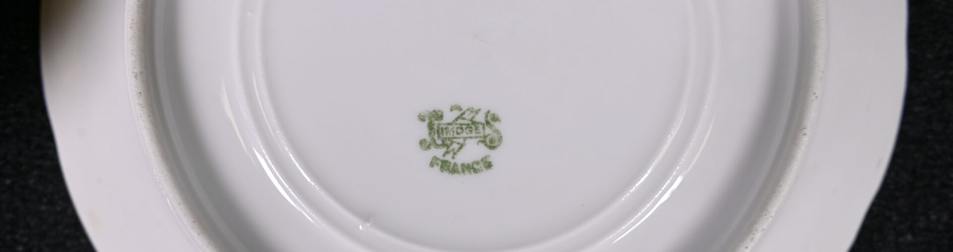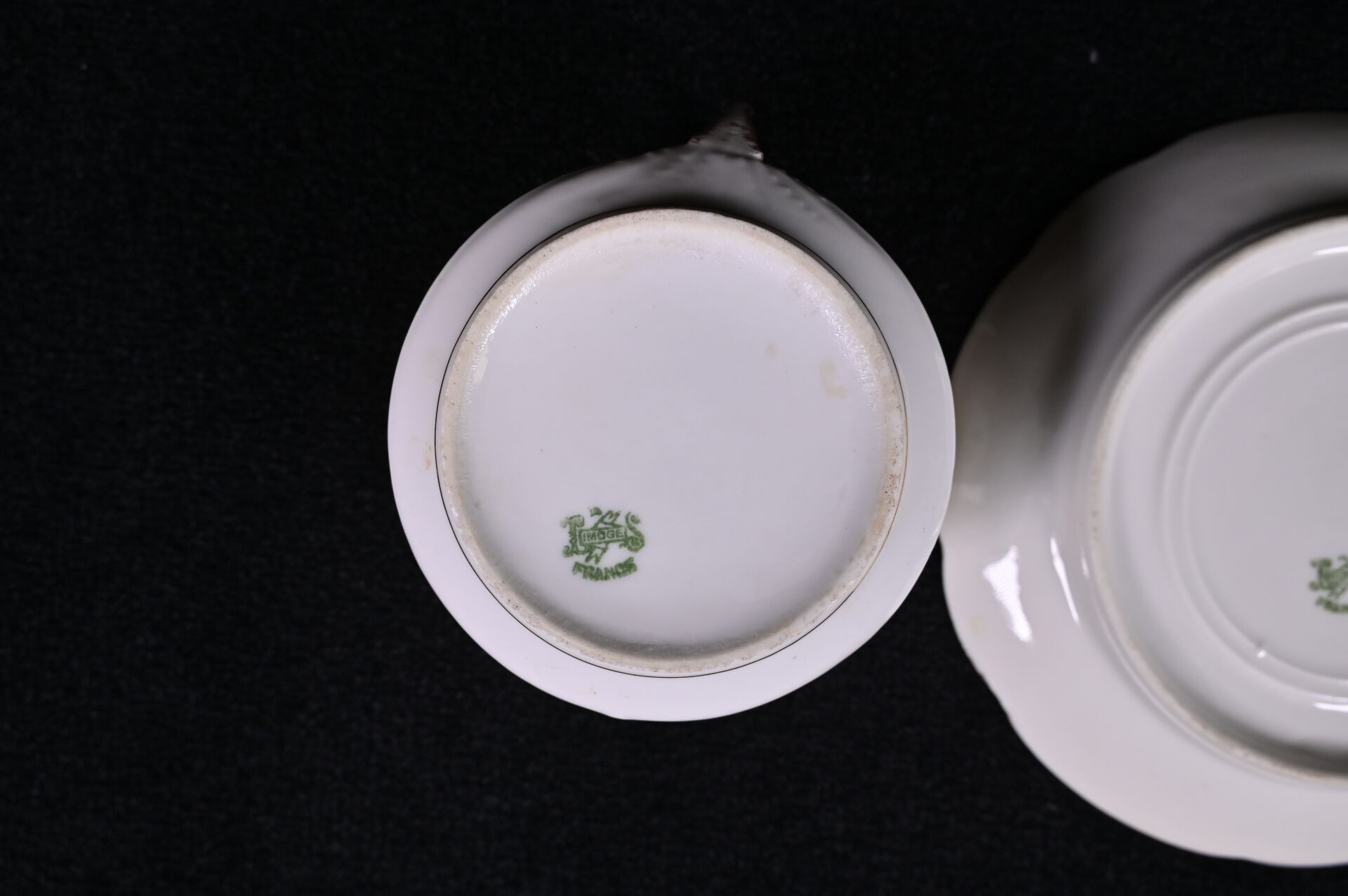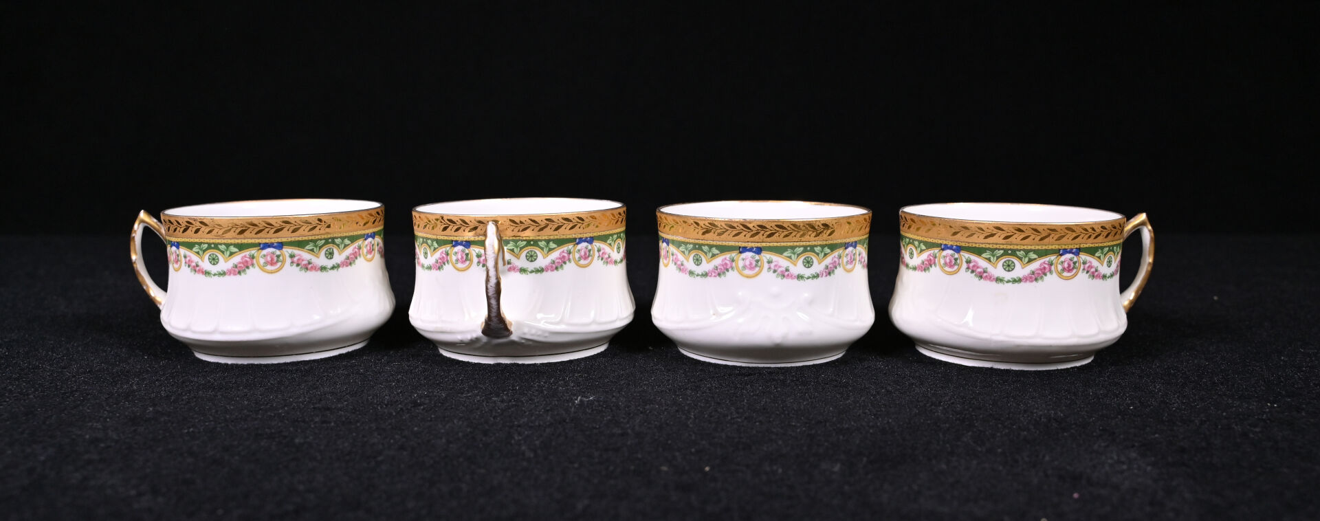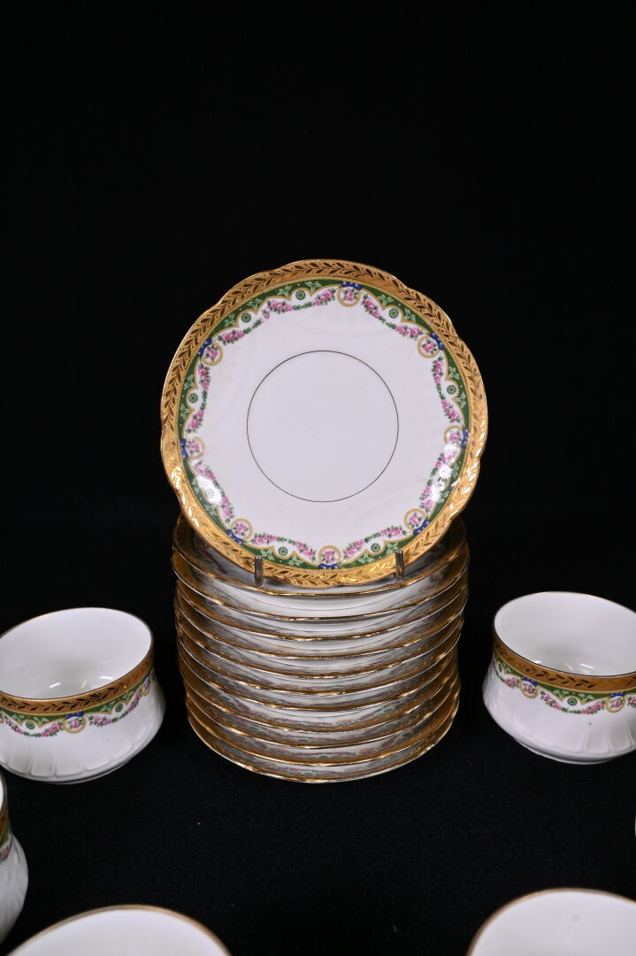 Service à café en porcelaine blanche et bordure dorée à décor de guirlandes de roses en polychromie, composé de 12 tasses sous-tasses (usures d’usage). Marqué LIMOGES France.