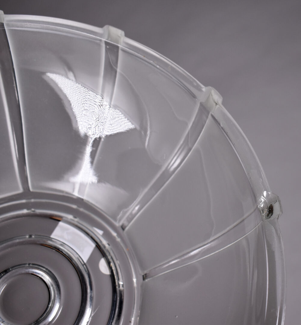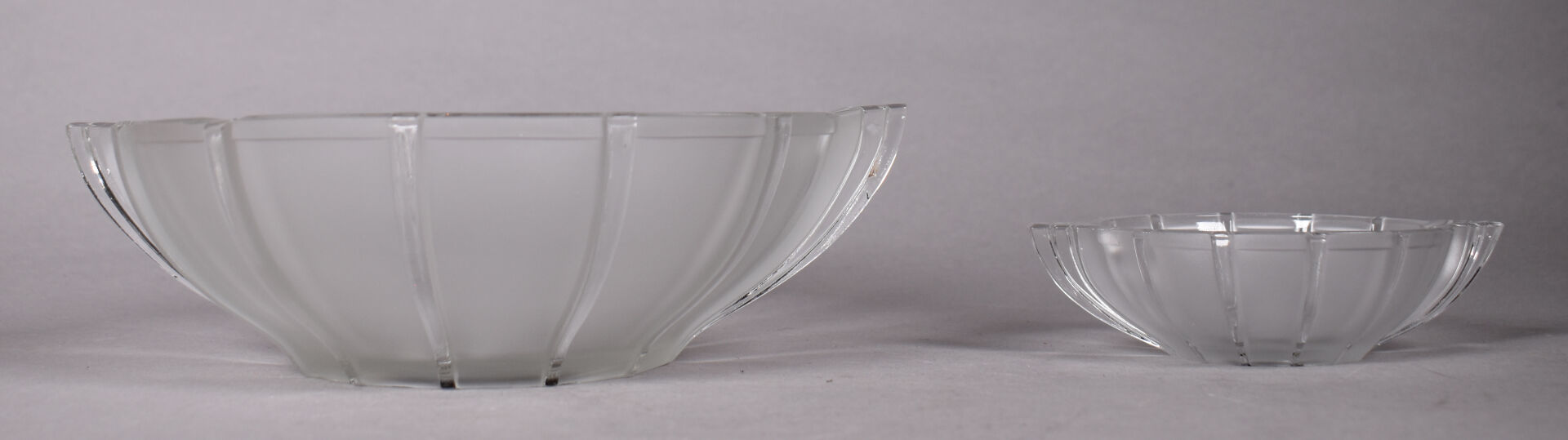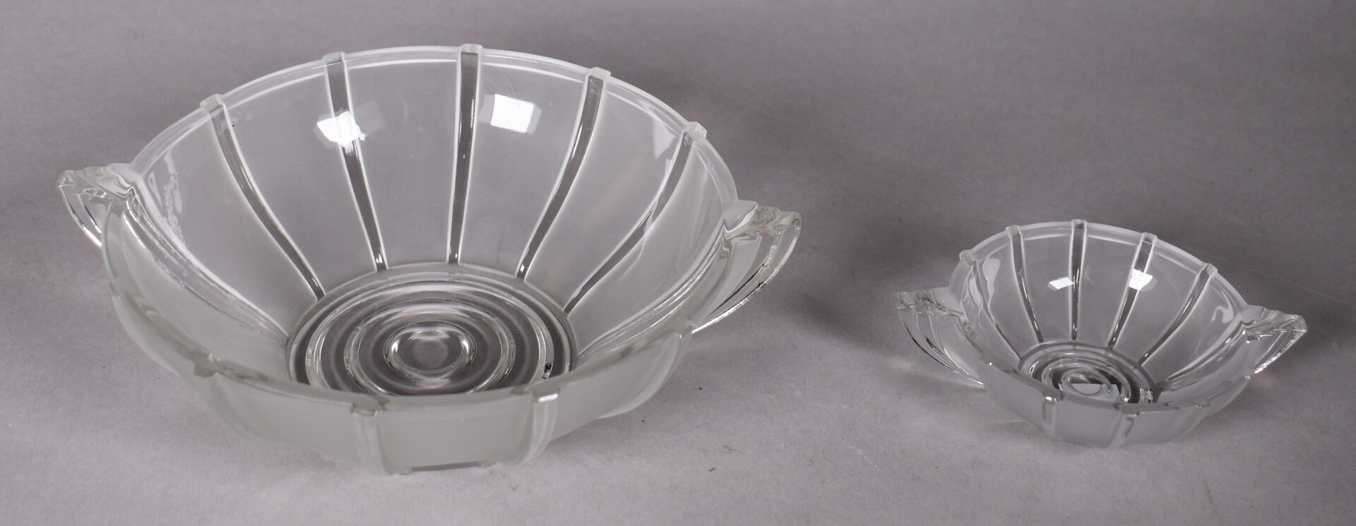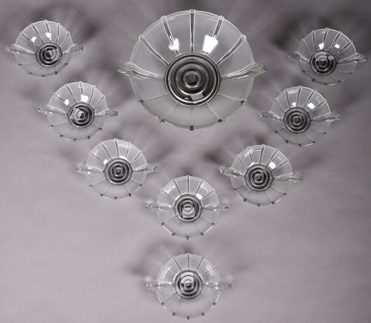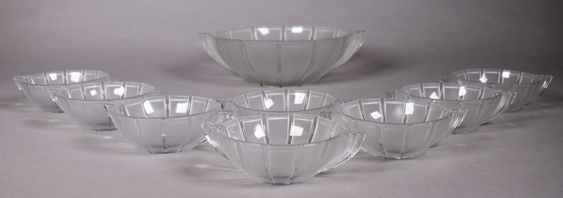Service à fruits en verre moulé partiellement dépoli comprenant 8 coupelles et un saladier (un éclat). Epoque Art Déco. Dim. du saladier : Haut. : 7 cm – Diam. : 24 cm.