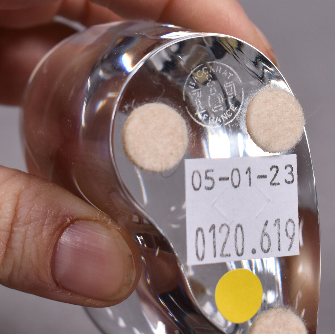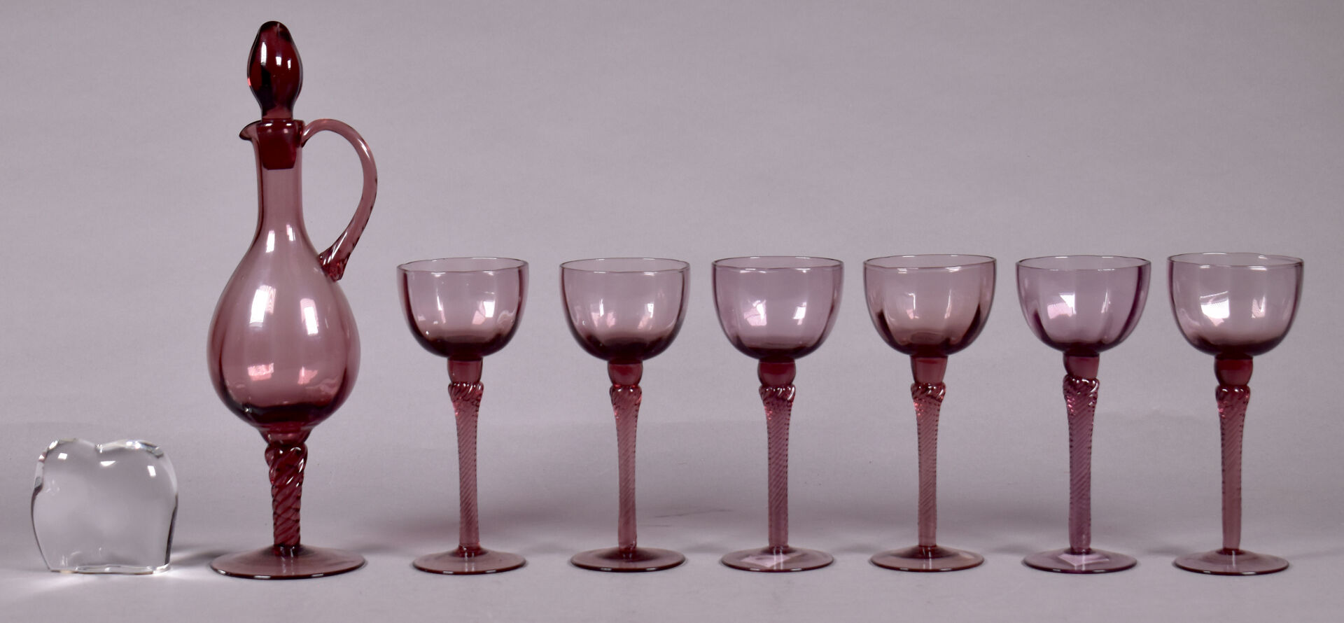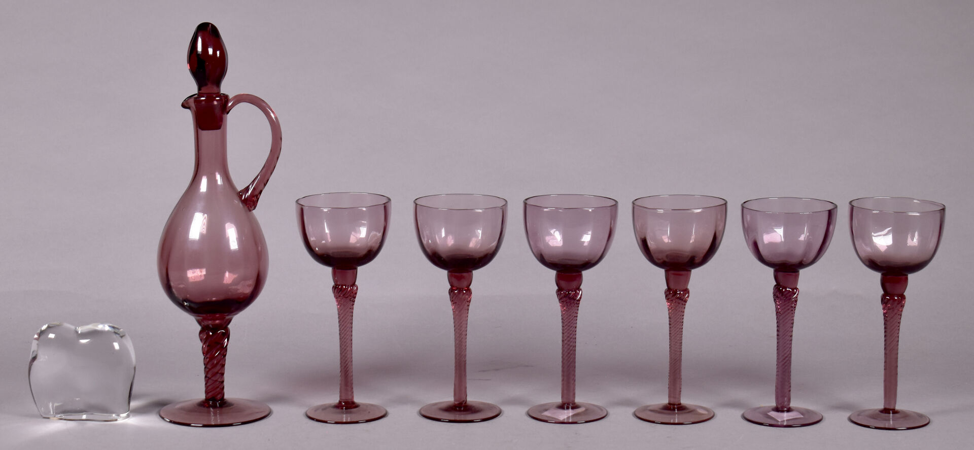 Service à liqueur en verre mauve comprenant 6 verres à pied et une carafe. Haut. verre : 16 cm. On joint un éléphant en cristal de BACCARAT.
