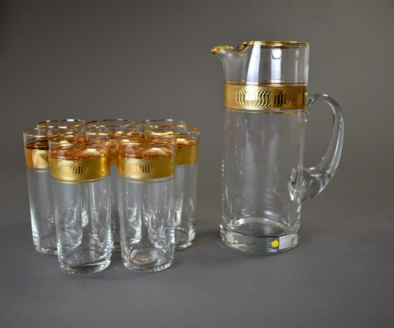 Service à orangeade en verre à décor d’une frise de cercles et liseré or comprenant un broc et huit verres. Haut. broc : 25 cm – Verre : 14,5 cm.
