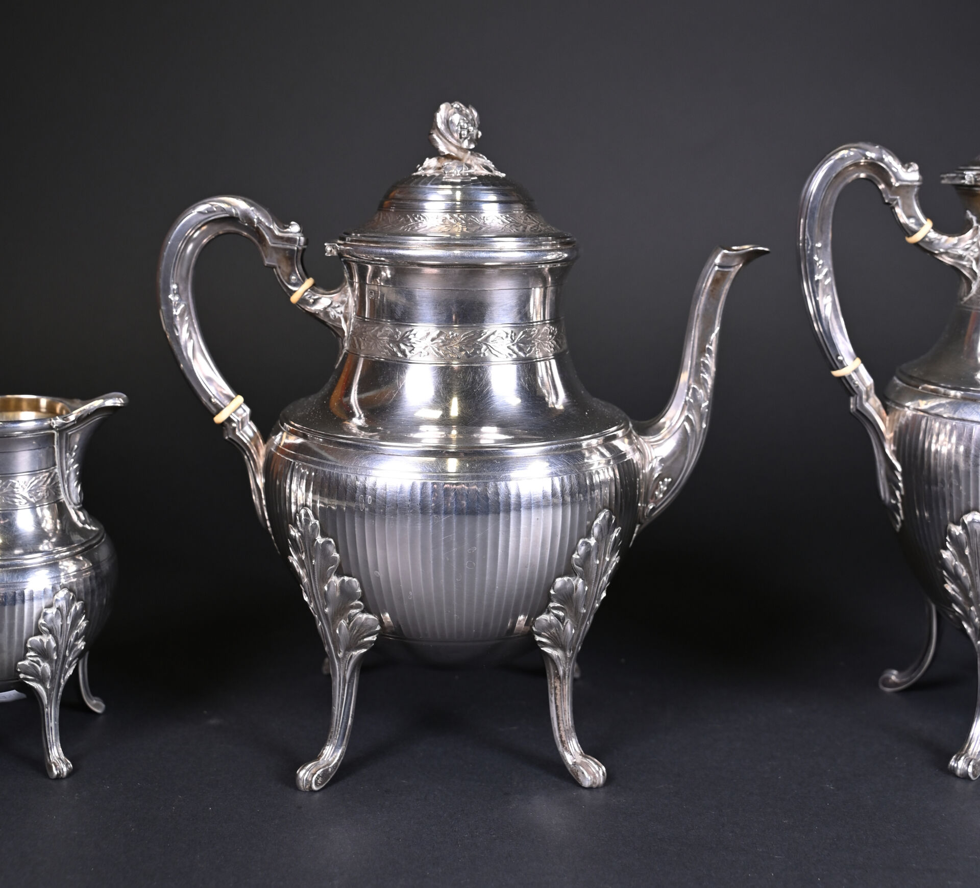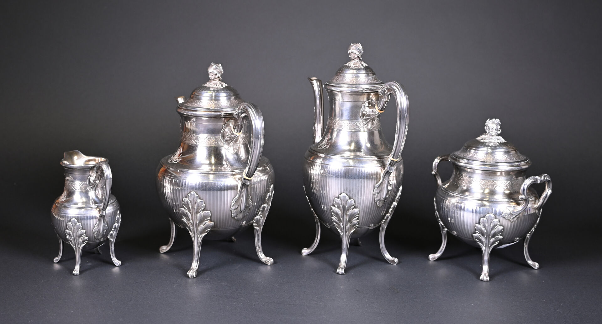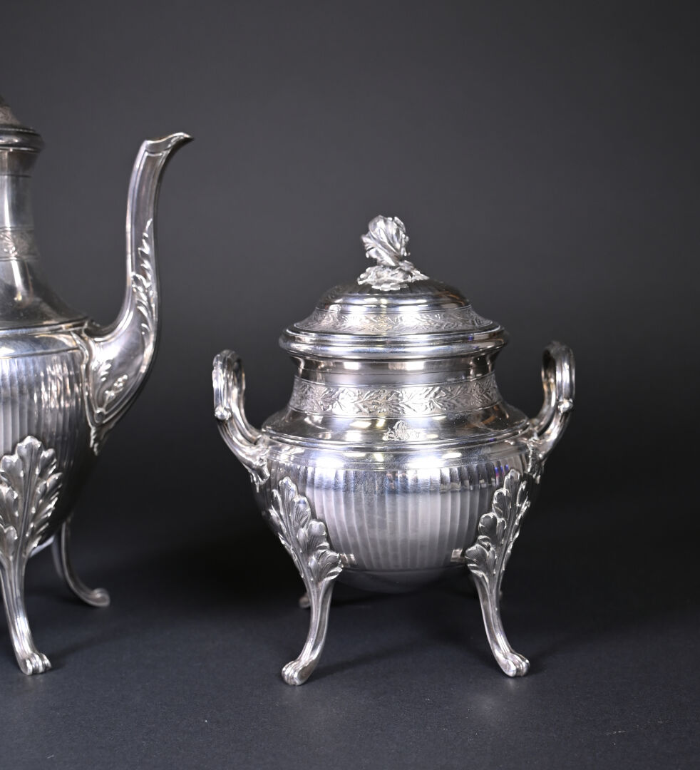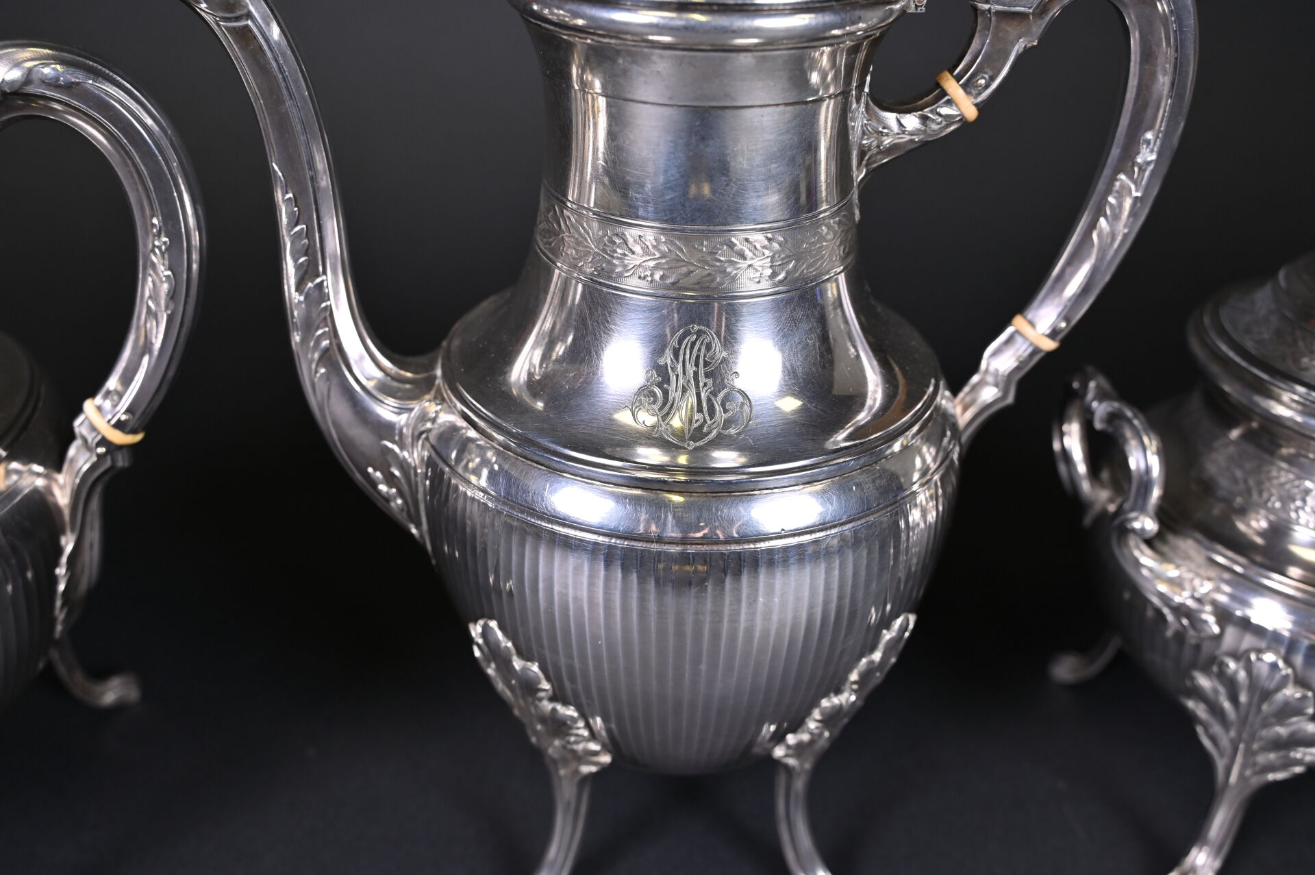 Service à thé en argent 925/1000e à décor de frises de laurier, acanthes et cannelures, chiffré LM. Il comprend deux théières, un pot à sucre et un pot à lait.Haut. de la plus grande théière : 26 cm. Poids brut total. : 2 461 g. On joint une pince à sucre en argent 925/1000e. Poids : 61 g.