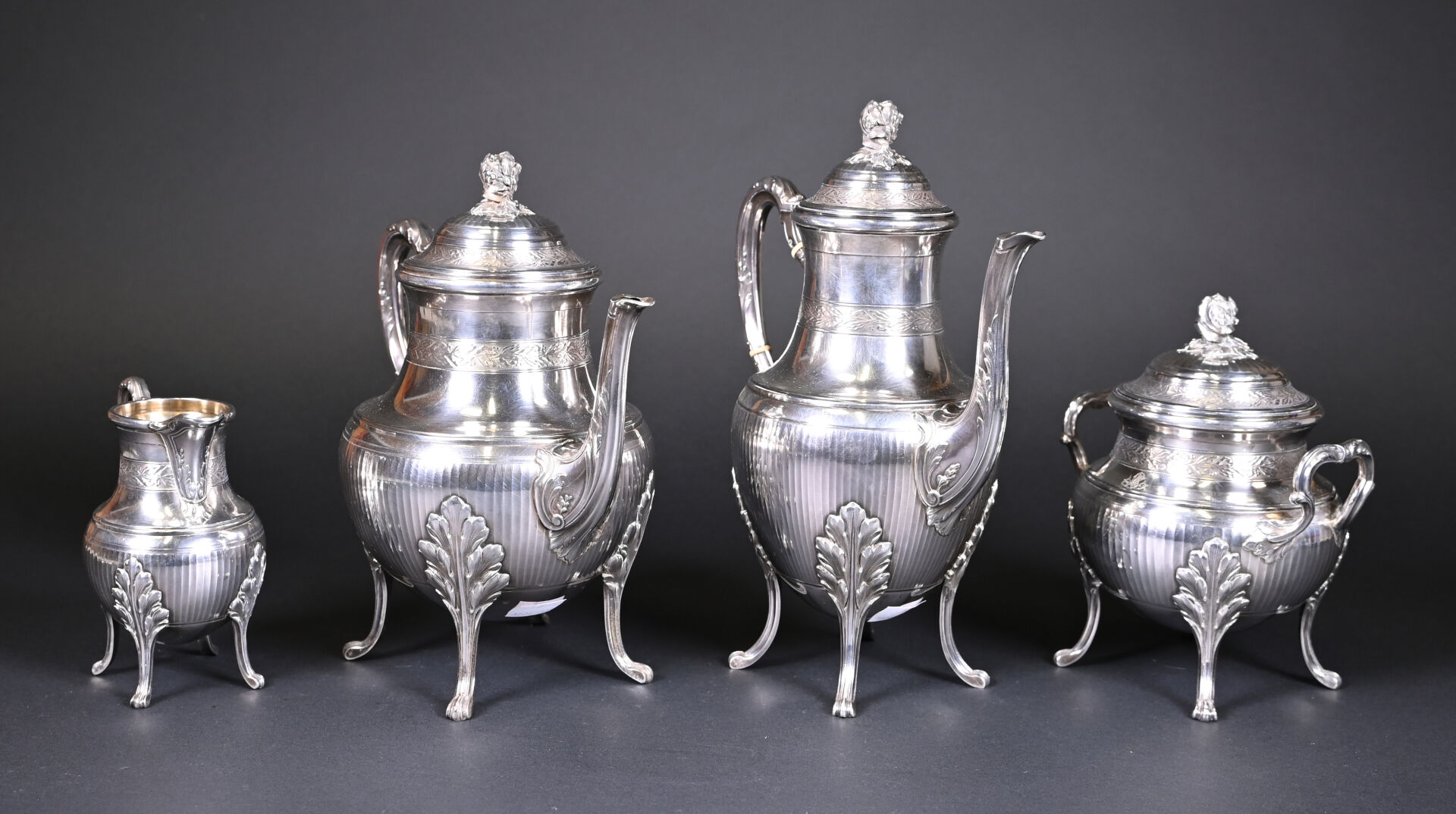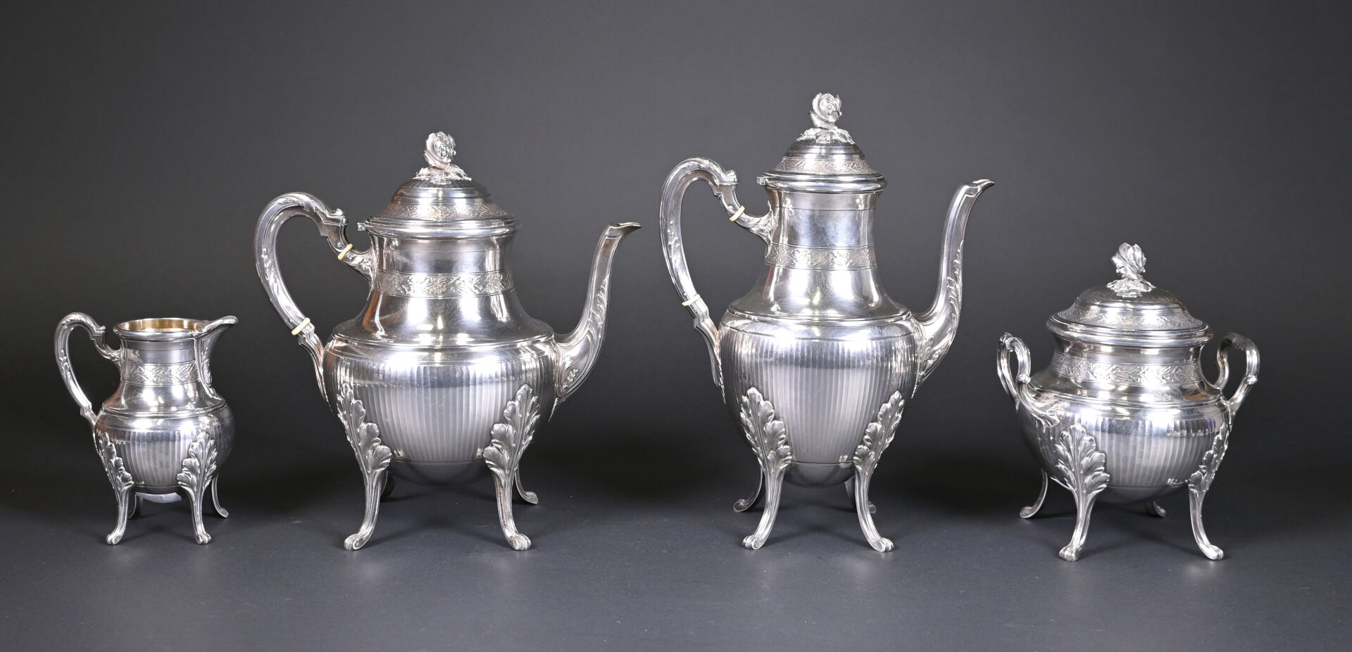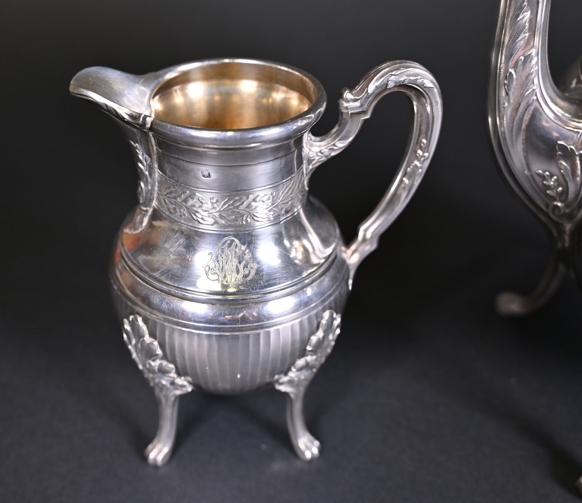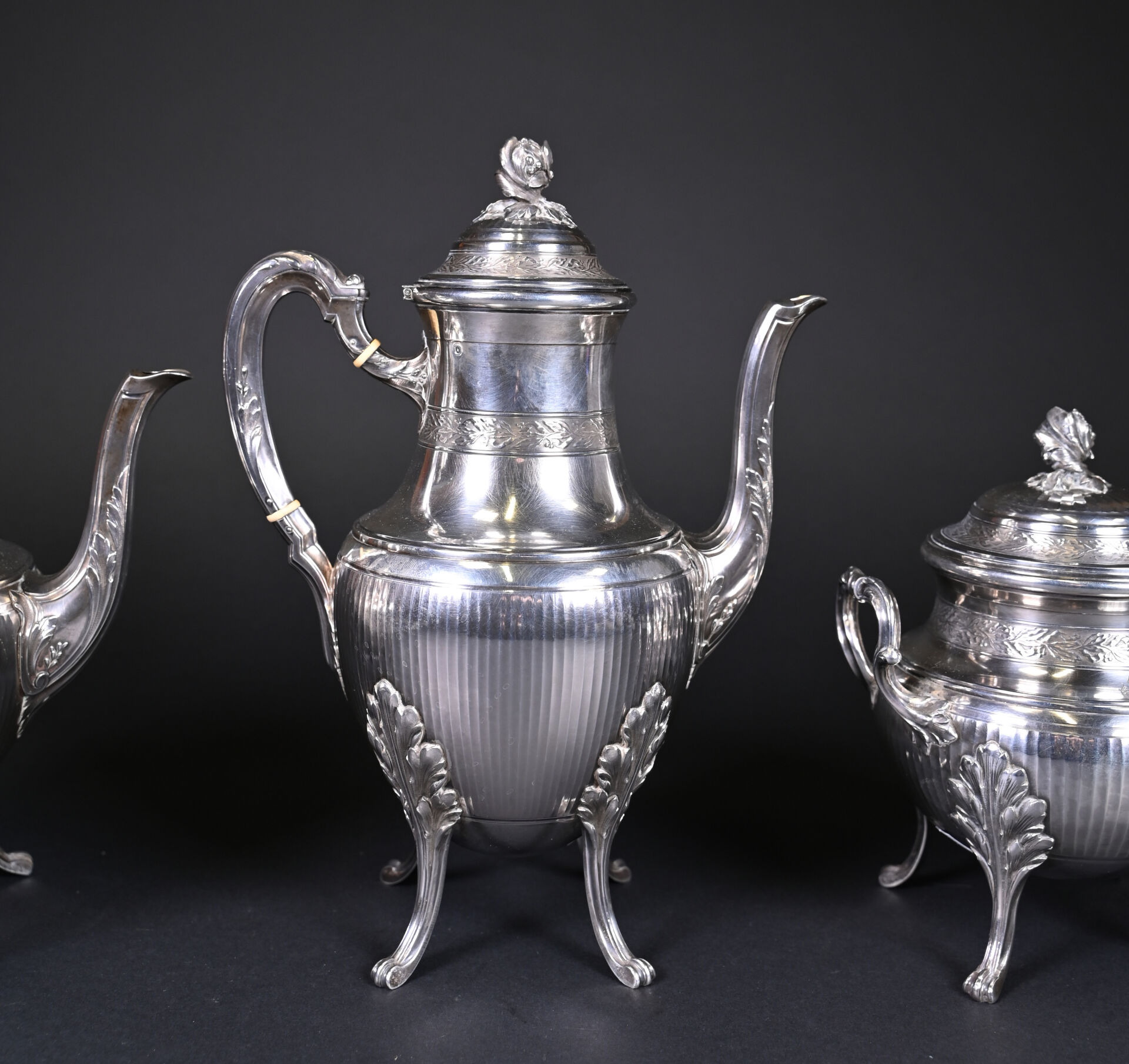 Service à thé en argent 925/1000e à décor de frises de laurier, acanthes et cannelures, chiffré LM. Il comprend deux théières, un pot à sucre et un pot à lait.Haut. de la plus grande théière : 26 cm. Poids brut total. : 2 461 g. On joint une pince à sucre en argent 925/1000e. Poids : 61 g.