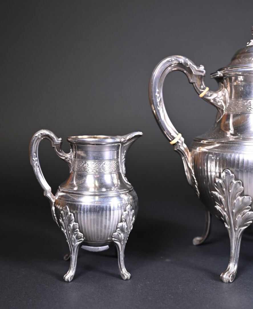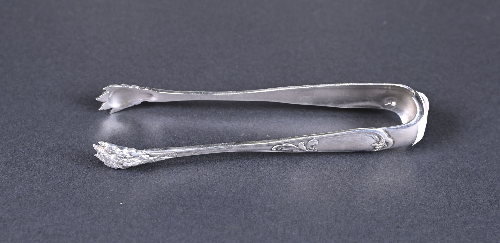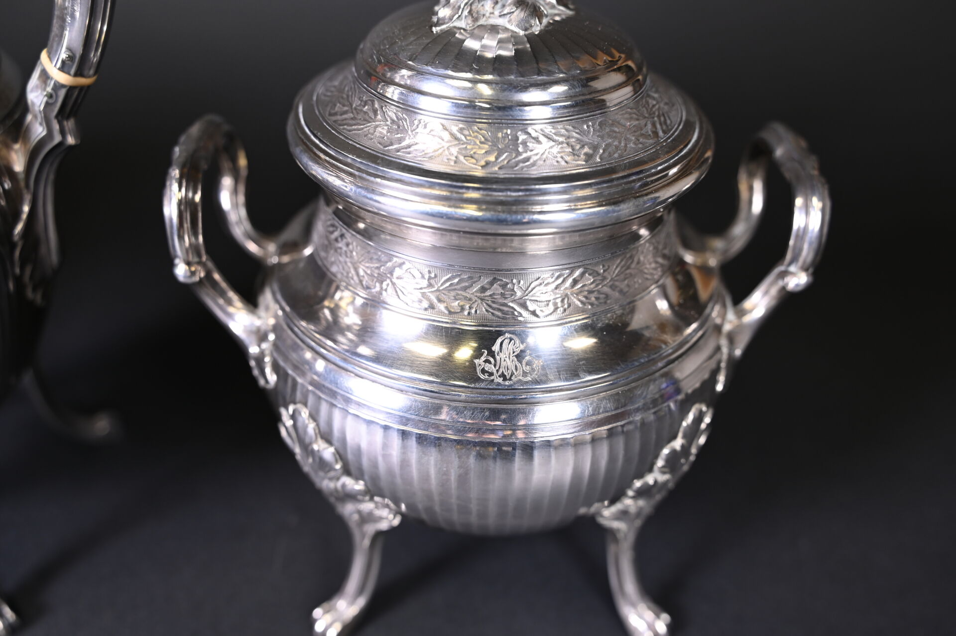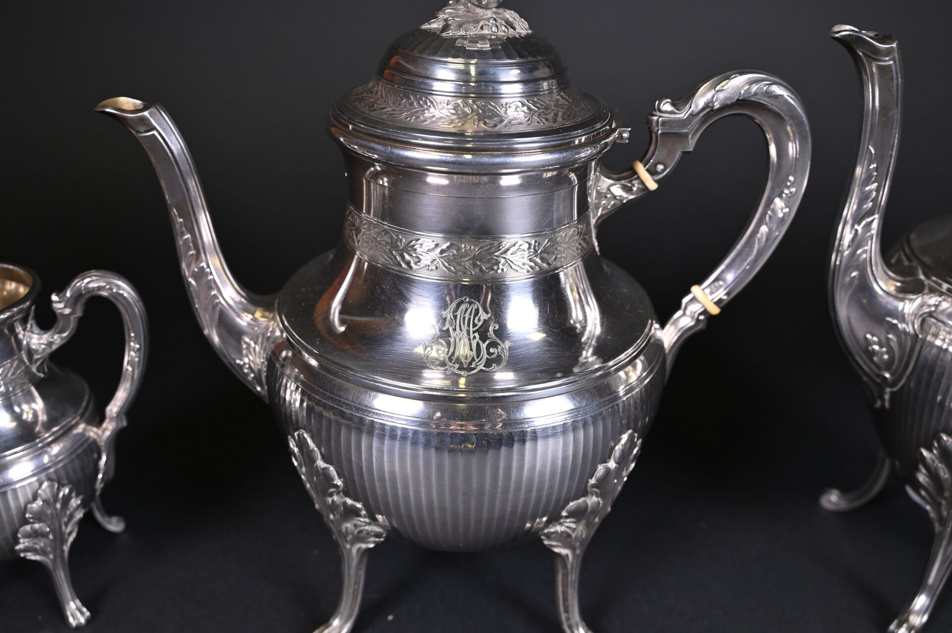 Service à thé en argent 925/1000e à décor de frises de laurier, acanthes et cannelures, chiffré LM. Il comprend deux théières, un pot à sucre et un pot à lait.Haut. de la plus grande théière : 26 cm. Poids brut total. : 2 461 g. On joint une pince à sucre en argent 925/1000e. Poids : 61 g.
