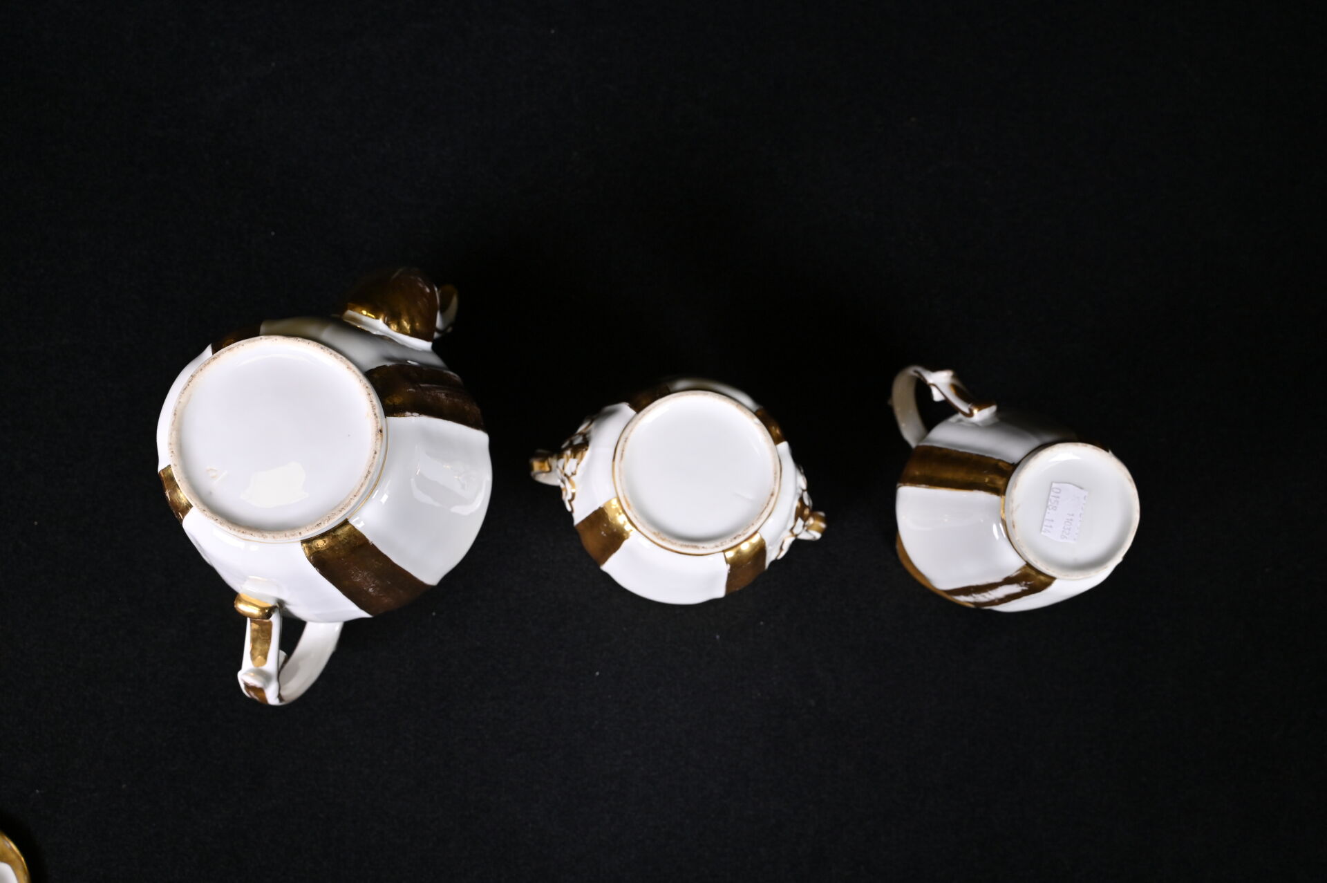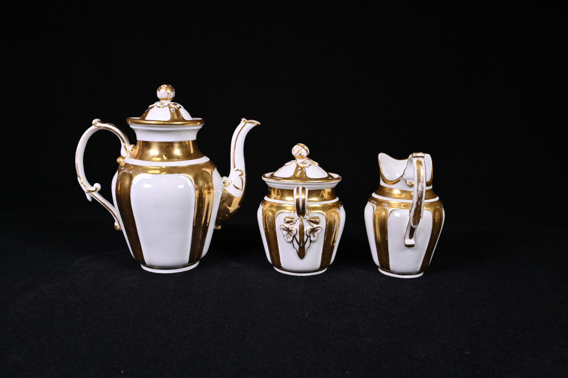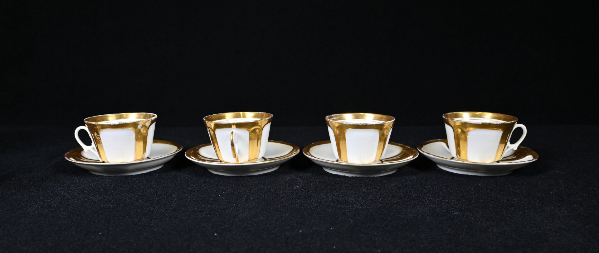 Service à thé en porcelaine blanche à déco en dorure comprenant 4 tasses et sous-tasses, 1 théière, 1 sucrier, 1 pot à lait (usures). Paris, XIXe siècle.