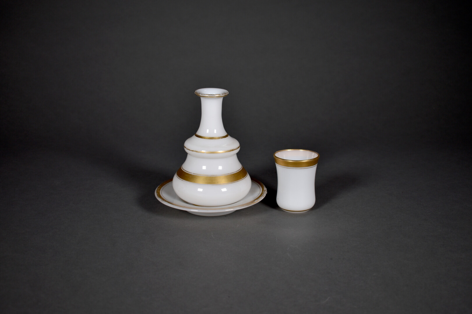 Service de nuit en opaline blanche à liseré or (quelques usures à la dorrure). Vers 1900. Haut. totale : 18 cm.