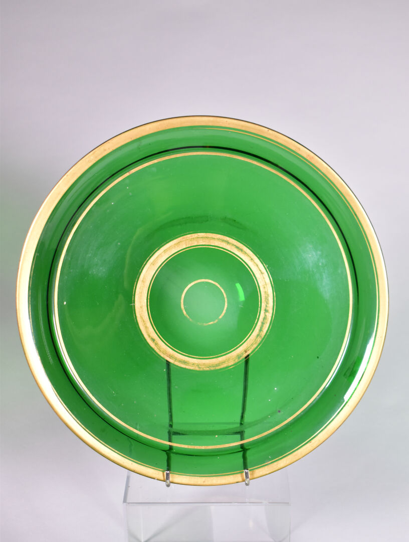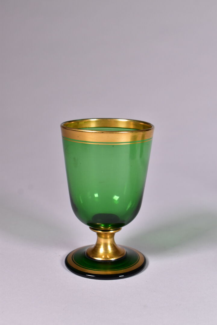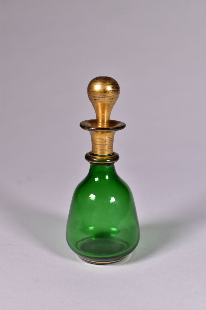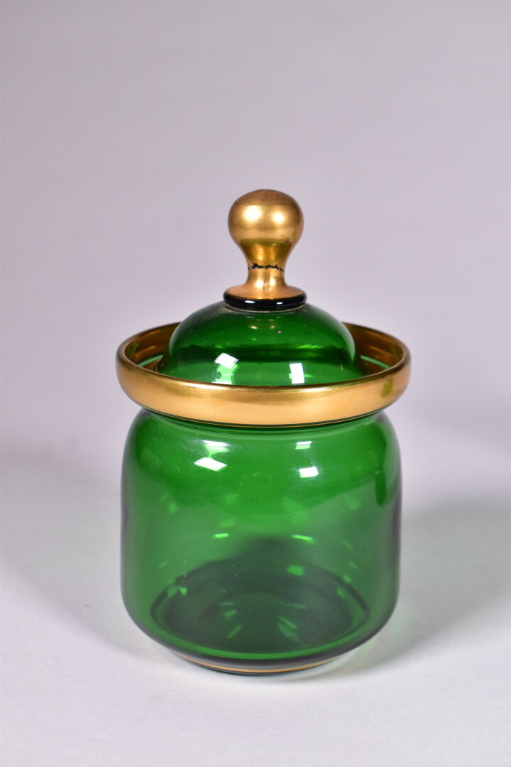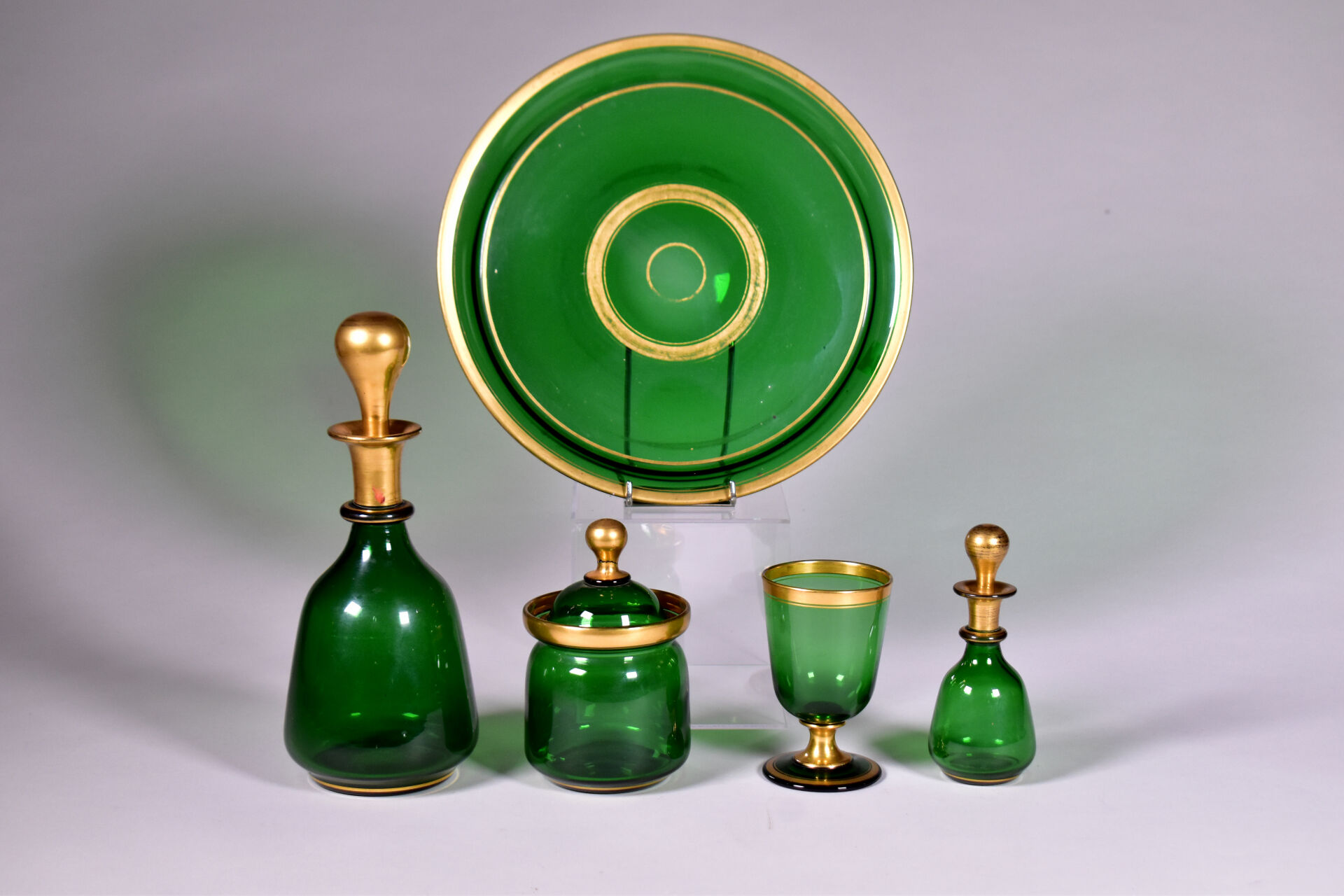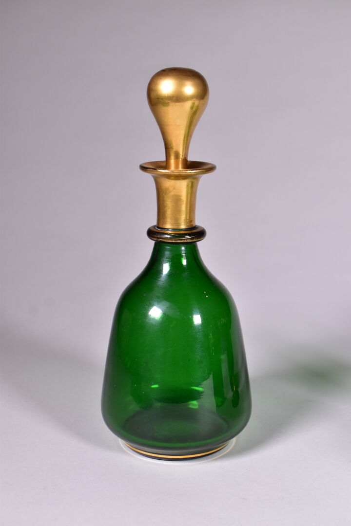 Service de nuit en verre vert et liseré or comprenant un plateau, un verre, une carafe, un flacon et un pot à sucre (un accident recollé sur le bouton de prise du couvercle, usures). Vers 1900. Haut. de la carafe : 26 cm.