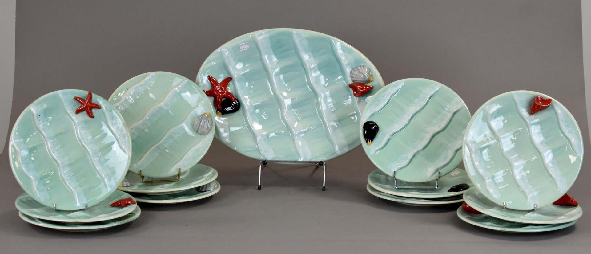 Service de table à poisson en barbotine à décor en haut relief de vagues et coquillages comprenant un plat de service et douze assiettes (petits éclats au dessous). Dim. plat : 42 x 30 cm.