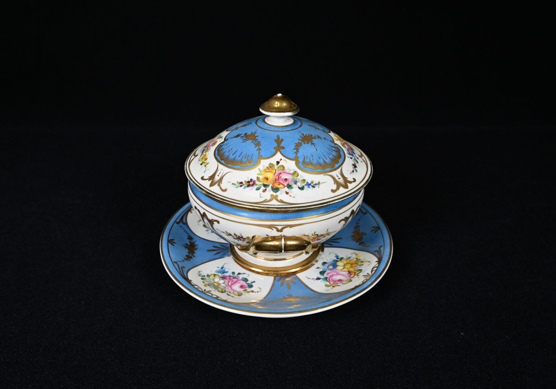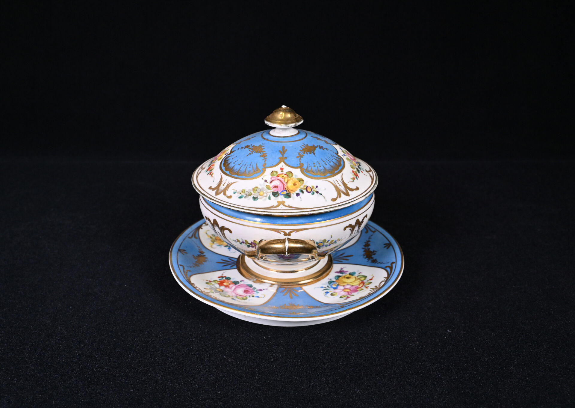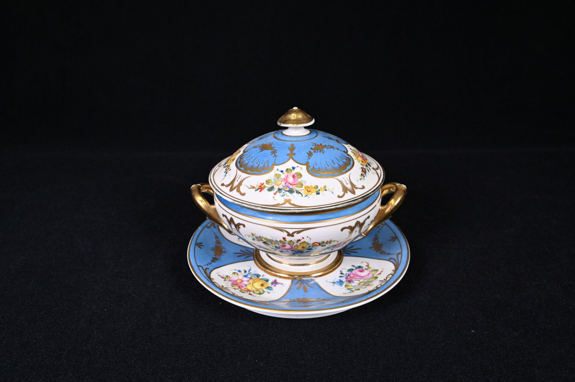 SEVRES. Légumier et son plateau en porcelaine à décor de fleurs dans des réserves sur fond bleu ciel et dorure (usures, fèles de cuisson à la base du légumier). Marqués au dessous. XIXe siècle.