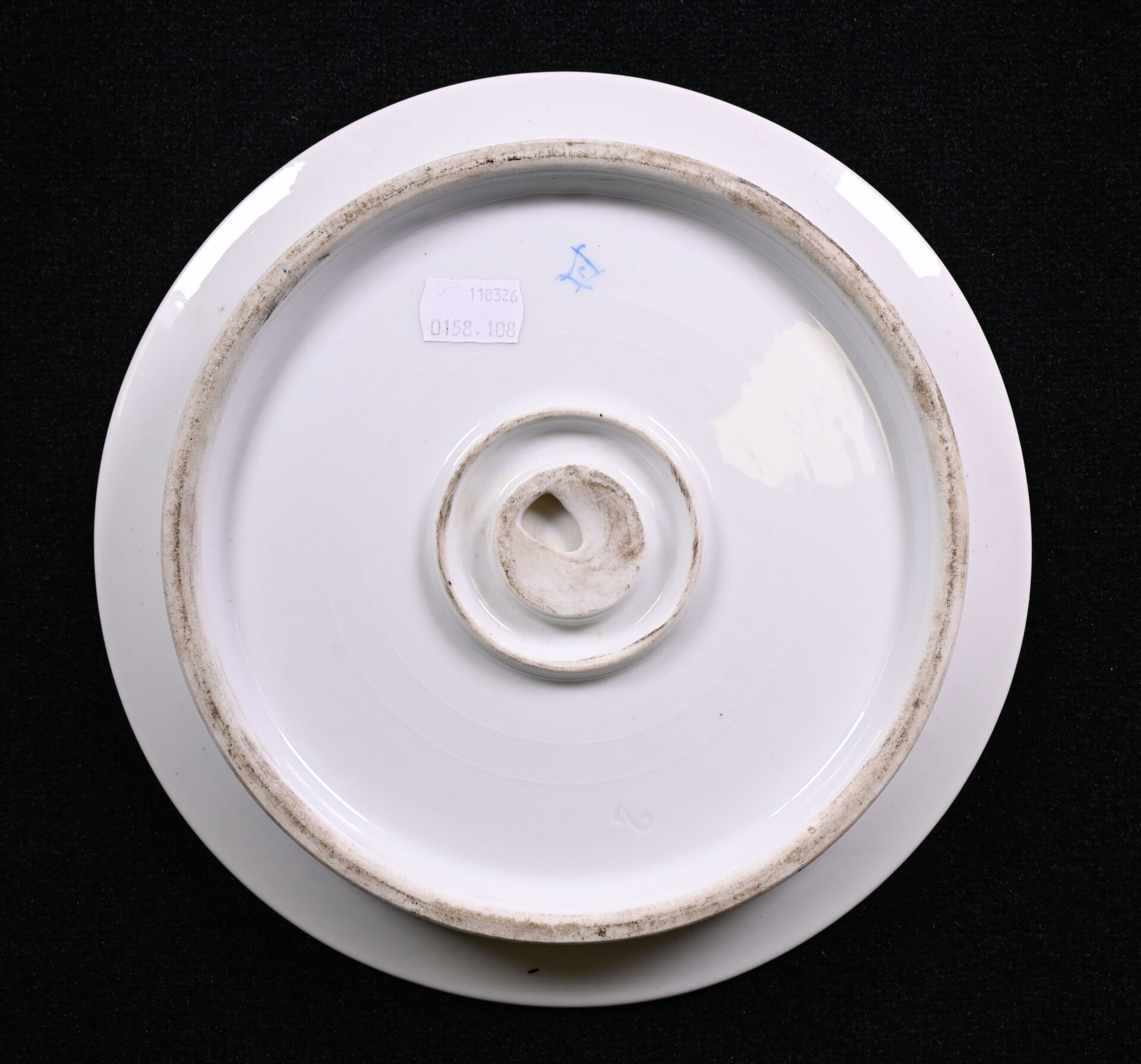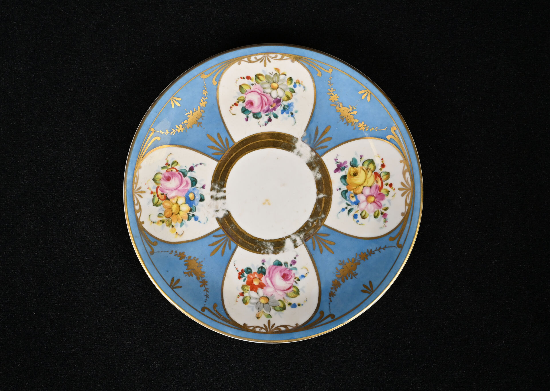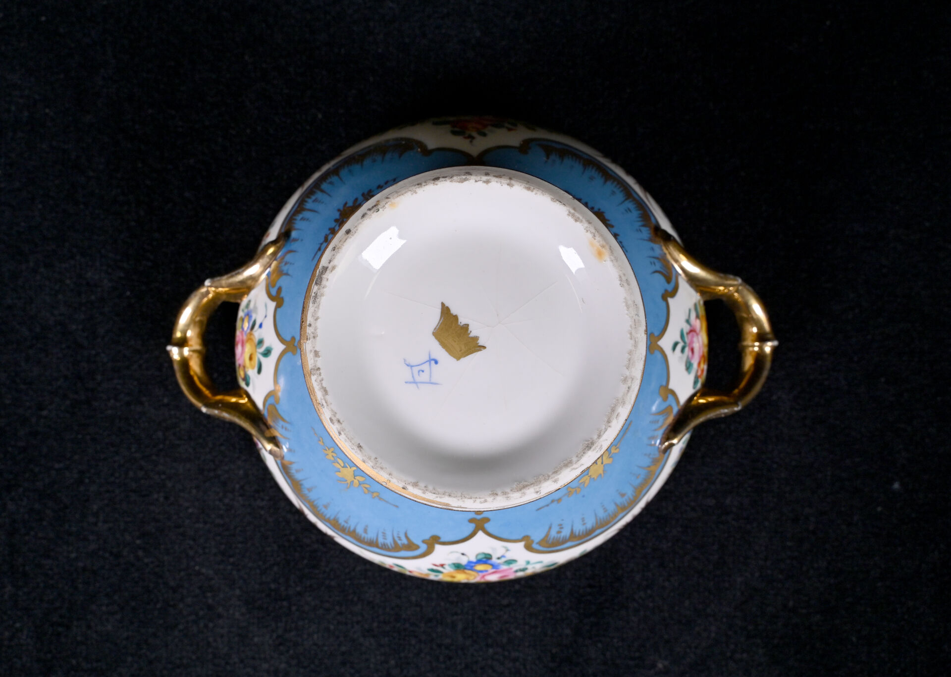 SEVRES. Légumier et son plateau en porcelaine à décor de fleurs dans des réserves sur fond bleu ciel et dorure (usures, fèles de cuisson à la base du légumier). Marqués au dessous. XIXe siècle.