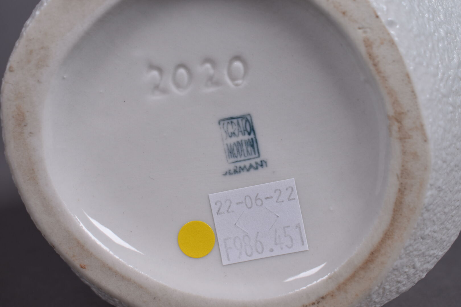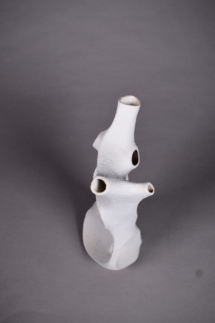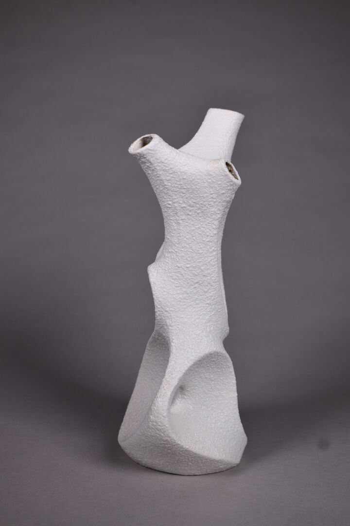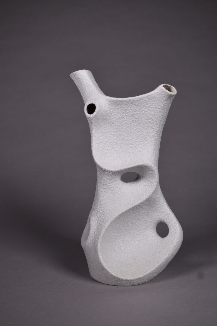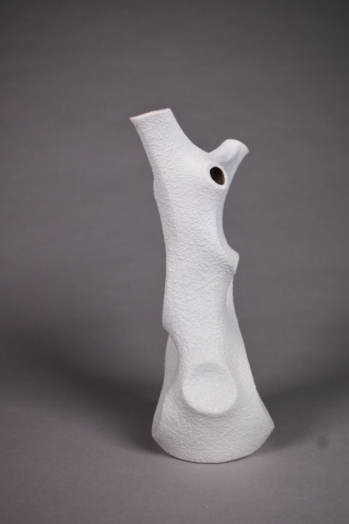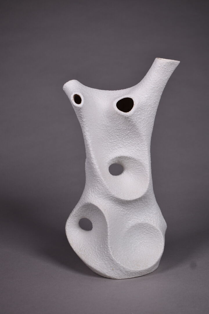 SGRAFO Modern. vase de forme libre ajouré en céramique émaillée crème. Marqué. Haut. : 28 cm.