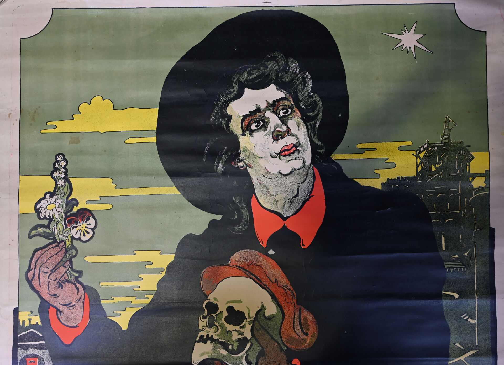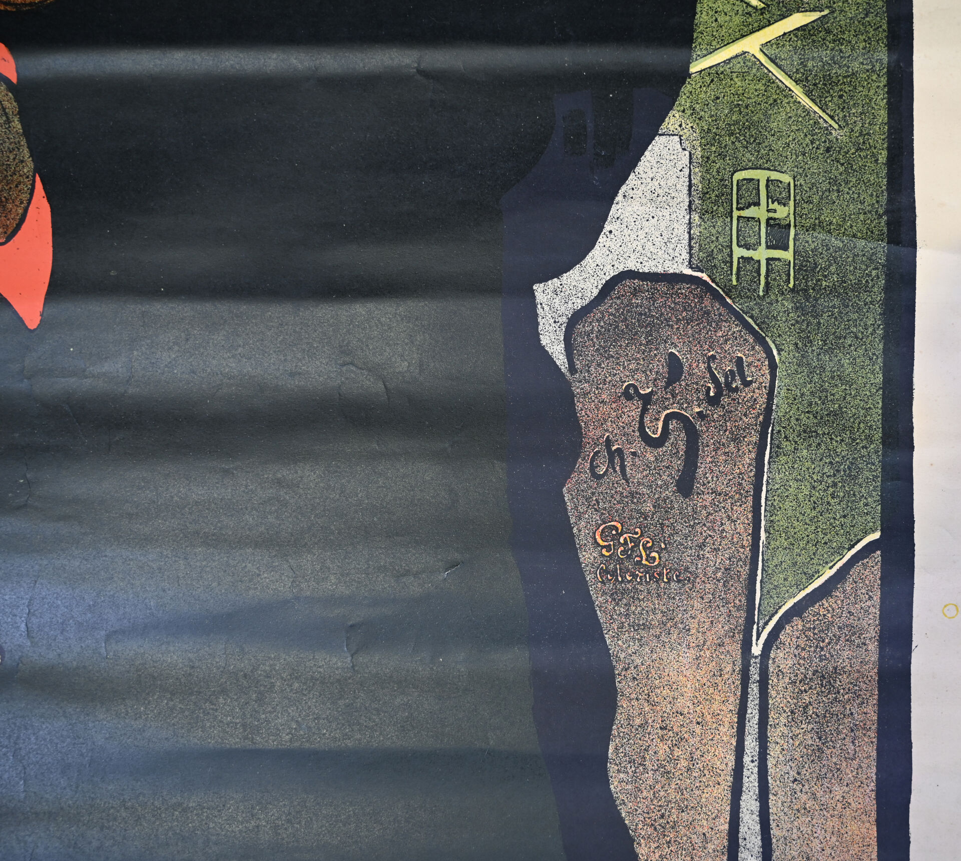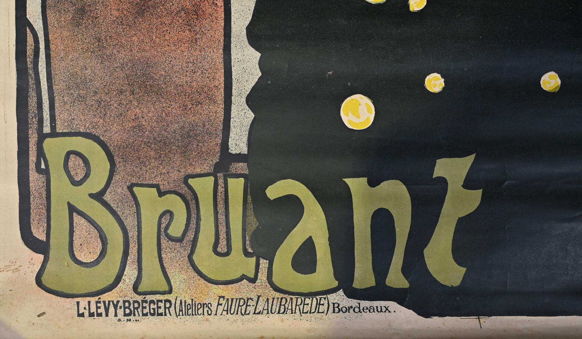 Signature difficilement lisible. Bruant. Circa 1890. Affiche lithographique. L. Lévy Breger (Ateliers Faure-Laubarede) Bordeaux. Non entoilée, bon état : couleurs vives et fraîches, pliures, salissures. 131 x 104,5 cm.