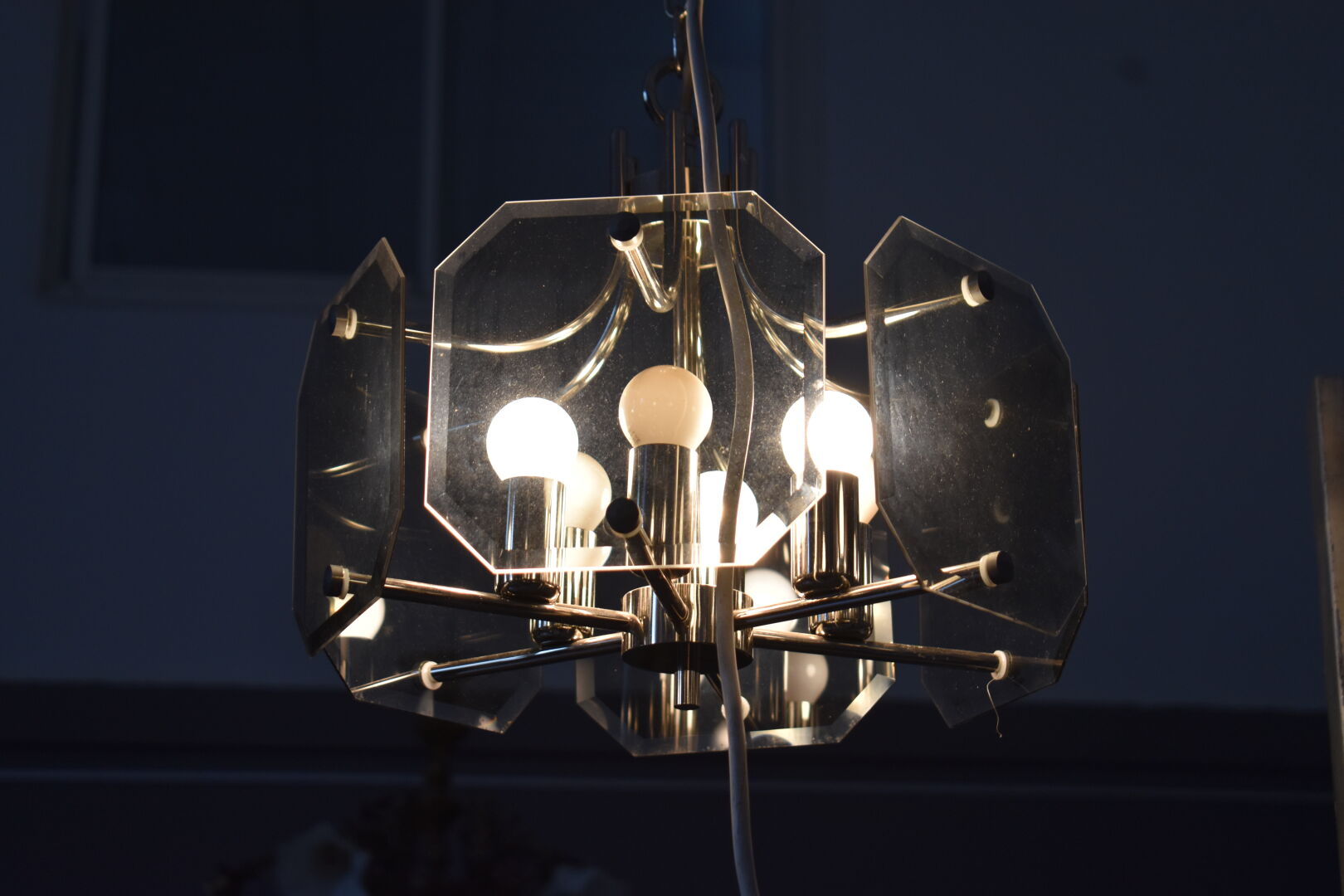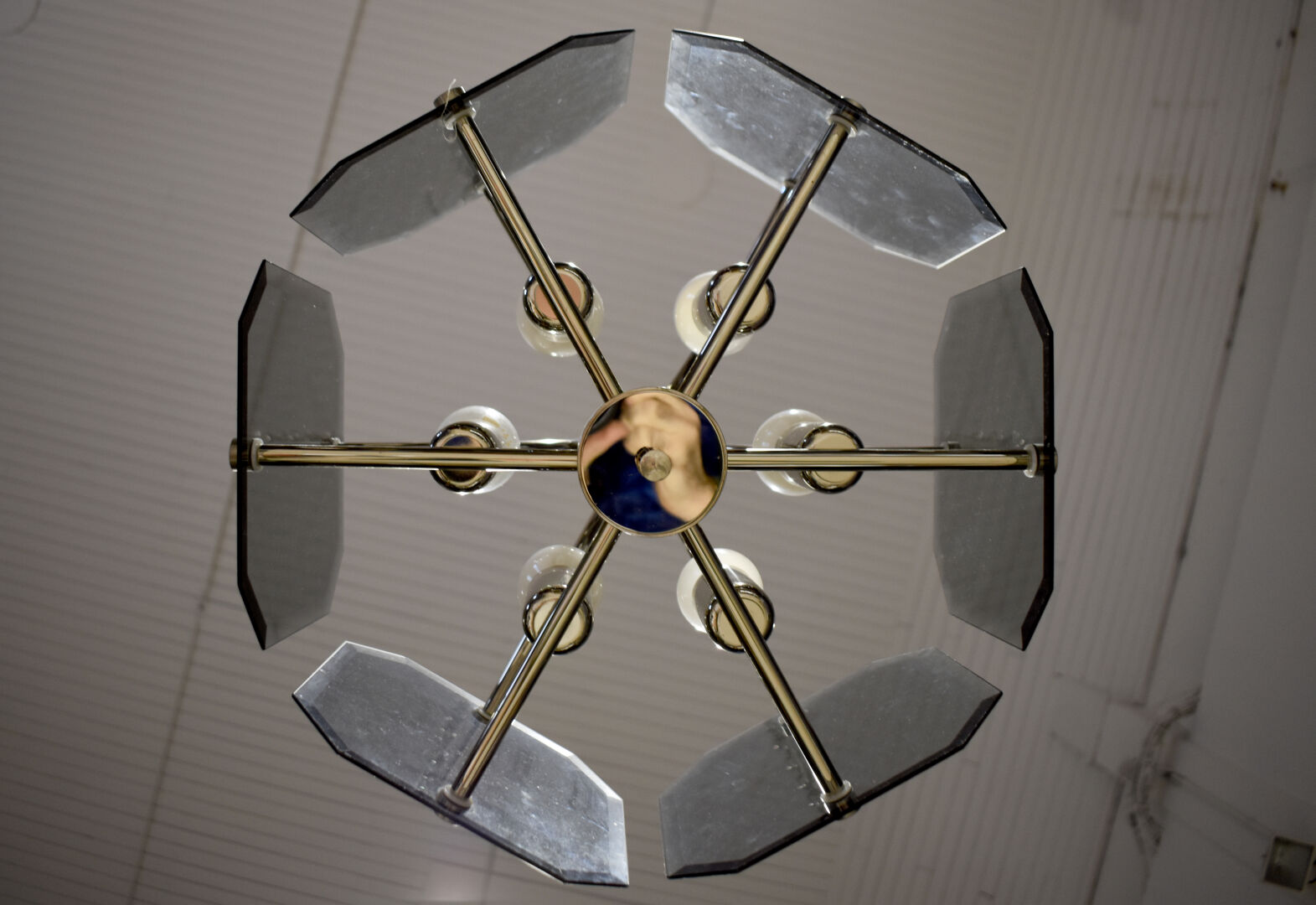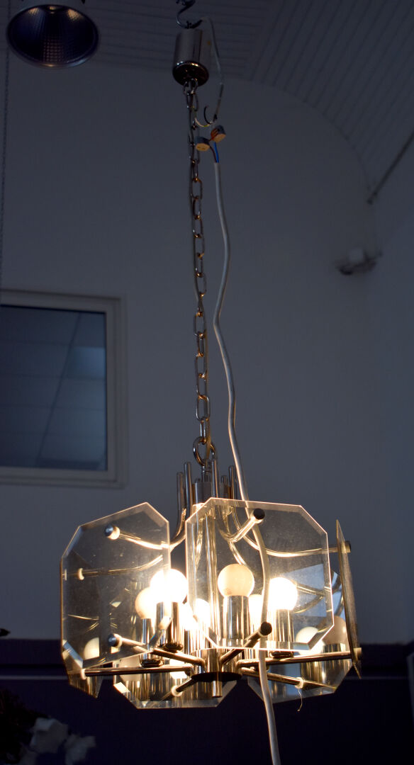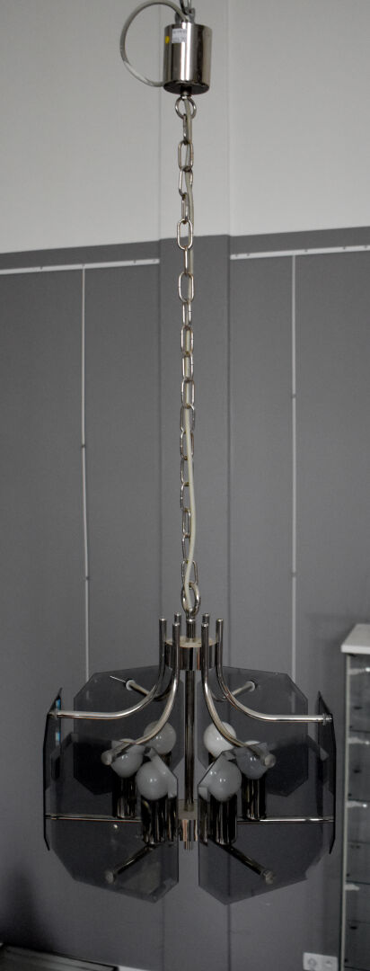SISCHE. Lustre à 6 lumières en métal chromé et panneaux de verre fumé biseauté. Vers 1970/1980. Haut. : 103 cm.