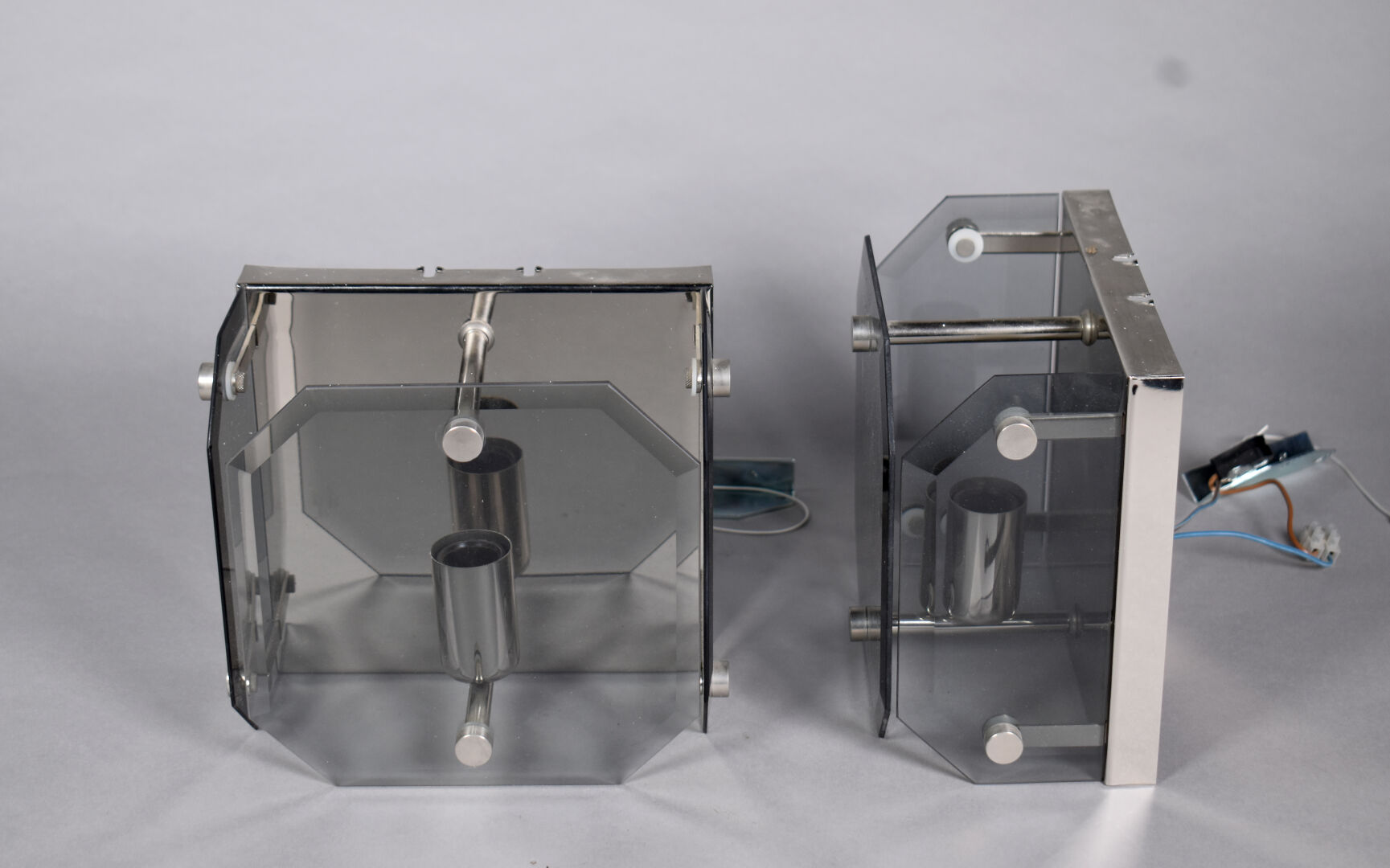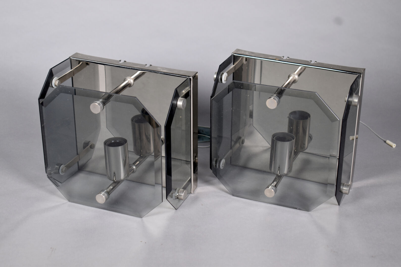 SISCHE. Paire d’appliques de section hexagonale en métal chromé et verre biseauté légèrement fumé (une égrenure et un petit éclat). 18 x 19 cm.