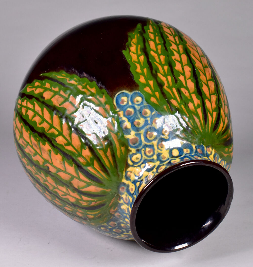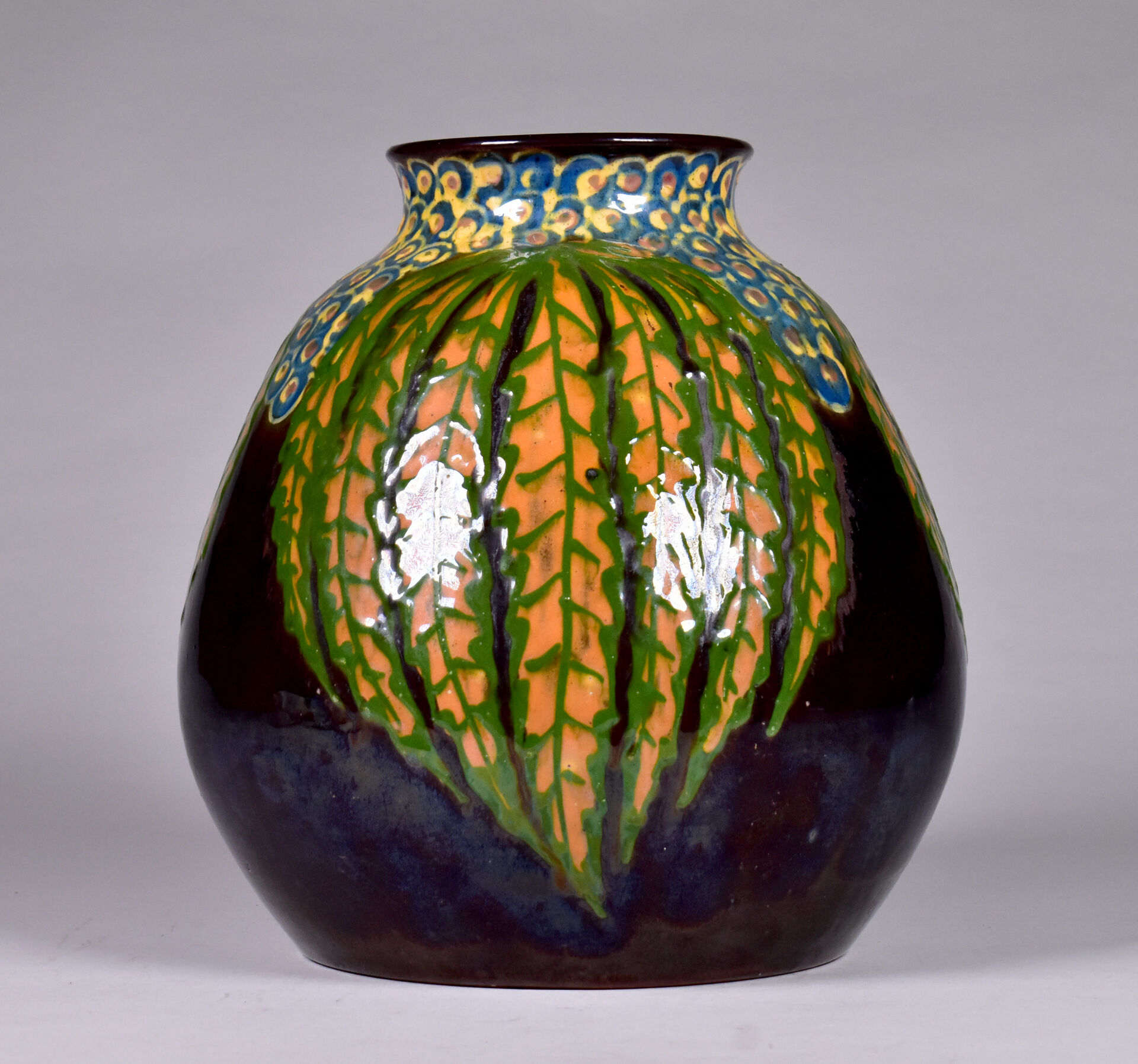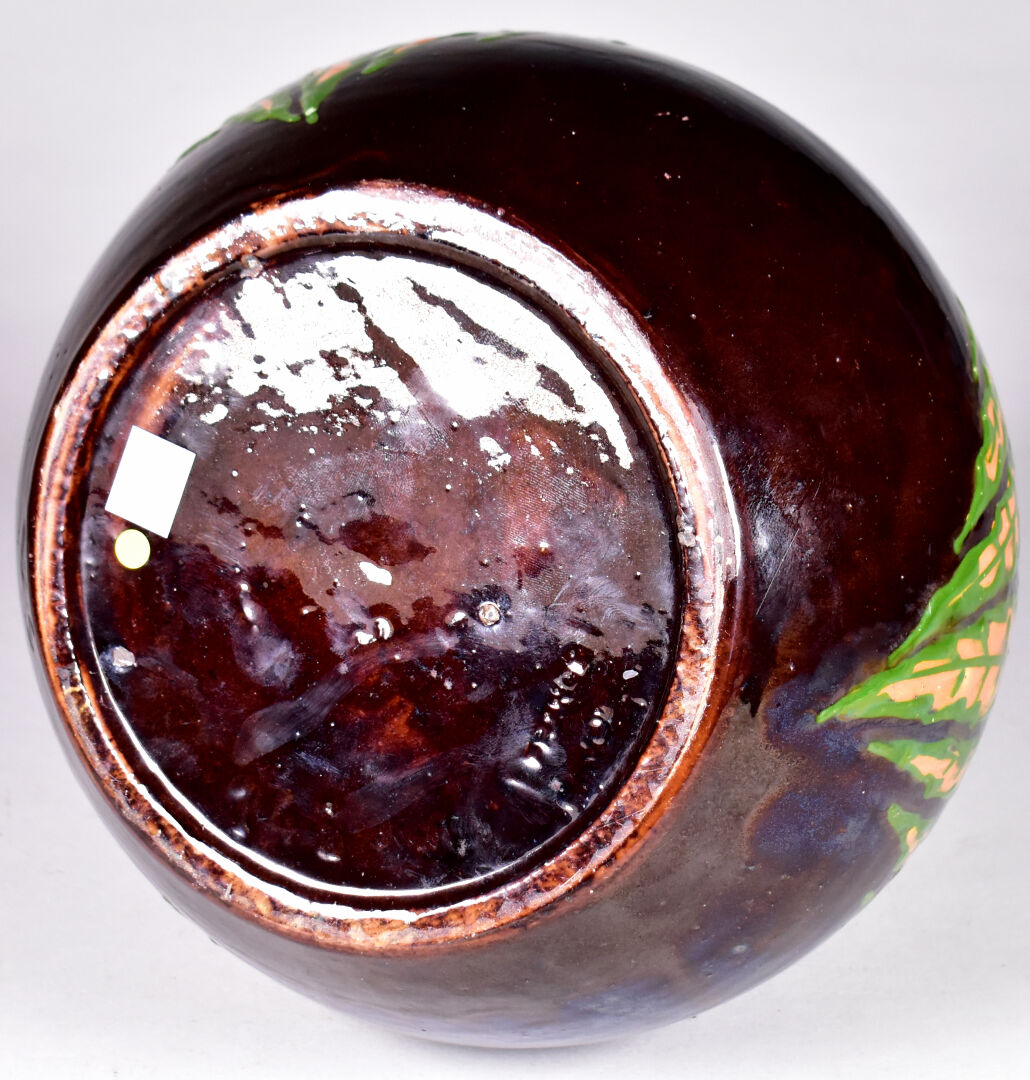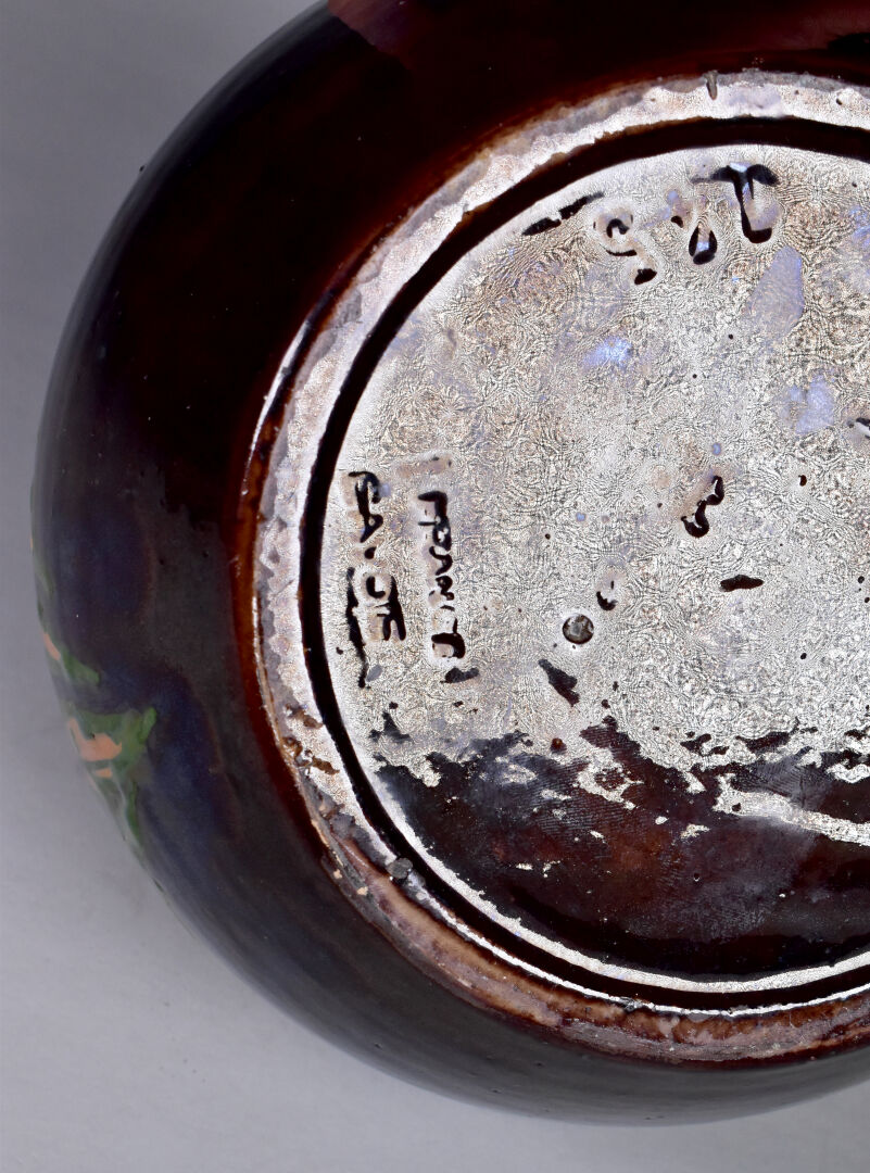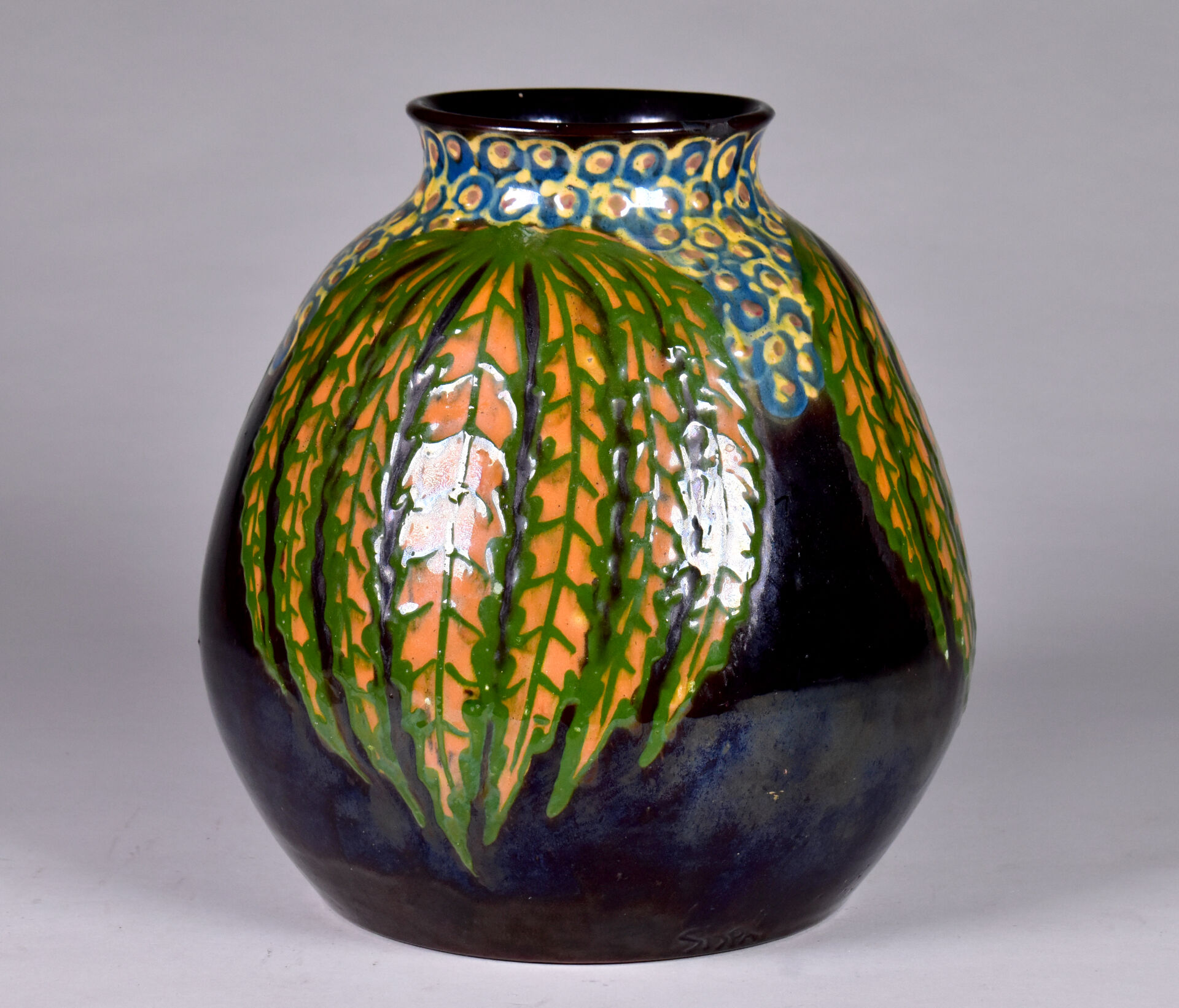 SISPA – Emile SIMONOD (1893-1977). Vase piriforme à col resserré en céramique émaillée en polychromie d’un décor végétal sur fond brun irisé (un saut d’émail au col, un autre très petit dans le décor). Signé SISPA à la base et marqué SAVOIE et numéroté 145 au dessous. Haut. : 25 cm.