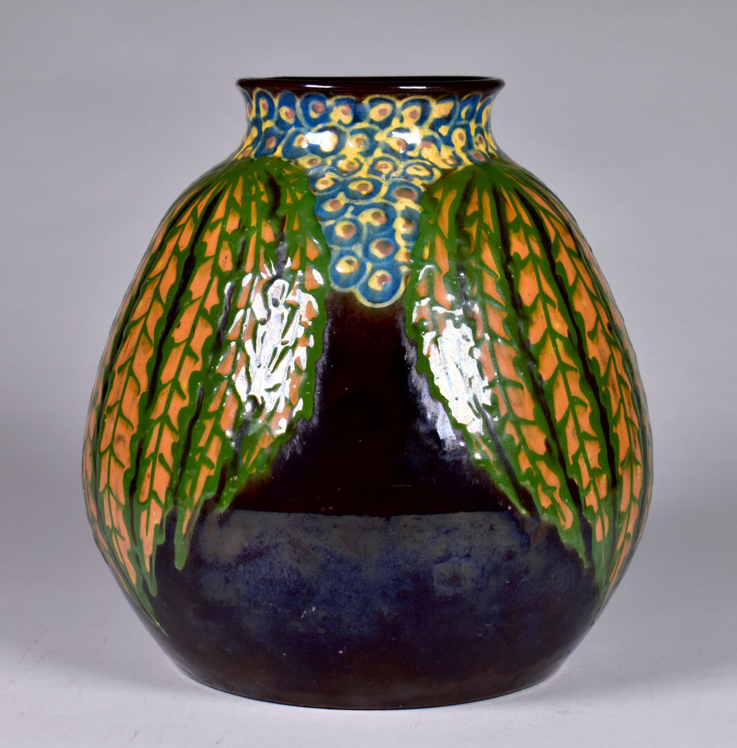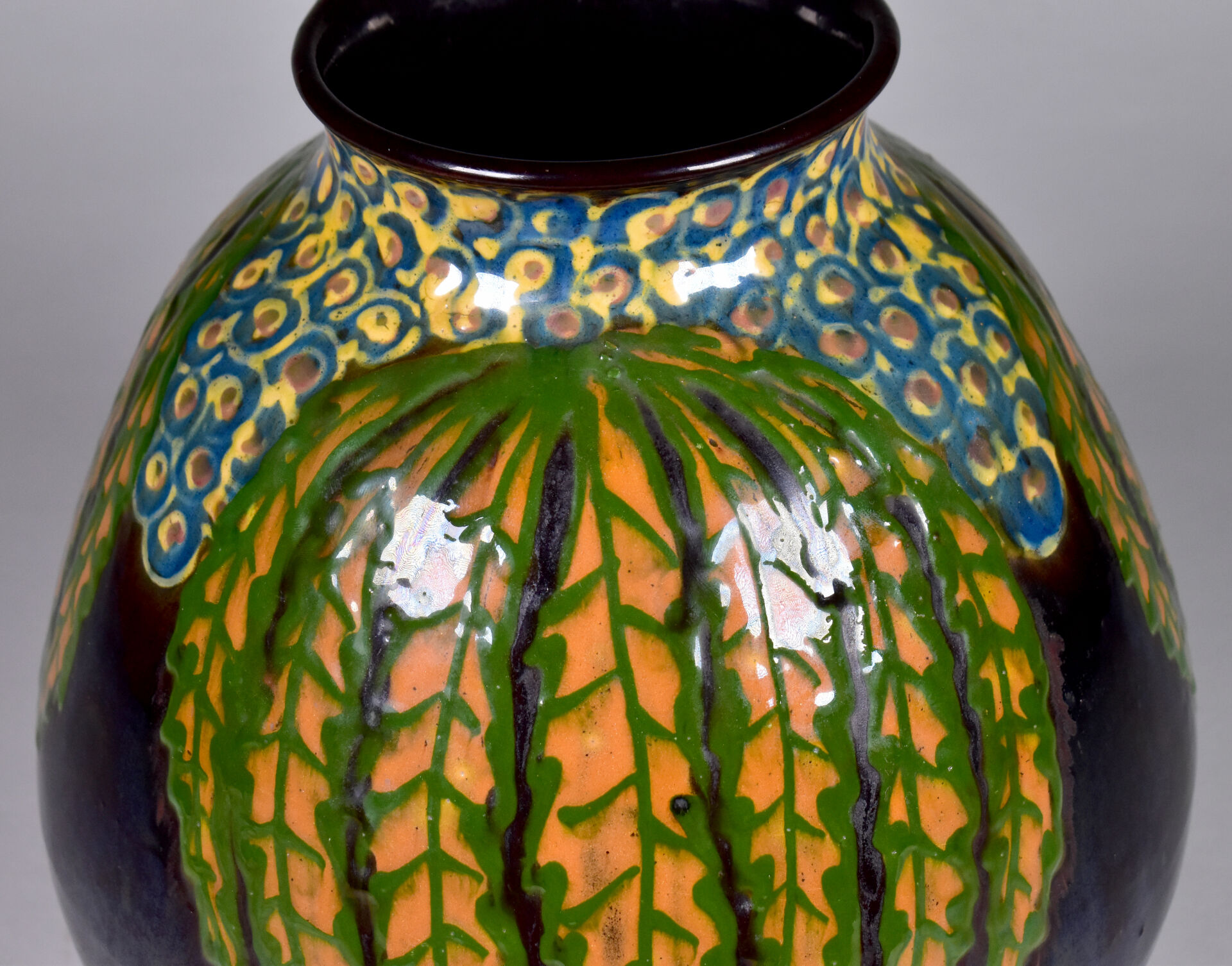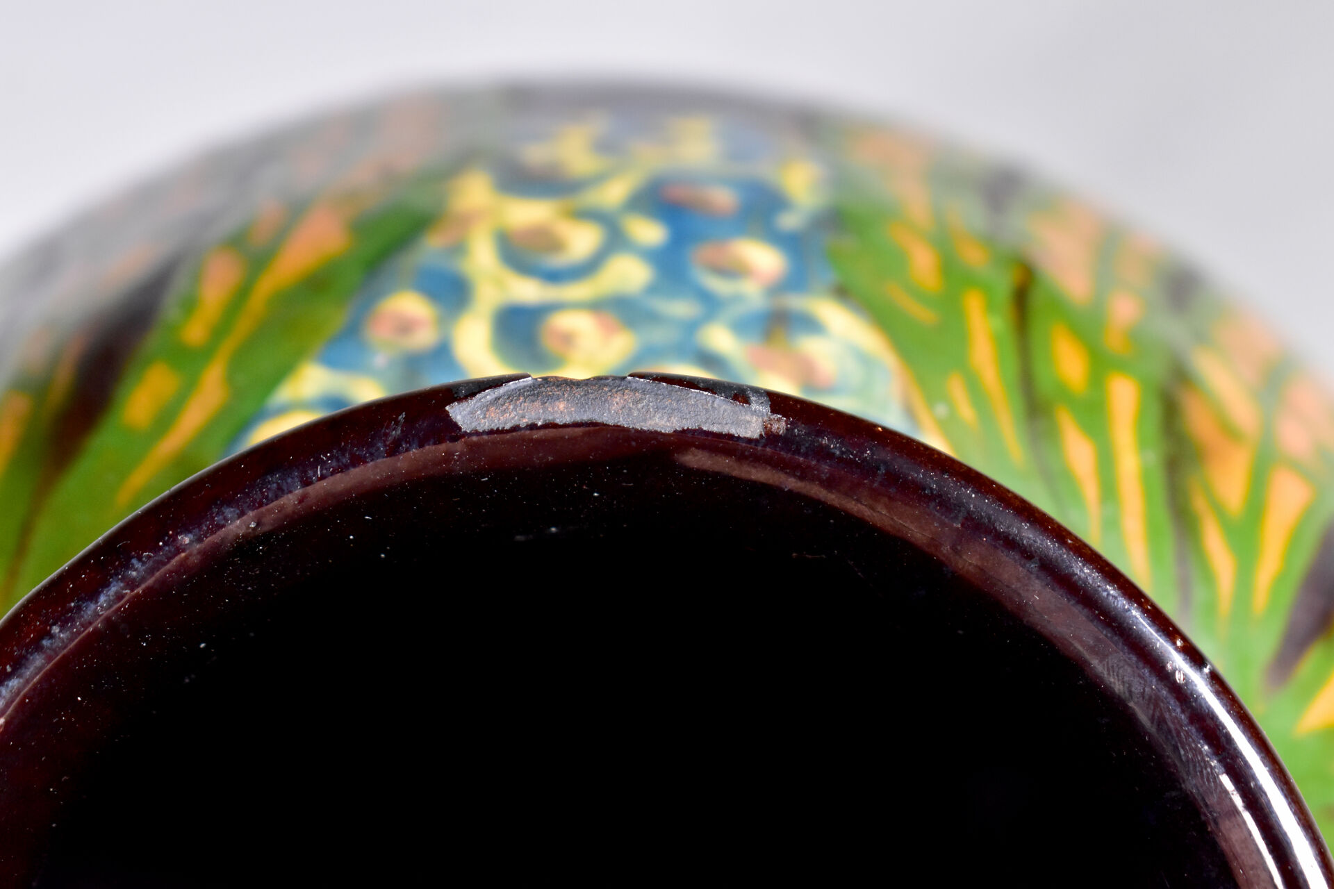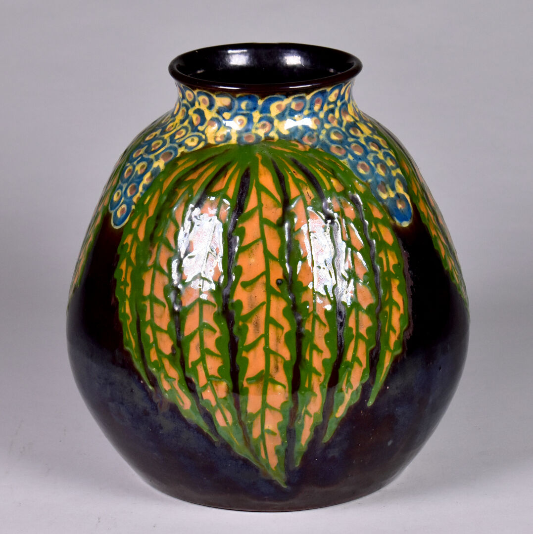 SISPA – Emile SIMONOD (1893-1977). Vase piriforme à col resserré en céramique émaillée en polychromie d’un décor végétal sur fond brun irisé (un saut d’émail au col, un autre très petit dans le décor). Signé SISPA à la base et marqué SAVOIE et numéroté 145 au dessous. Haut. : 25 cm.