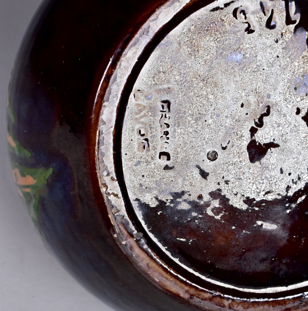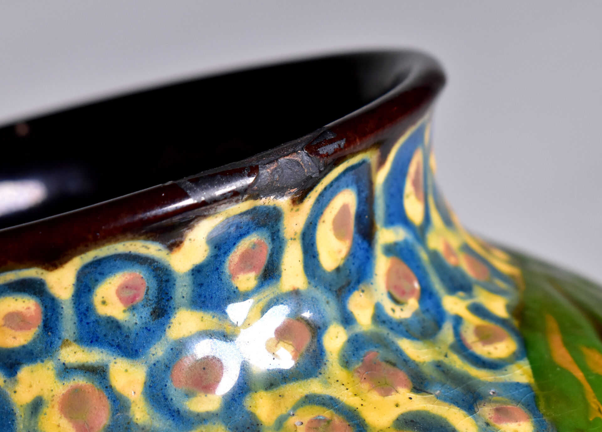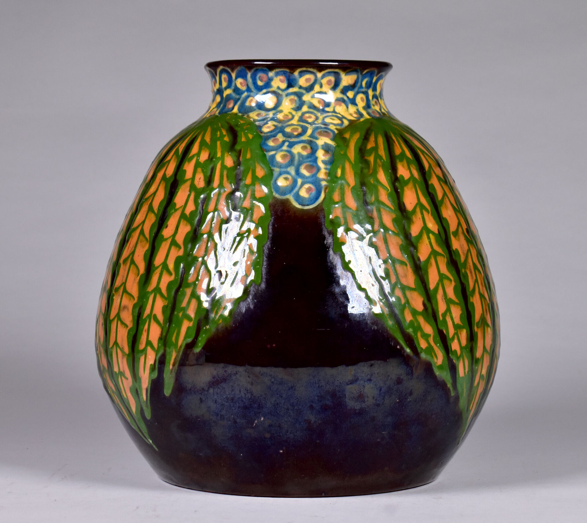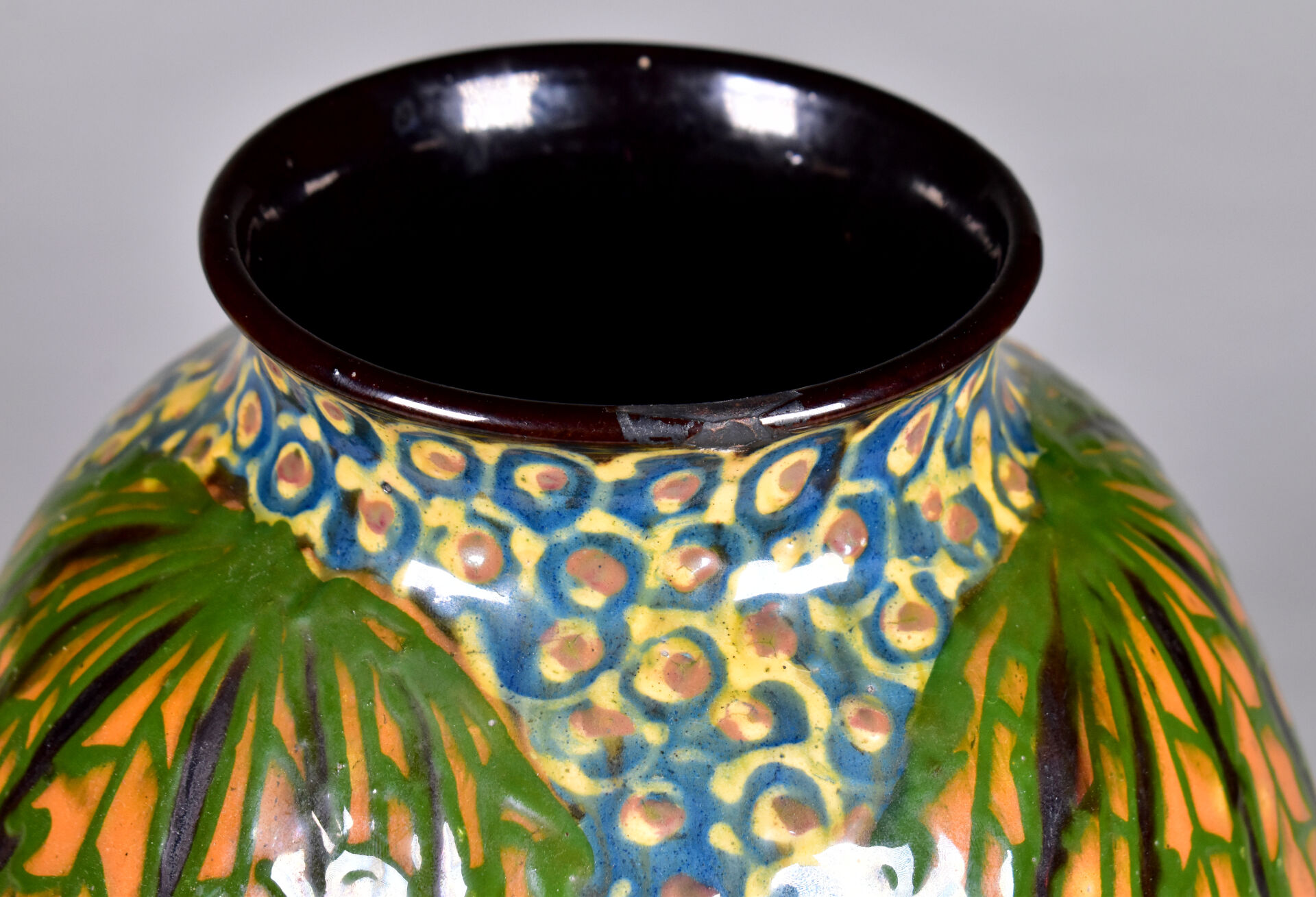 SISPA – Emile SIMONOD (1893-1977). Vase piriforme à col resserré en céramique émaillée en polychromie d’un décor végétal sur fond brun irisé (un saut d’émail au col, un autre très petit dans le décor). Signé SISPA à la base et marqué SAVOIE et numéroté 145 au dessous. Haut. : 25 cm.