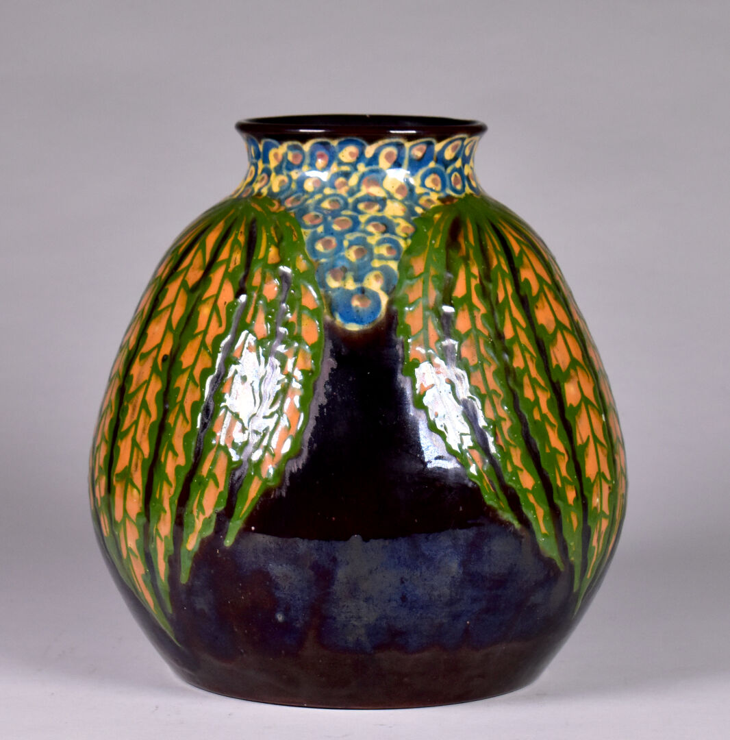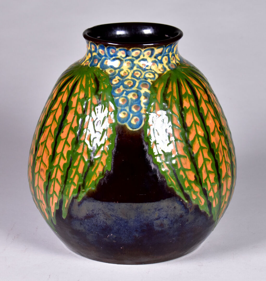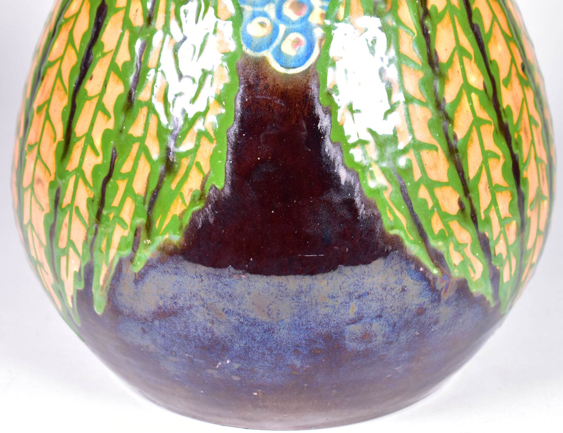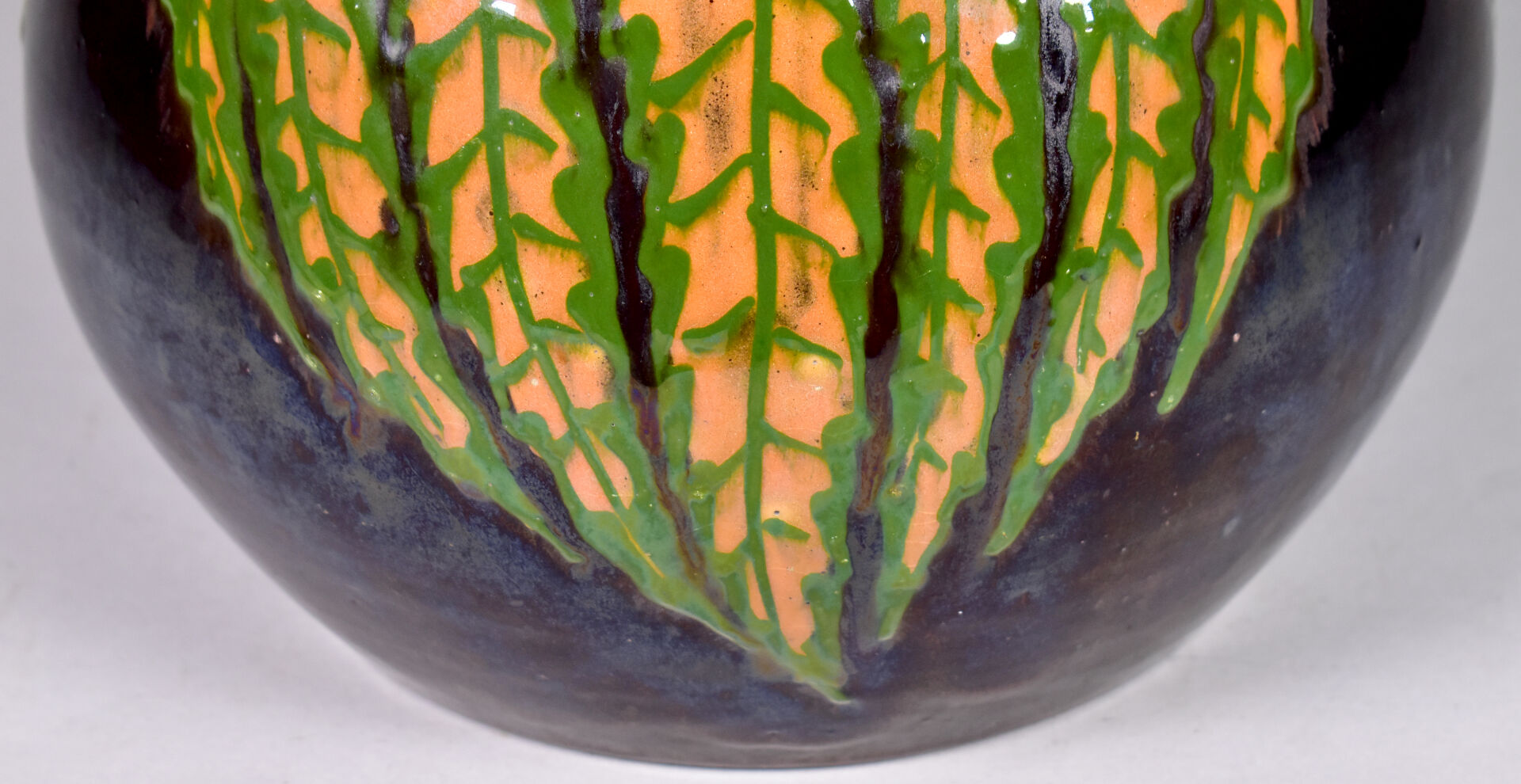 SISPA – Emile SIMONOD (1893-1977). Vase piriforme à col resserré en céramique émaillée en polychromie d’un décor végétal sur fond brun irisé (un saut d’émail au col, un autre très petit dans le décor). Signé SISPA à la base et marqué SAVOIE et numéroté 145 au dessous. Haut. : 25 cm.