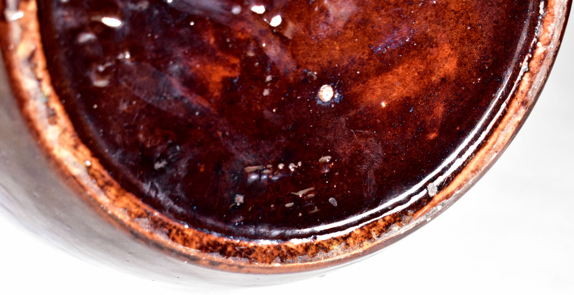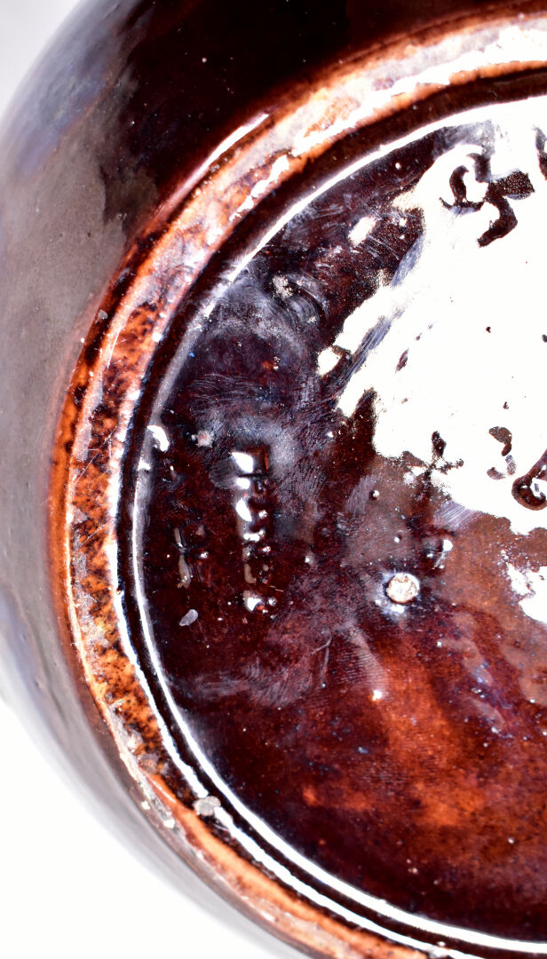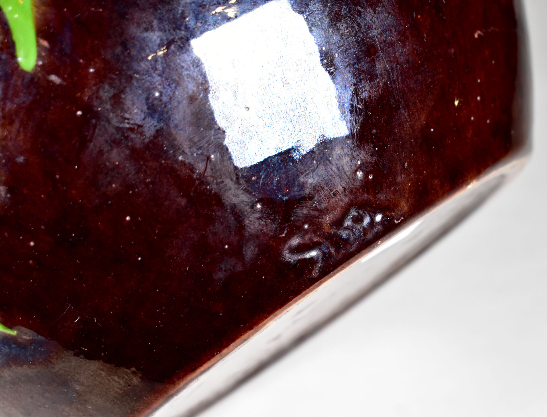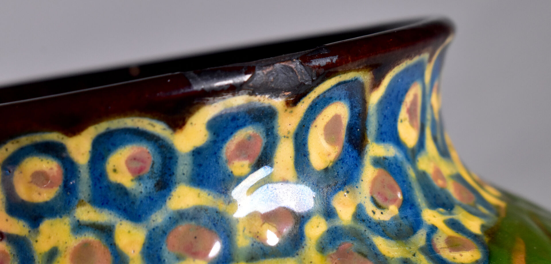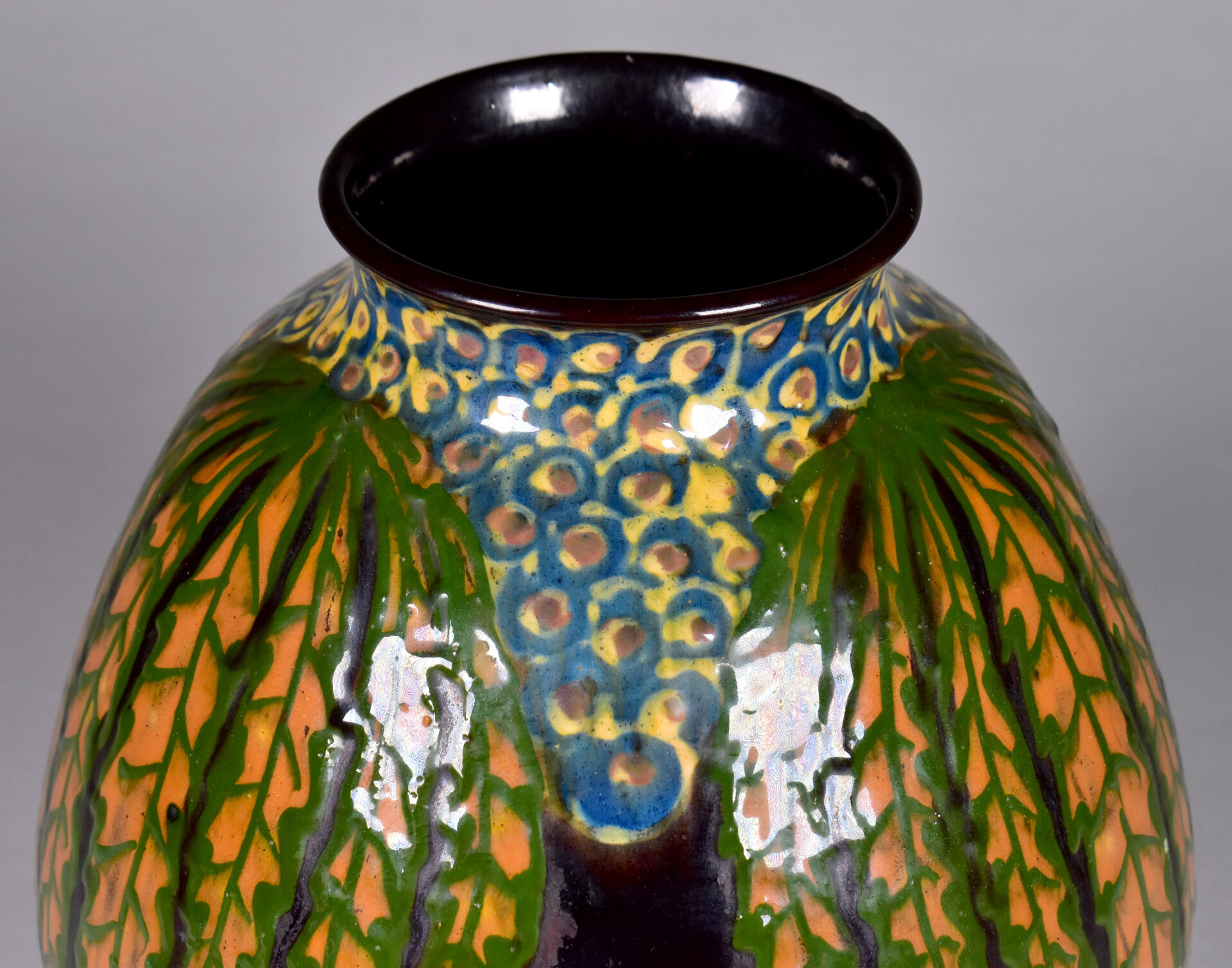 SISPA – Emile SIMONOD (1893-1977). Vase piriforme à col resserré en céramique émaillée en polychromie d’un décor végétal sur fond brun irisé (un saut d’émail au col, un autre très petit dans le décor). Signé SISPA à la base et marqué SAVOIE et numéroté 145 au dessous. Haut. : 25 cm.