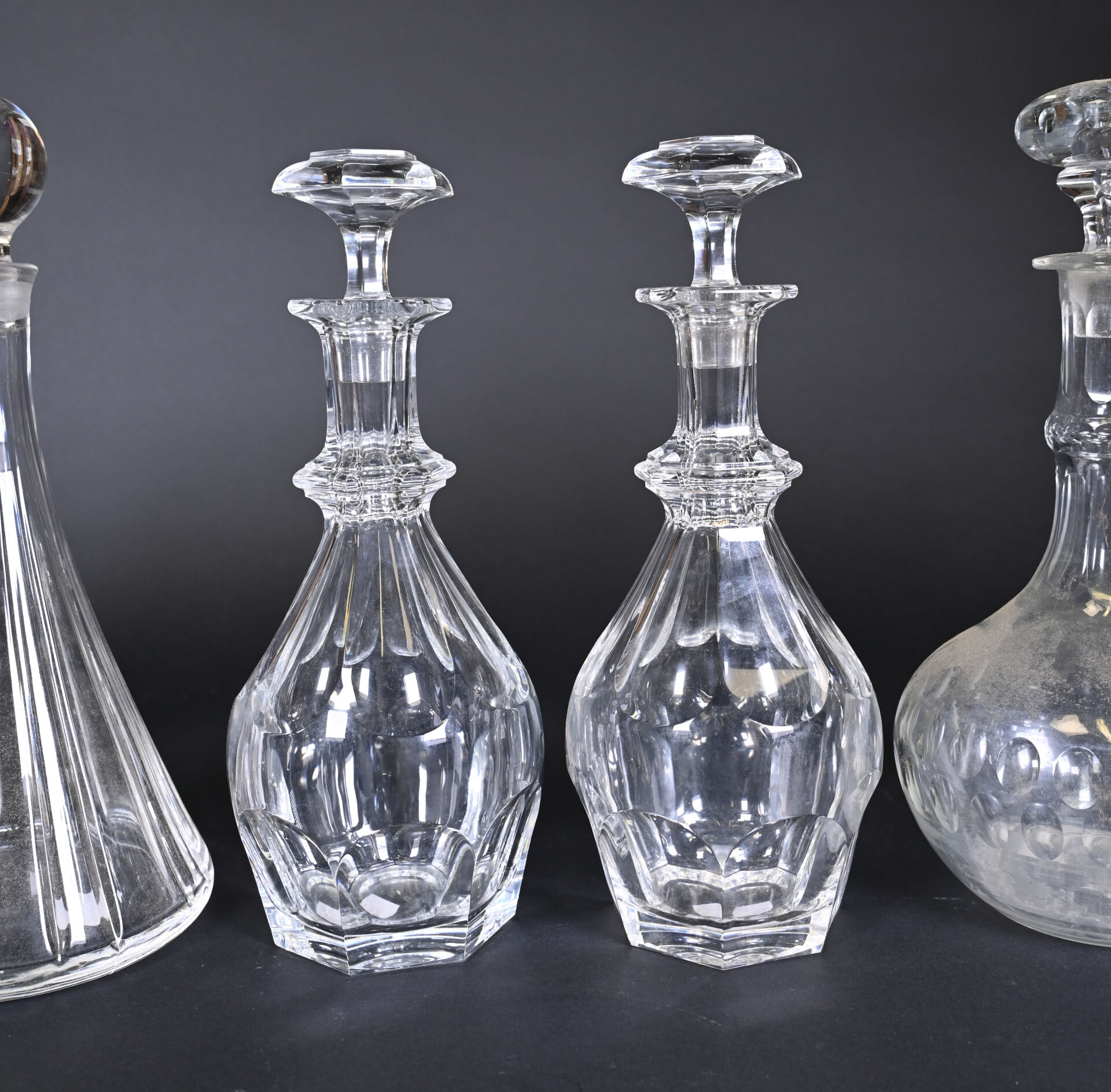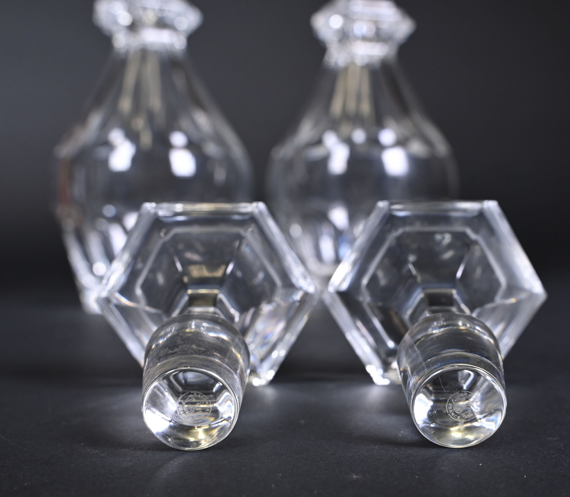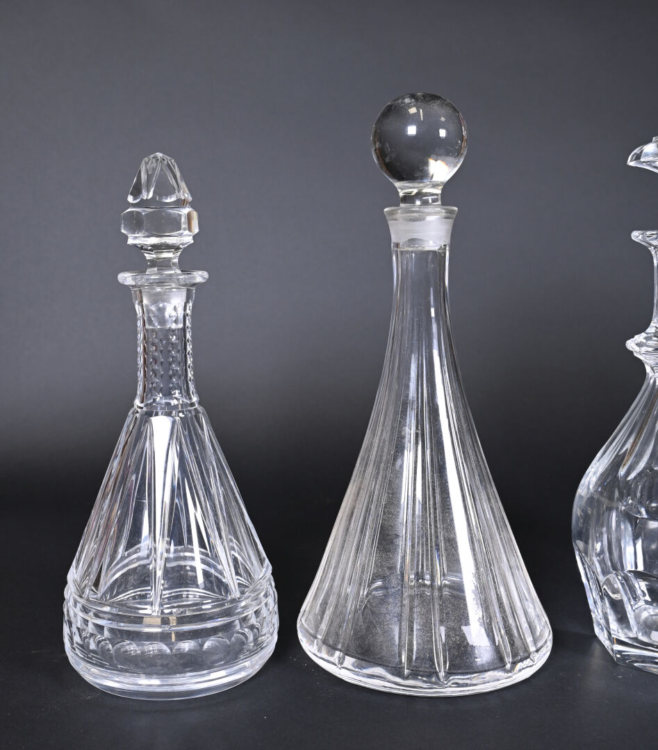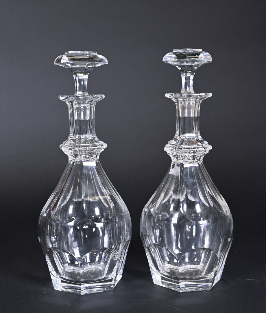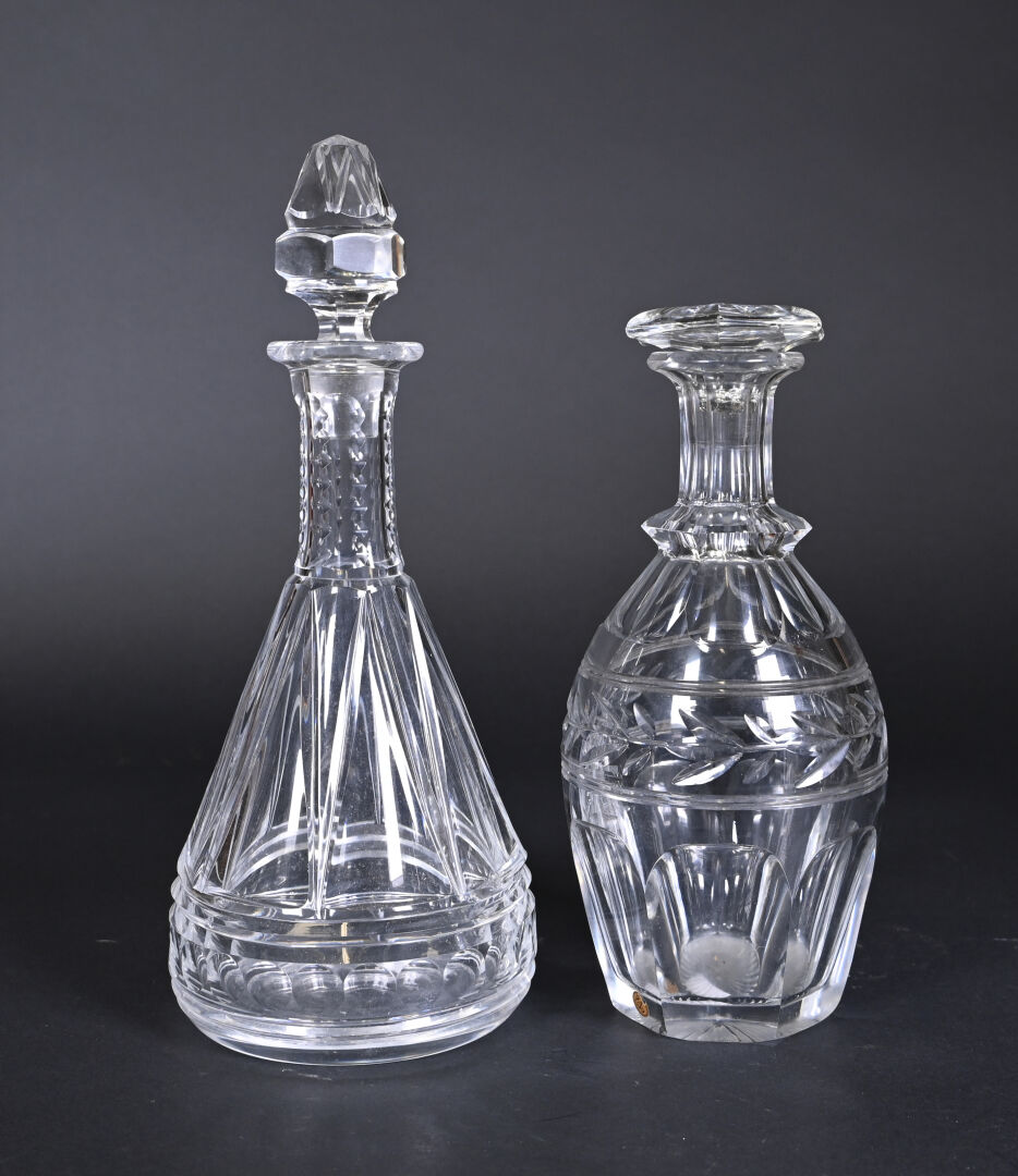 Six carafes en cristal taillé dont deux BACCARAT (un accident à un bouchon d’une carafe non signée, les deux Baccarat avec leurs bouchons). Haut. d’une Baccarat : 31 cm avec bouchon.