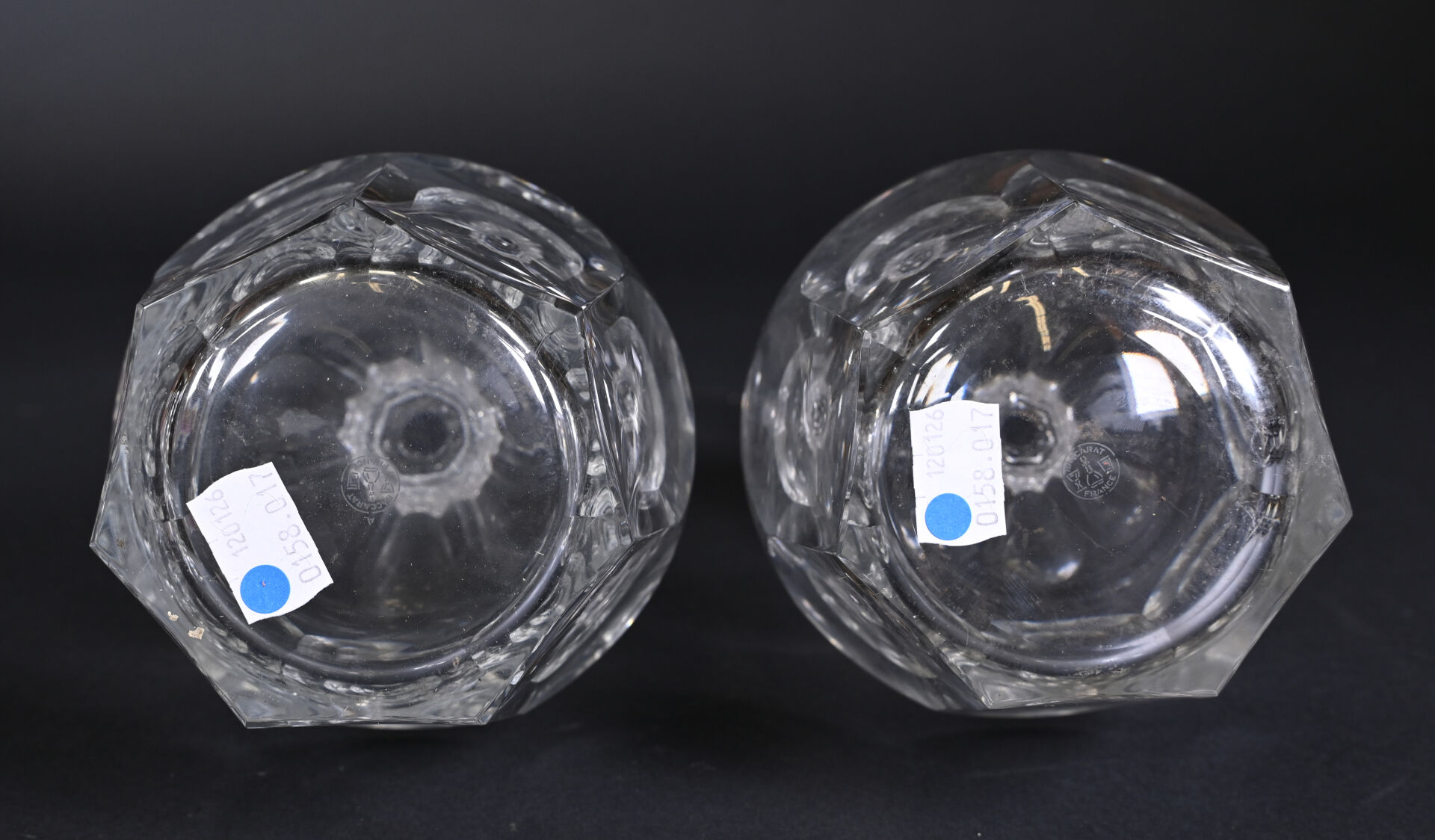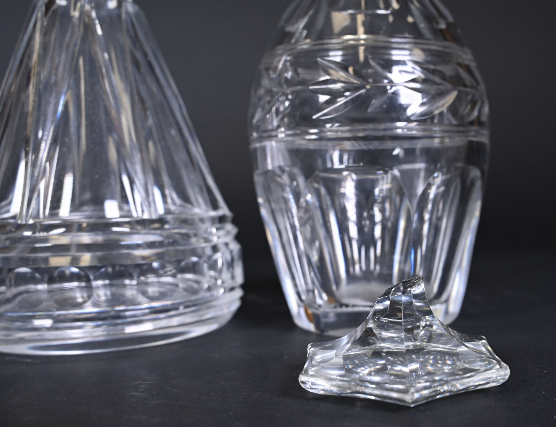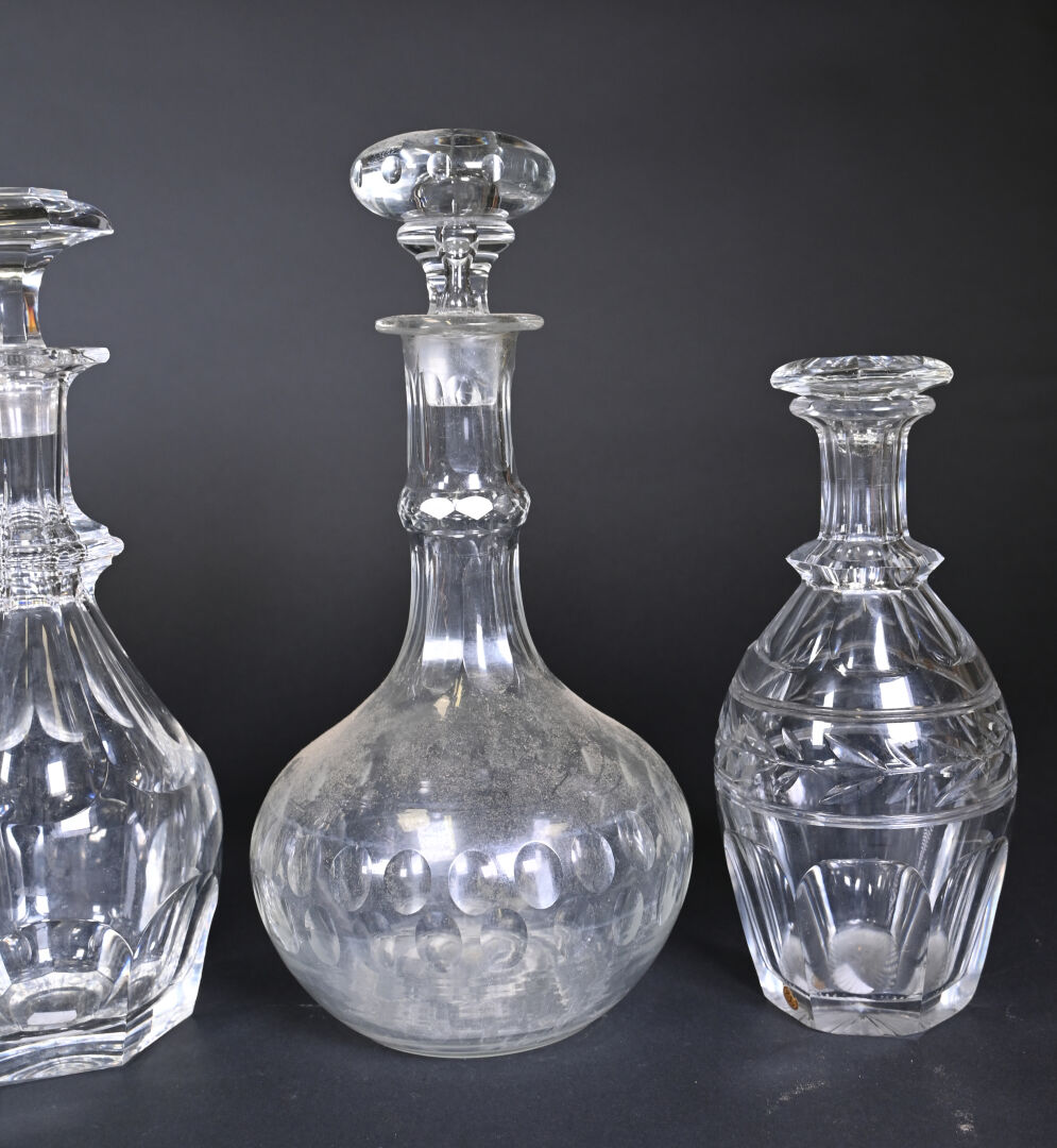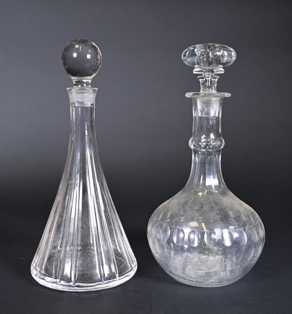 Six carafes en cristal taillé dont deux BACCARAT (un accident à un bouchon d’une carafe non signée, les deux Baccarat avec leurs bouchons). Haut. d’une Baccarat : 31 cm avec bouchon.