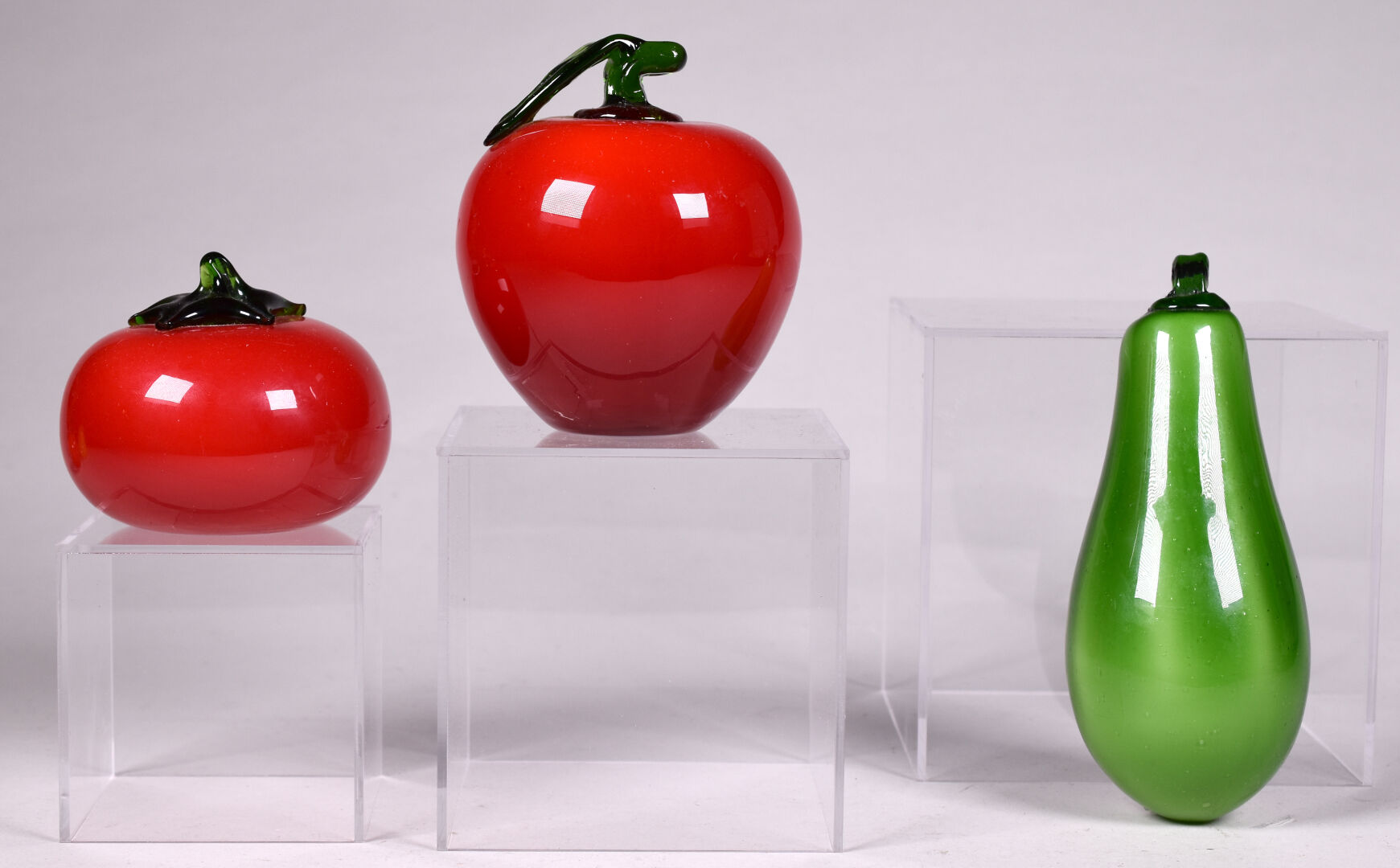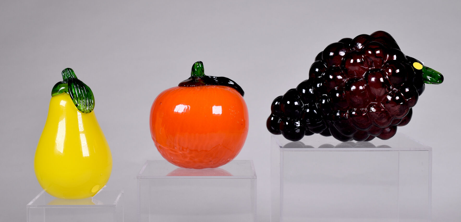 Six fruits et légumes en verre de Murano soit une courgette, une tomate, une poire, un kaki, une pomme et une grappe de raisin.