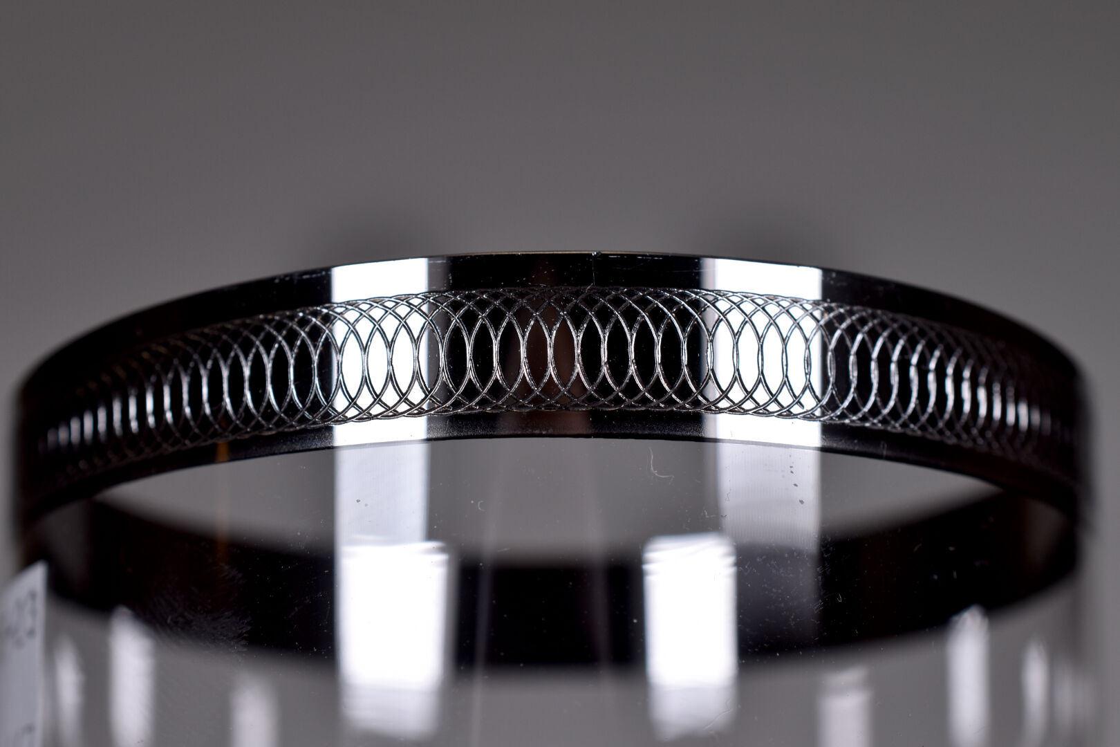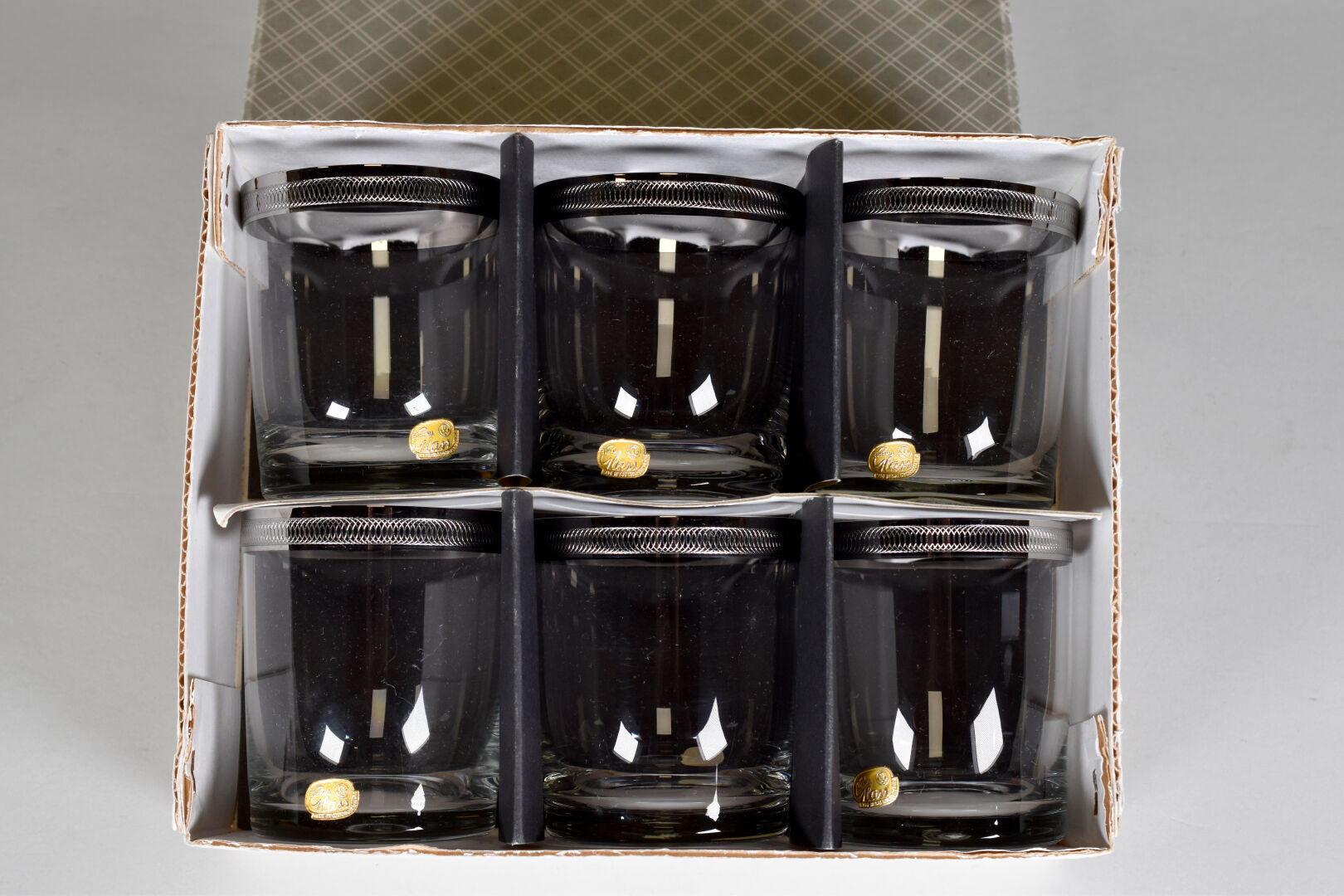 Six verres en cristalo, la bordure argentée. Haut. : 9,5 cm. Boite.